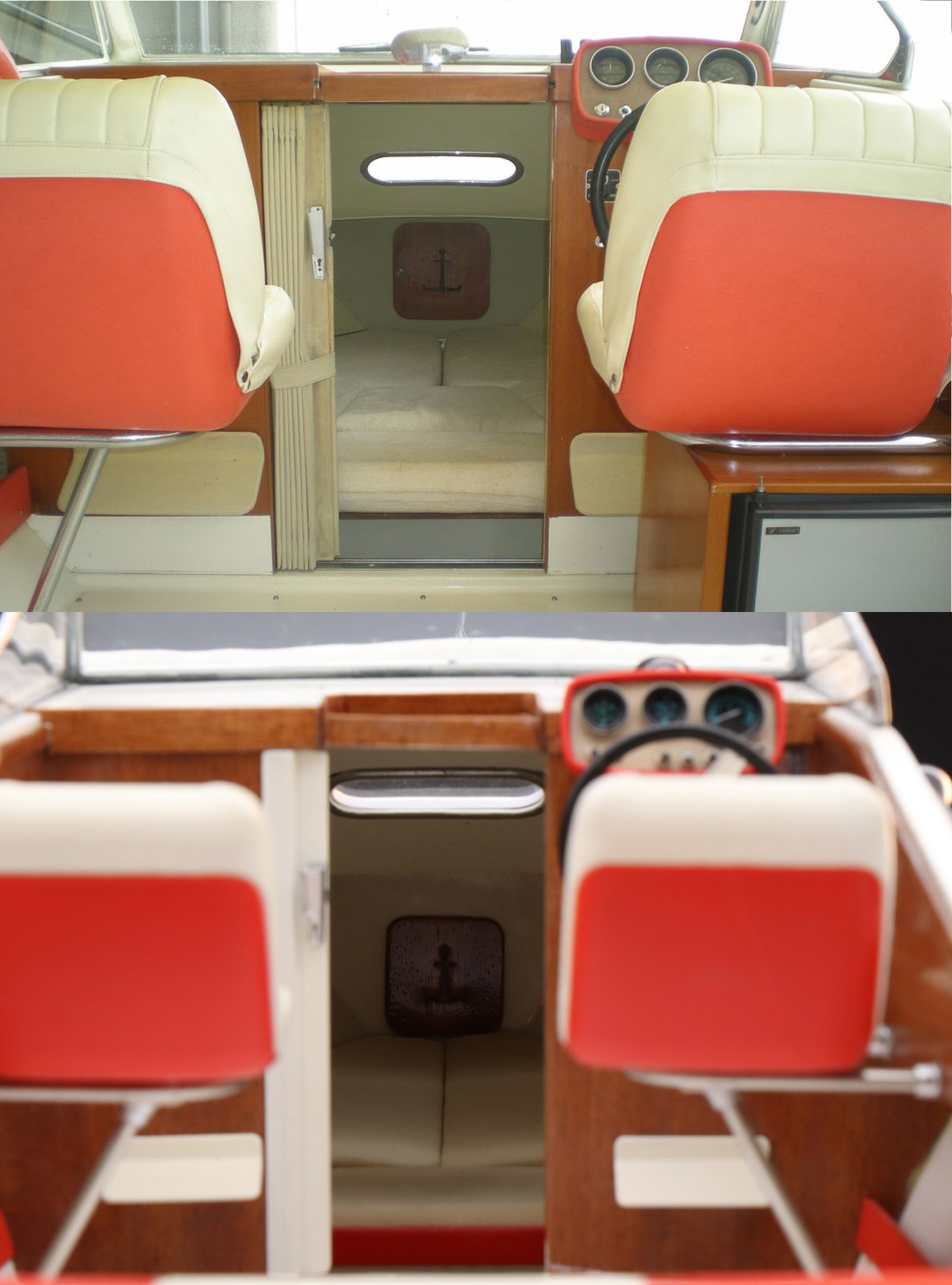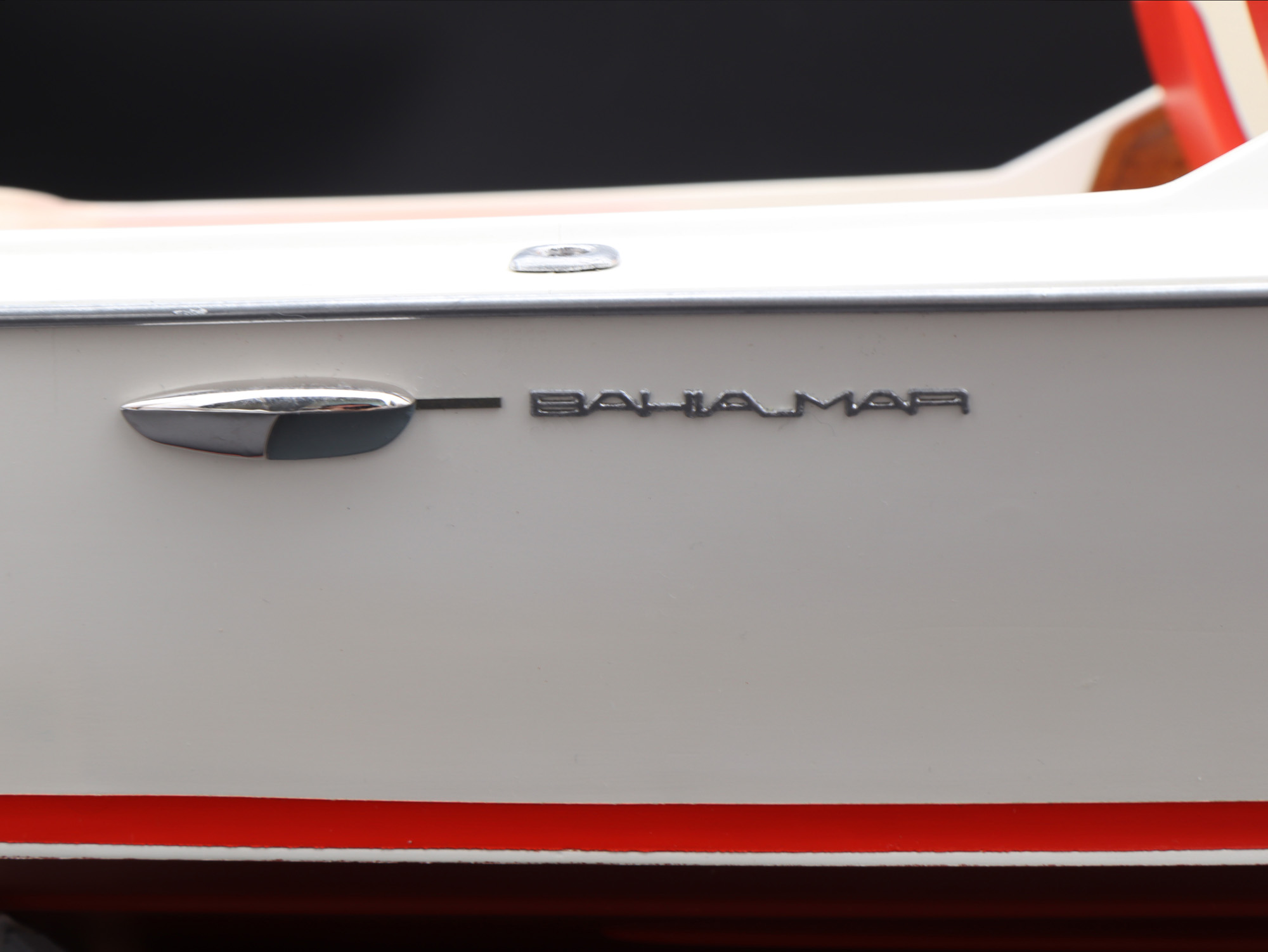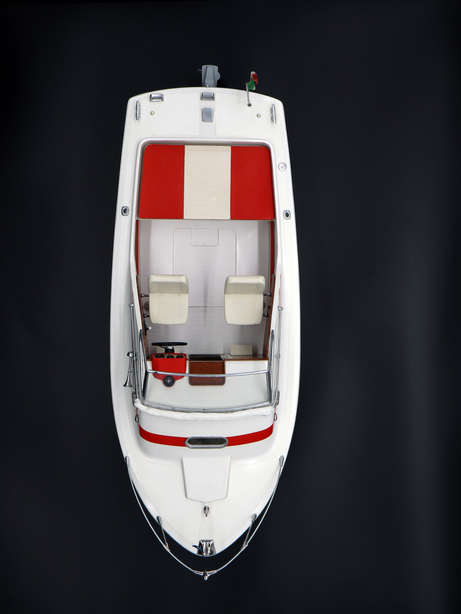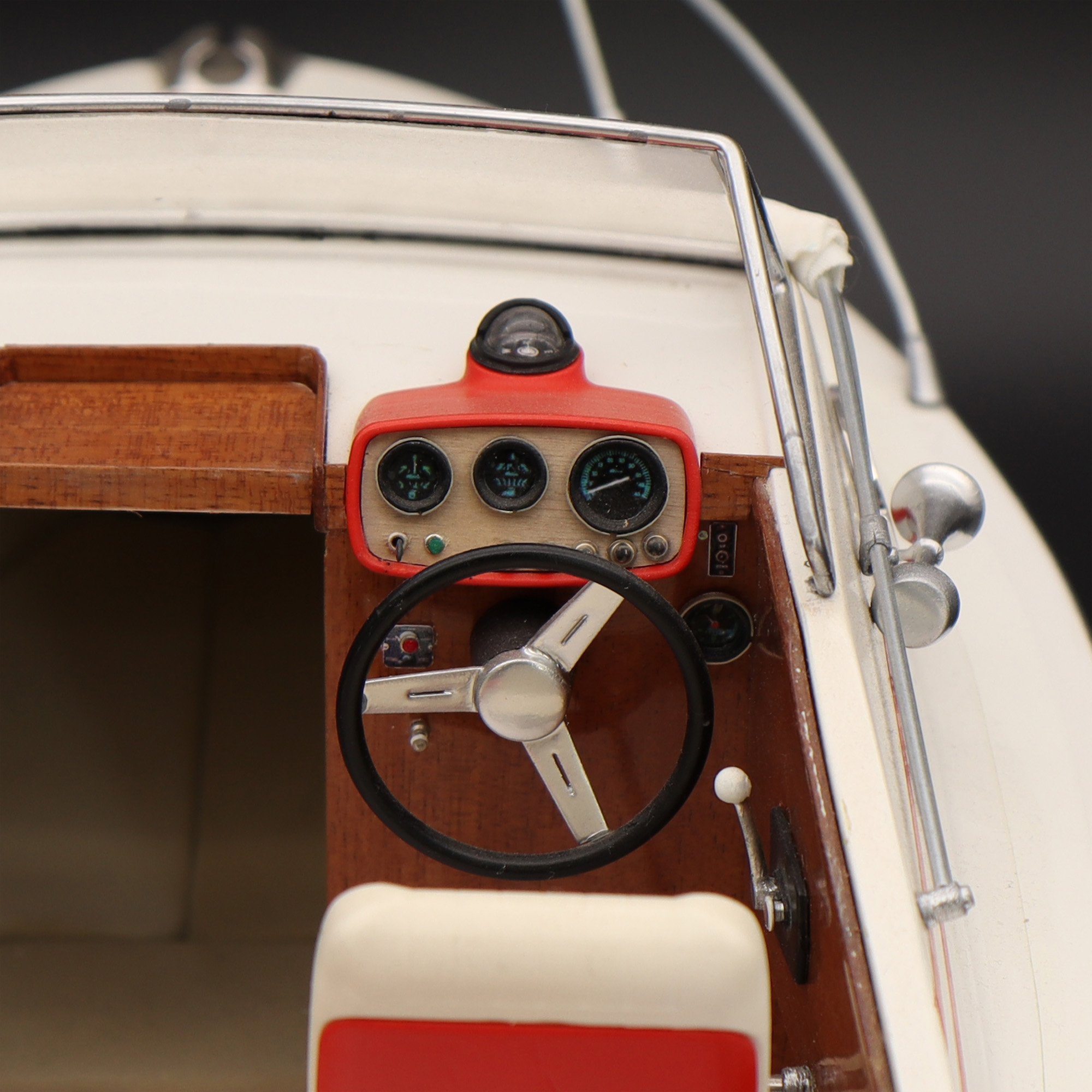 The model of the outdrive leg, always by Volvo Penta, was changed on certain versions starting with # 72. The instrumentation consisted of three VDO dials, whose design was a development of those designed for the 1962 Aquarama. Redesigned in this way they were to be subsequently fitted to the Aquarama Special and the Olympic. The Barilani designed wheel, with three aluminium spokes, was of Momo manufacture.