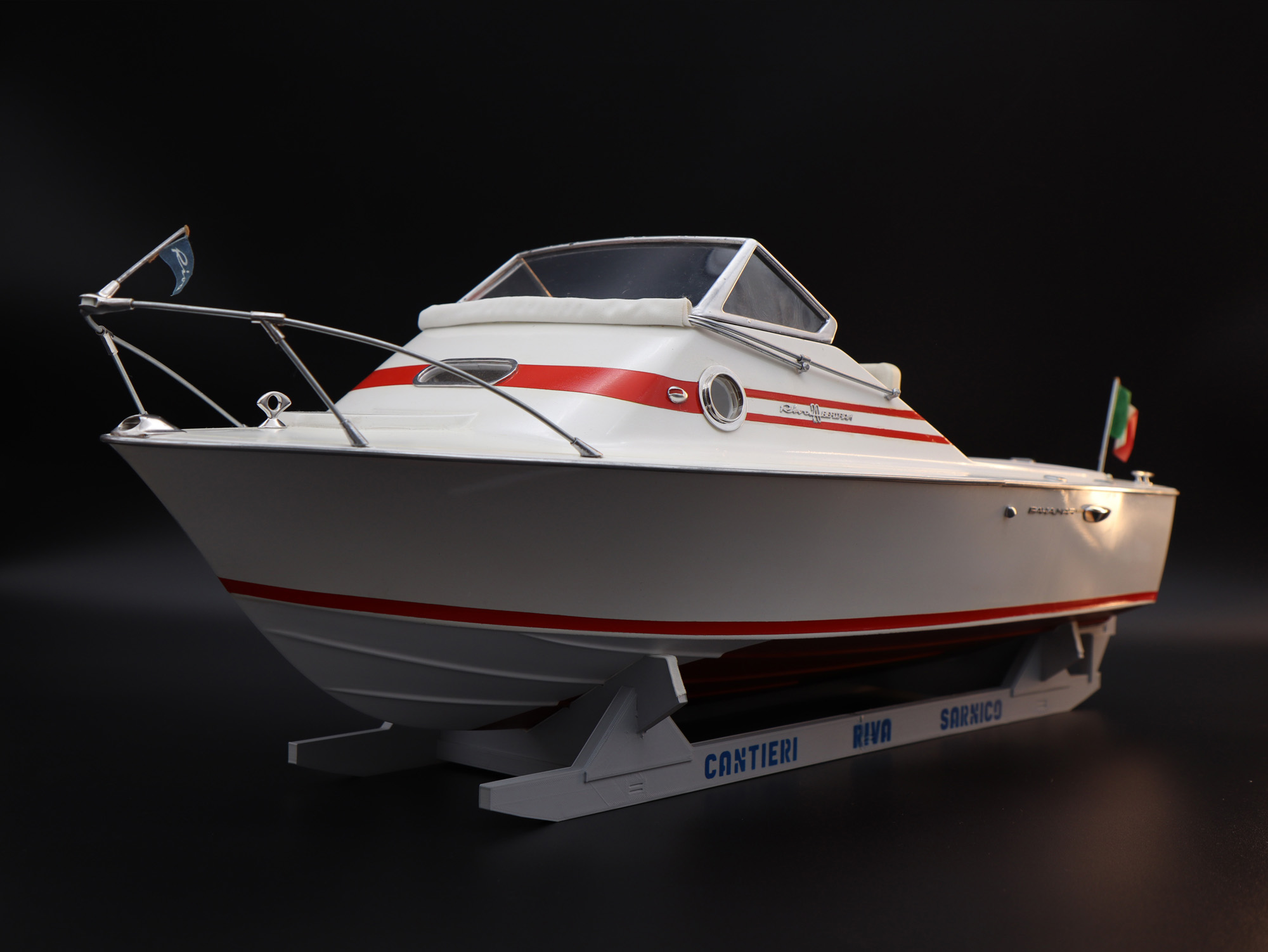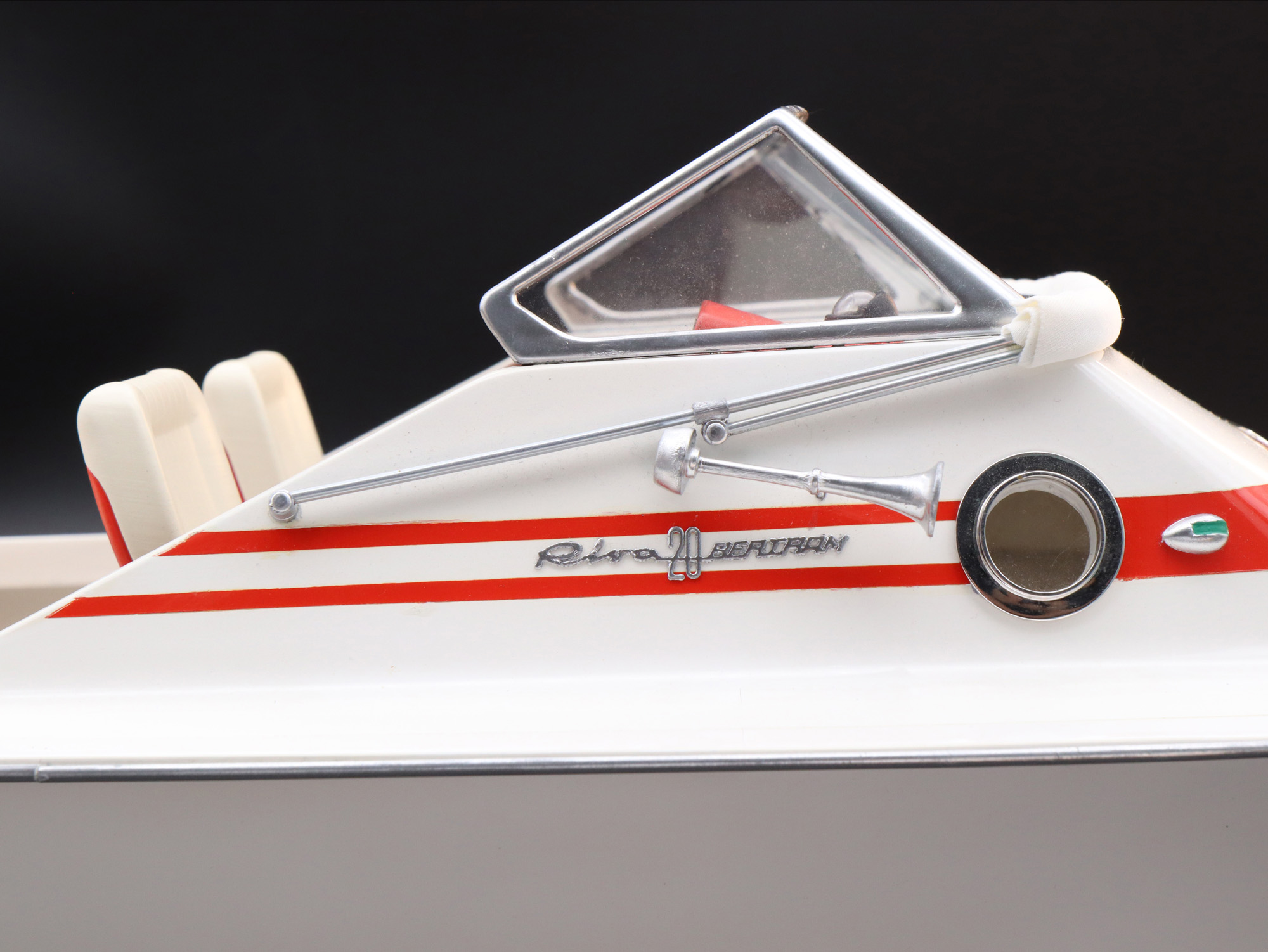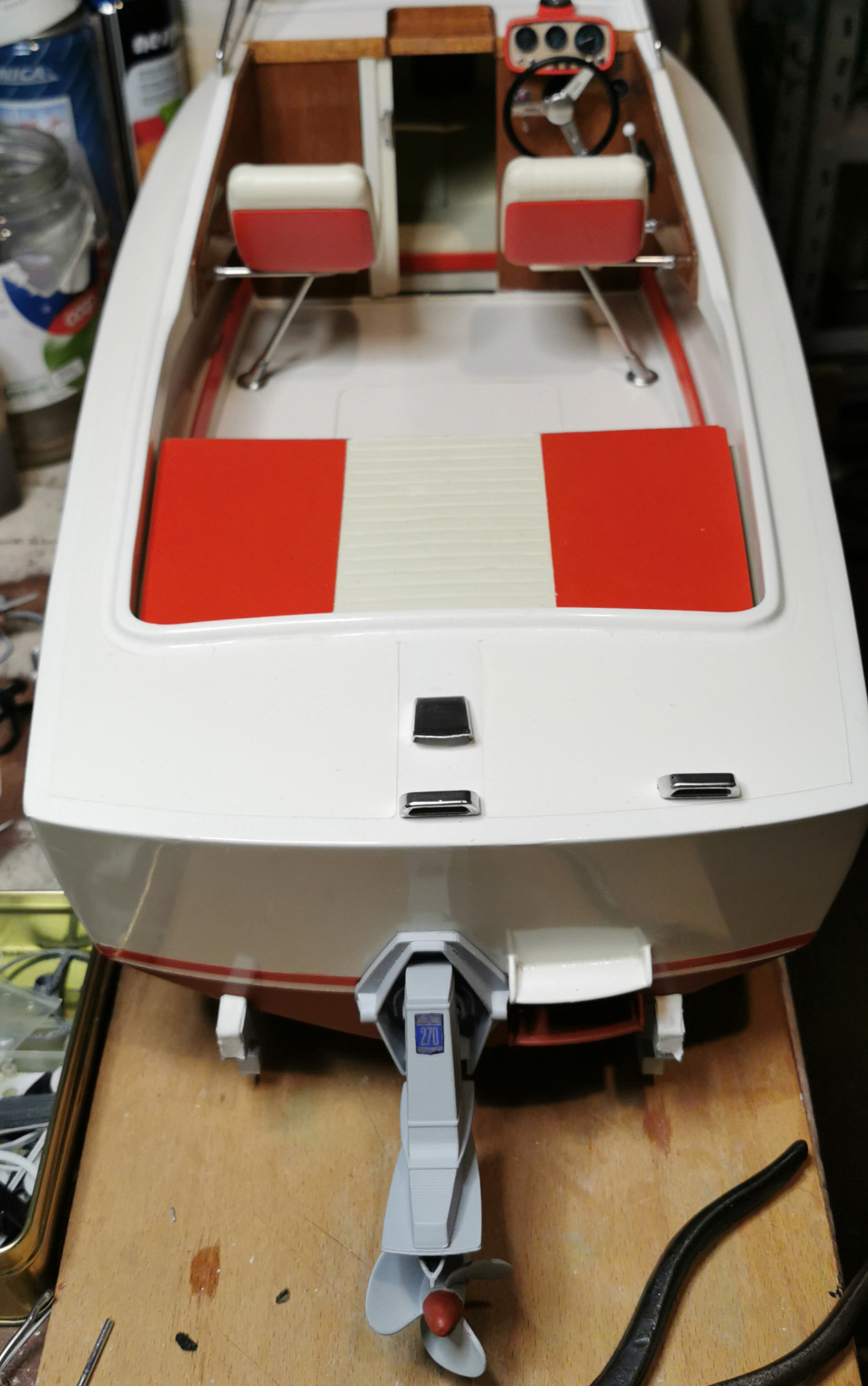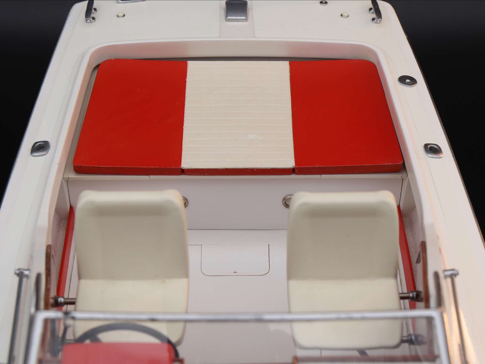 The model of the outdrive leg, always by Volvo Penta, was changed on certain versions starting with # 72. The instrumentation consisted of three VDO dials, whose design was a development of those designed for the 1962 Aquarama. Redesigned in this way they were to be subsequently fitted to the Aquarama Special and the Olympic. The Barilani designed wheel, with three aluminium spokes, was of Momo manufacture.
