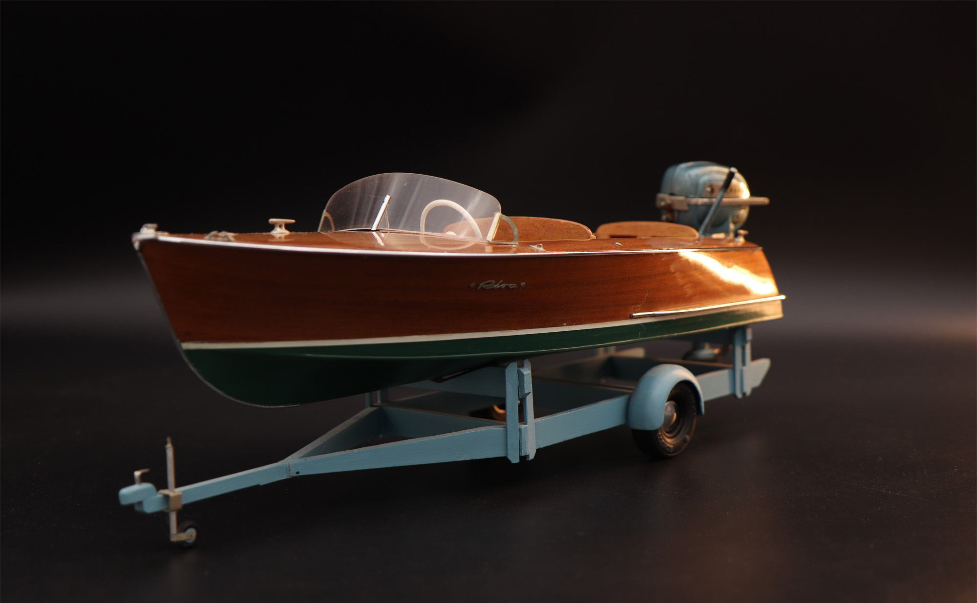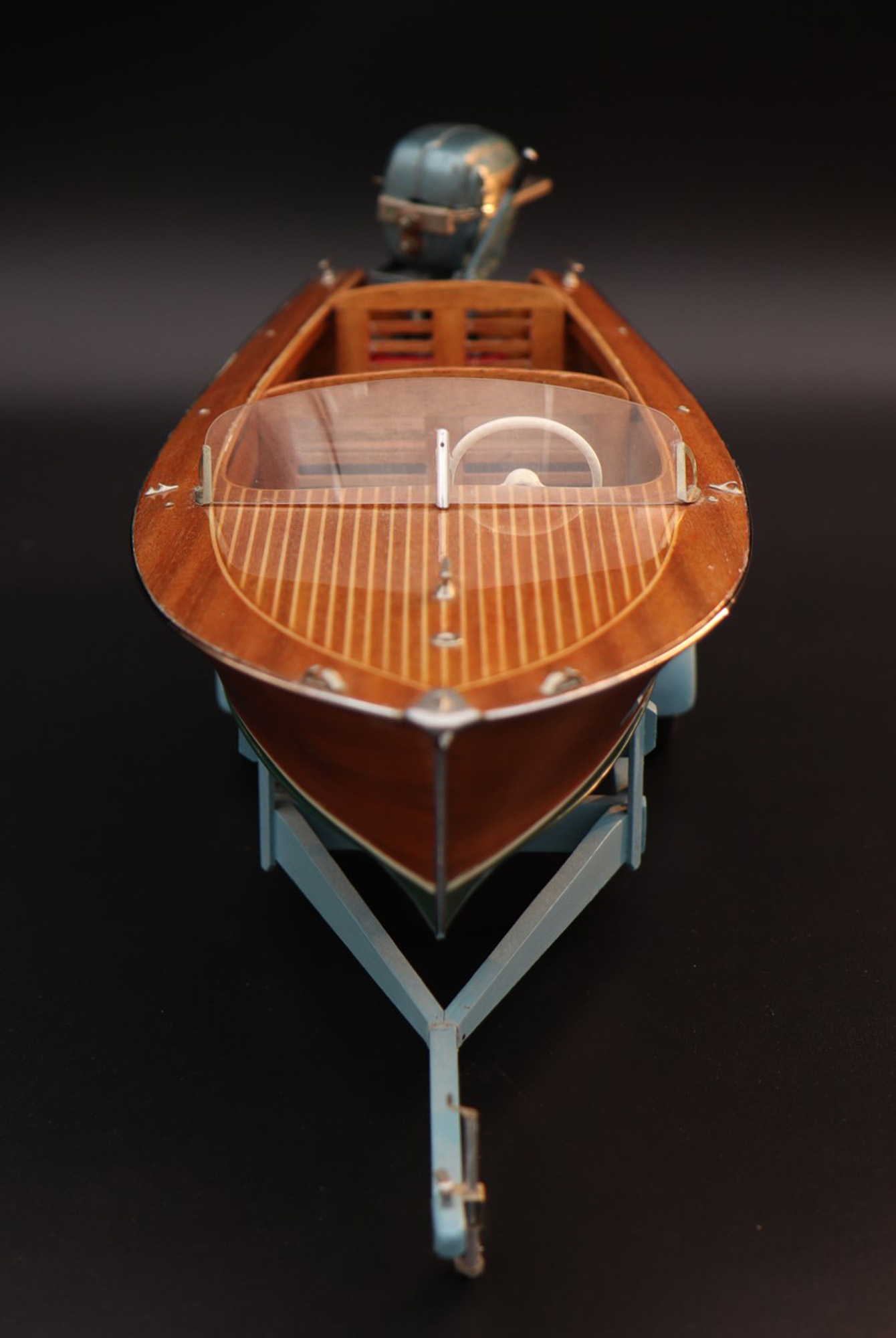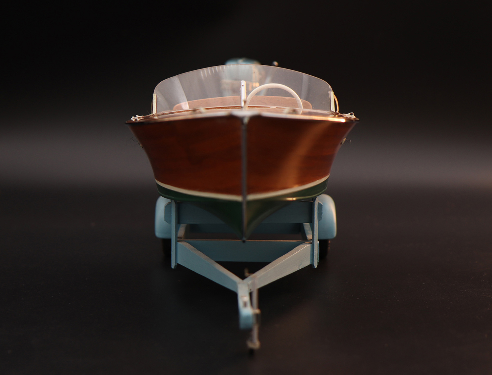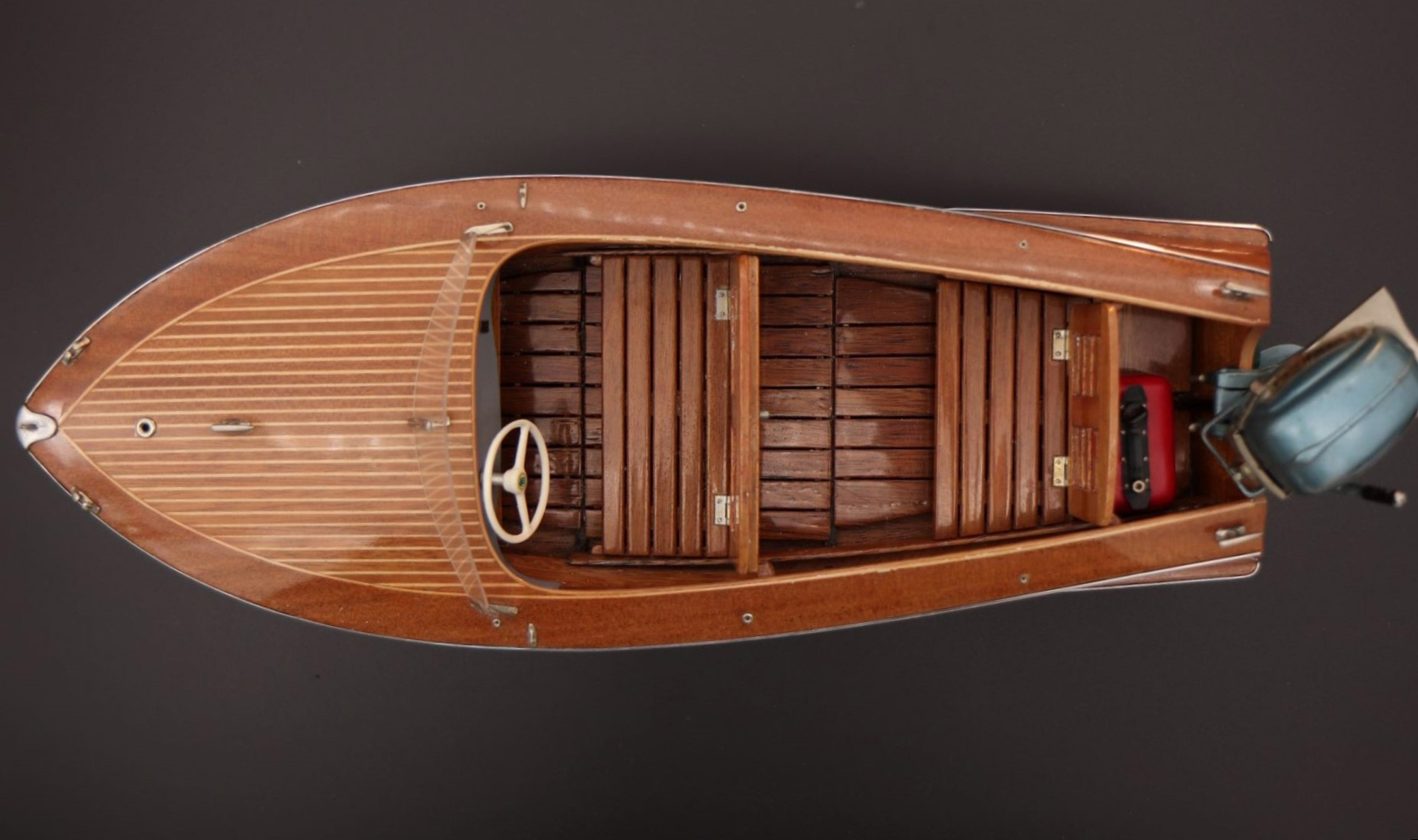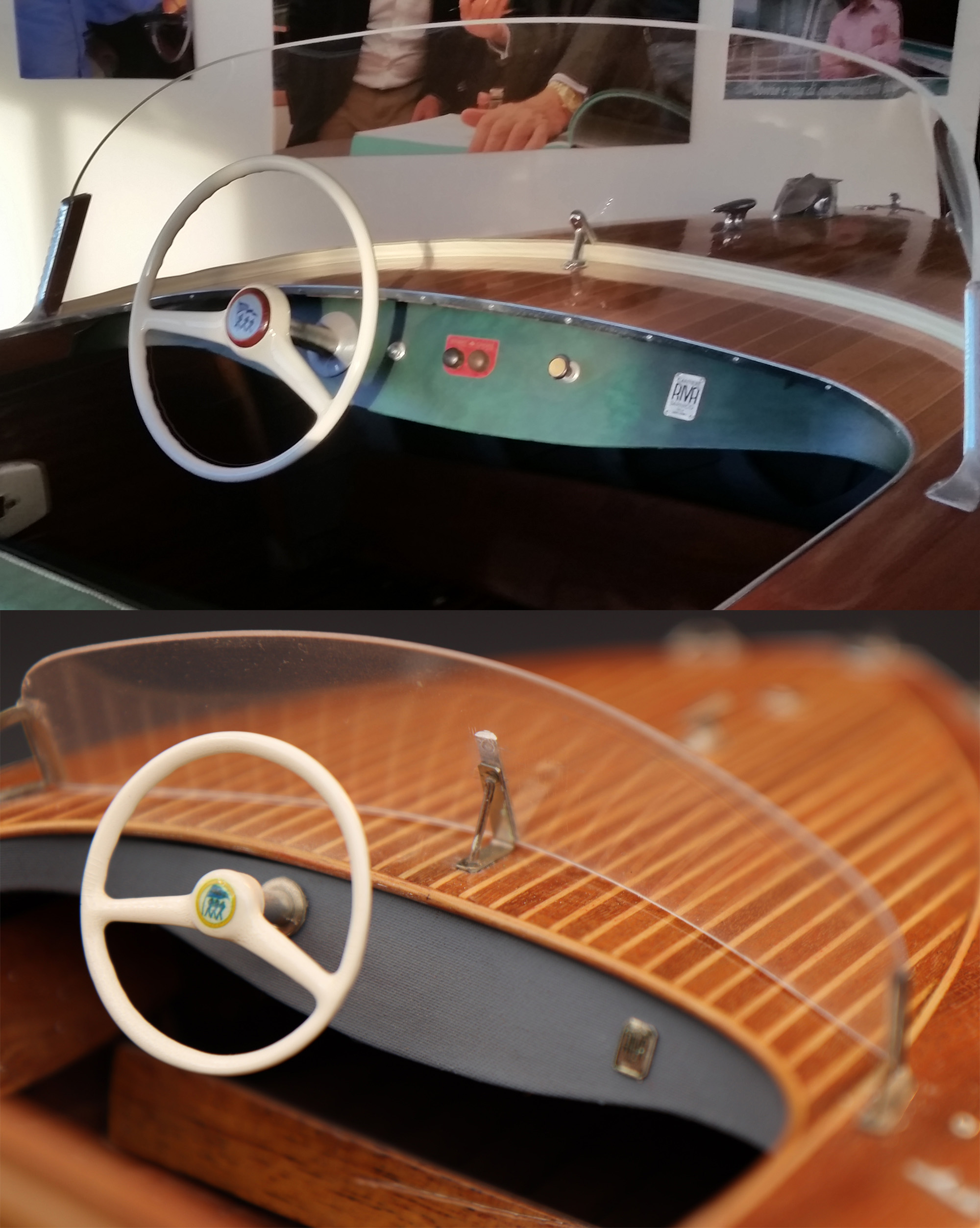 This is an outboard boat which was called model AV drawing # 43 in 1950, and was offered with a choice of engines, both as regards brand and power. From 1953 it was only available with the Evinrude 25 Hp. It is typified by the hull bottom which extends beyond the transom and by a control box designed by Carlo Riva. The windscreen was of plastic without a rim, the dashboard covered in dark green vinyl and the wheel, of Fiat derivation, had the print of the three little sailors in the centre. It has two rows of seats made of mahogany slats, as is the cockpit sole. The stern is undecked and the toolbox is behind the second row of seats. A wrap-around windscreen, still without a rim, was fitted to the 1955 series.