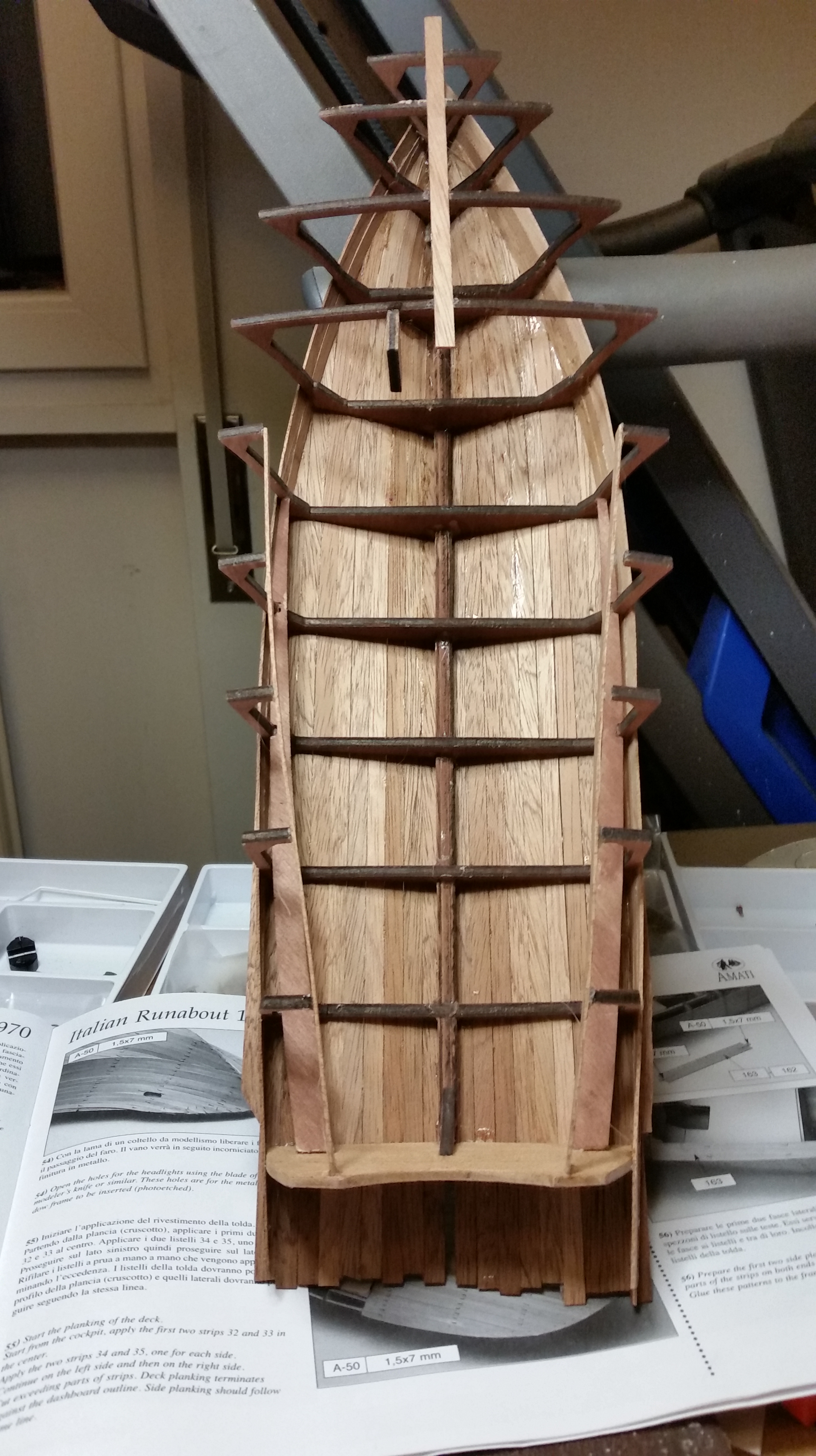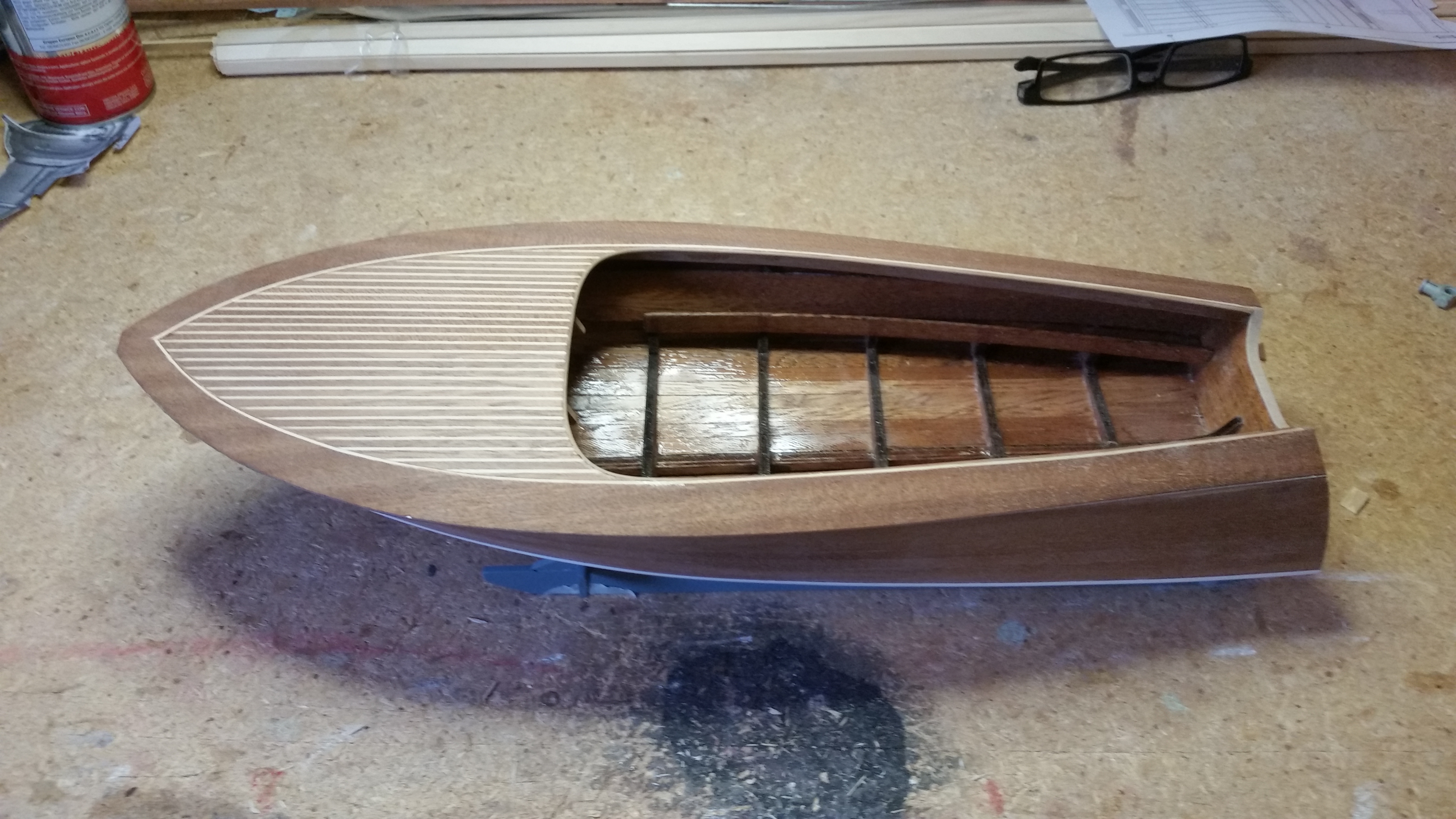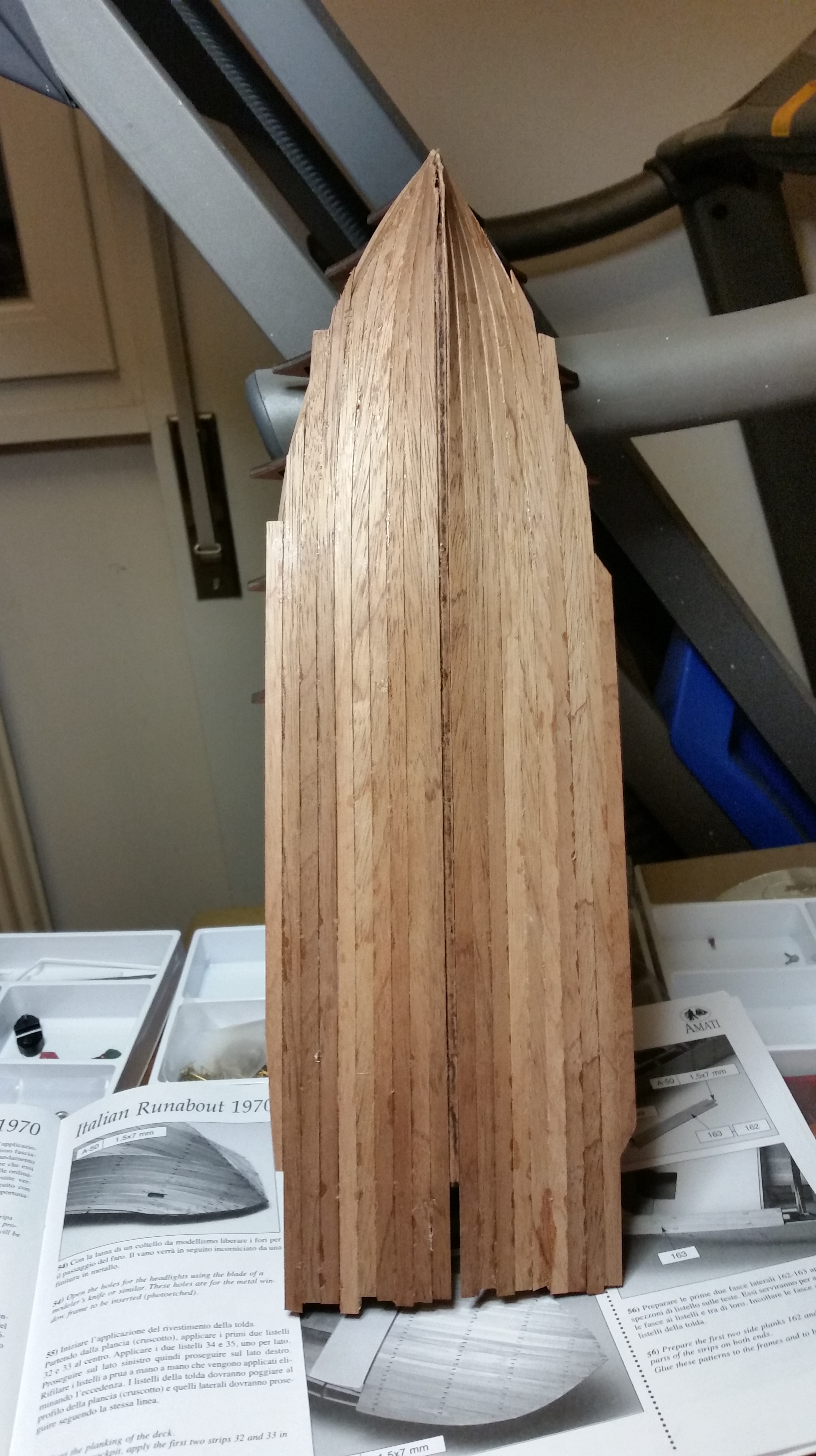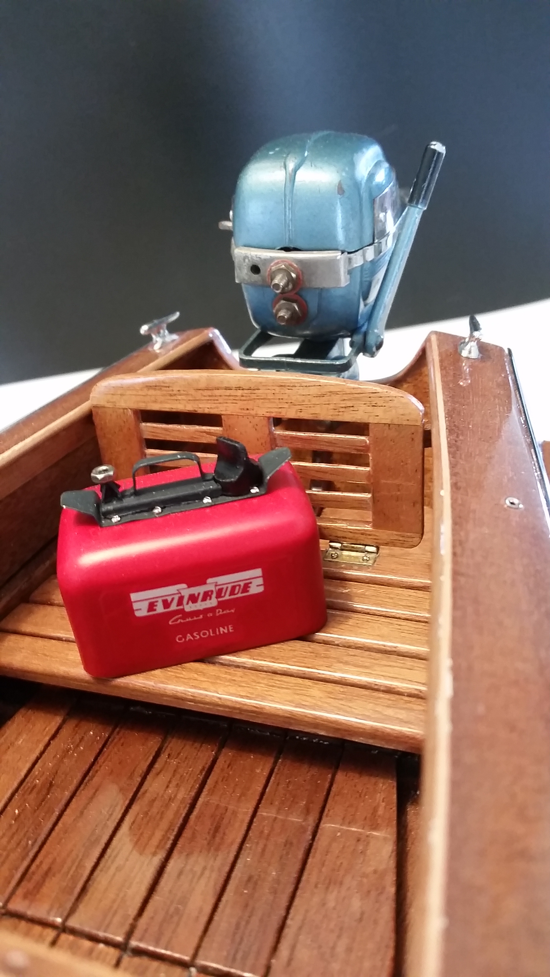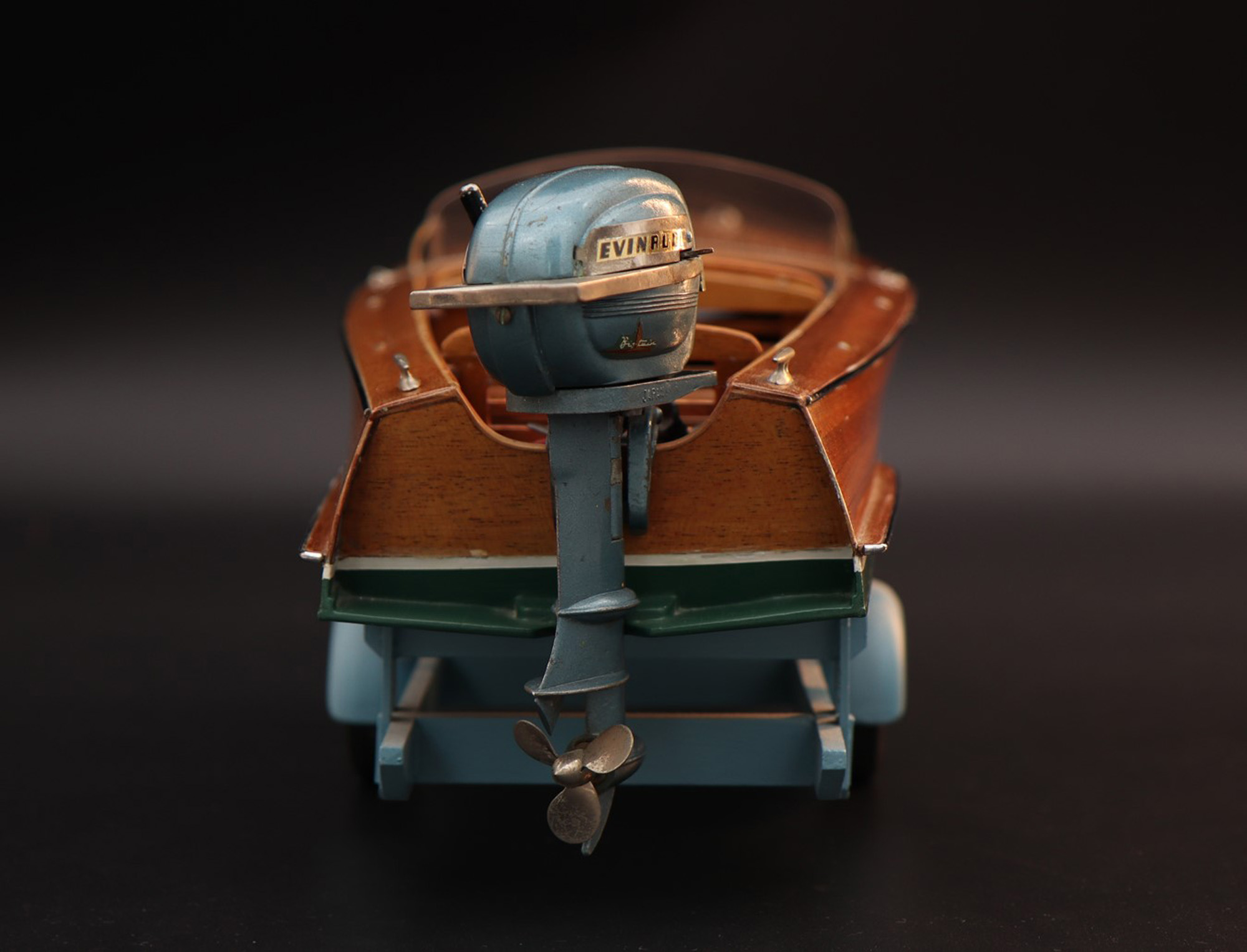 This is an outboard boat which was called model AV drawing # 43 in 1950, and was offered with a choice of engines, both as regards brand and power. From 1953 it was only available with the Evinrude 25 Hp. It is typified by the hull bottom which extends beyond the transom and by a control box designed by Carlo Riva. The windscreen was of plastic without a rim, the dashboard covered in dark green vinyl and the wheel, of Fiat derivation, had the print of the three little sailors in the centre. It has two rows of seats made of mahogany slats, as is the cockpit sole. The stern is undecked and the toolbox is behind the second row of seats. A wrap-around windscreen, still without a rim, was fitted to the 1955 series.