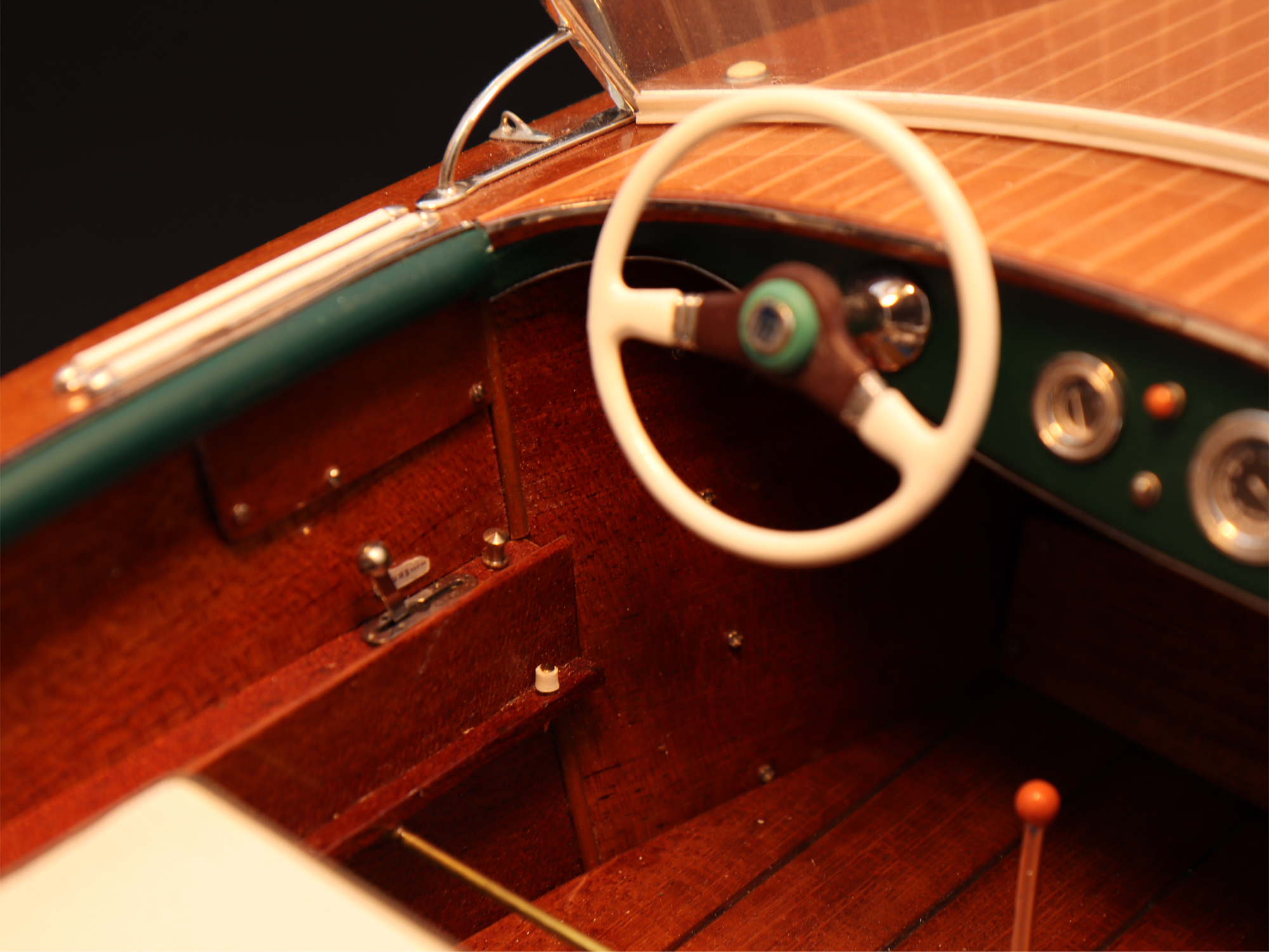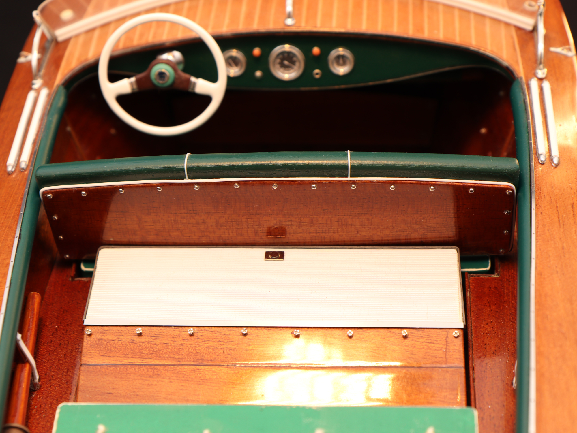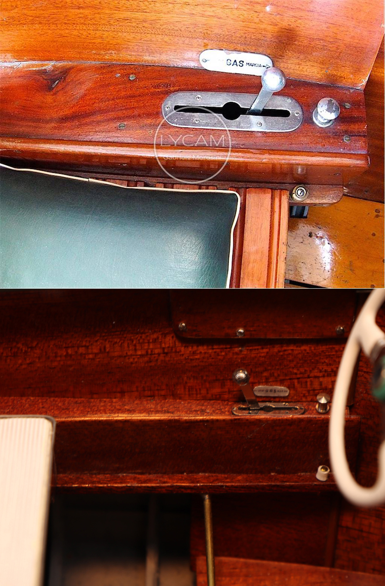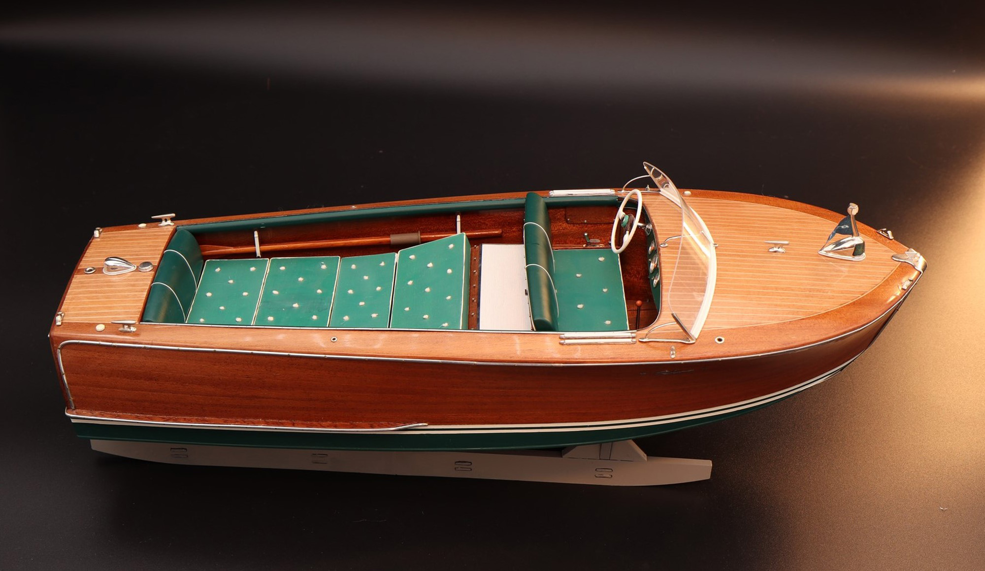 This was the first boat designed exclusively for series production using a 60 Hp Chris-Craft engine. It was built using Honduras mahogany planking throughout. It was originally made with a two-part frameless glass windscreen, dark green vinyl dashboard and seating, an article holder under the deck and a green fabric sunbed. From the 1953 series the inner panels were lined with padded green vinyl and the windscreen was in a single piece. The number of frames was increased in 1955 and their centre distance set at 16 cm. A new steering box made of bronze with stainless steel parts and a Monel propeller shaft were fitted. The side planking was installed with the aid of adhesives. The bottom was fitted using corrosion resistant Phillips cross-head screws. From # 98, at the end of 1956, the bottom was a single piece of plywood and, from 101, the decking was also made of plywood, with inlaid veneers. The 1957 series is also typified by the wrap-around glass windscreen.