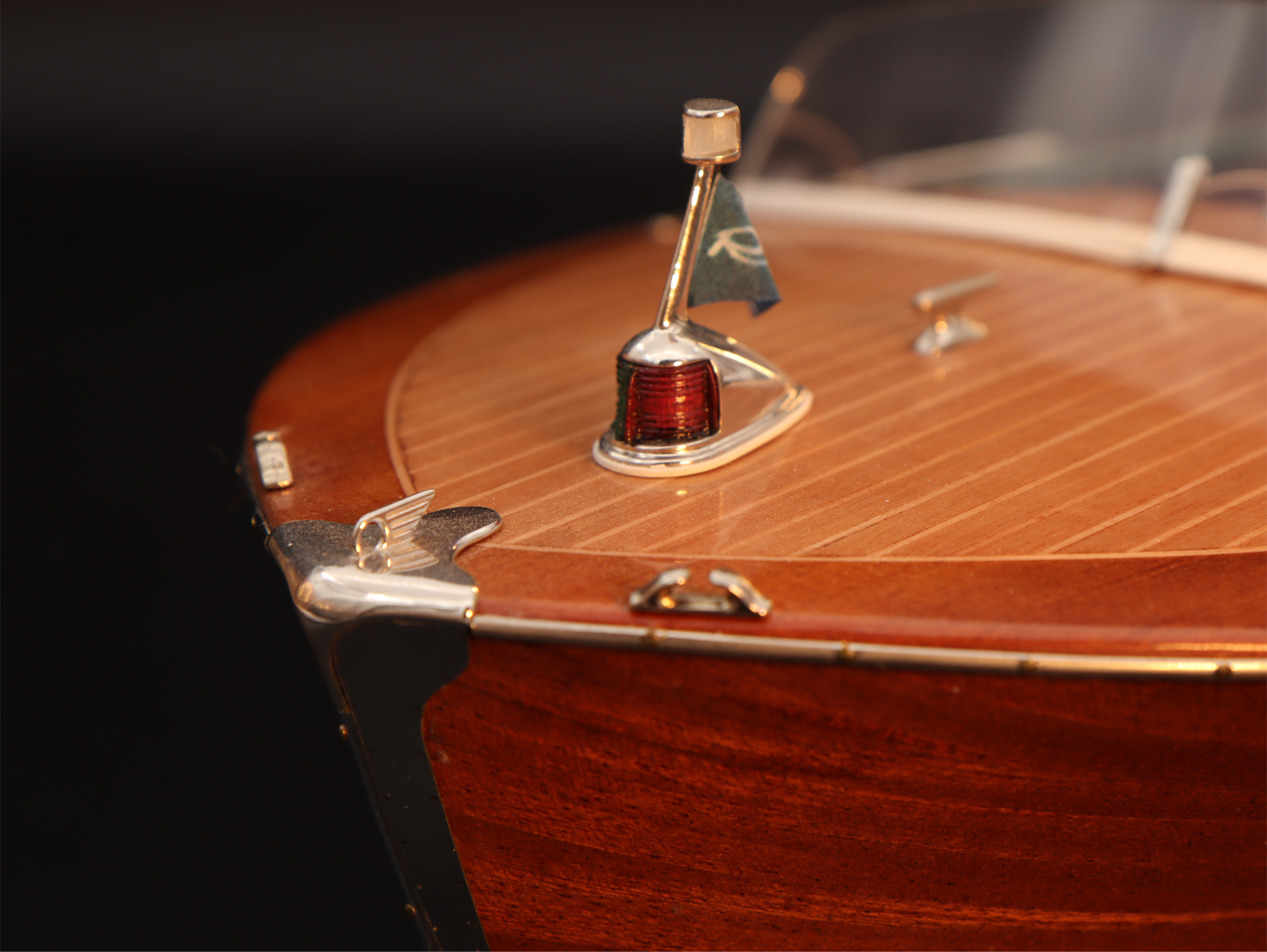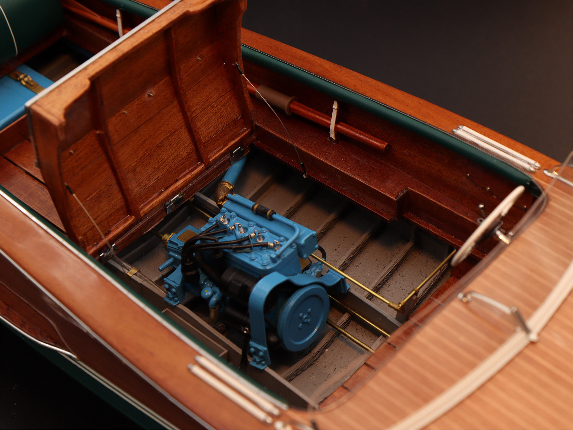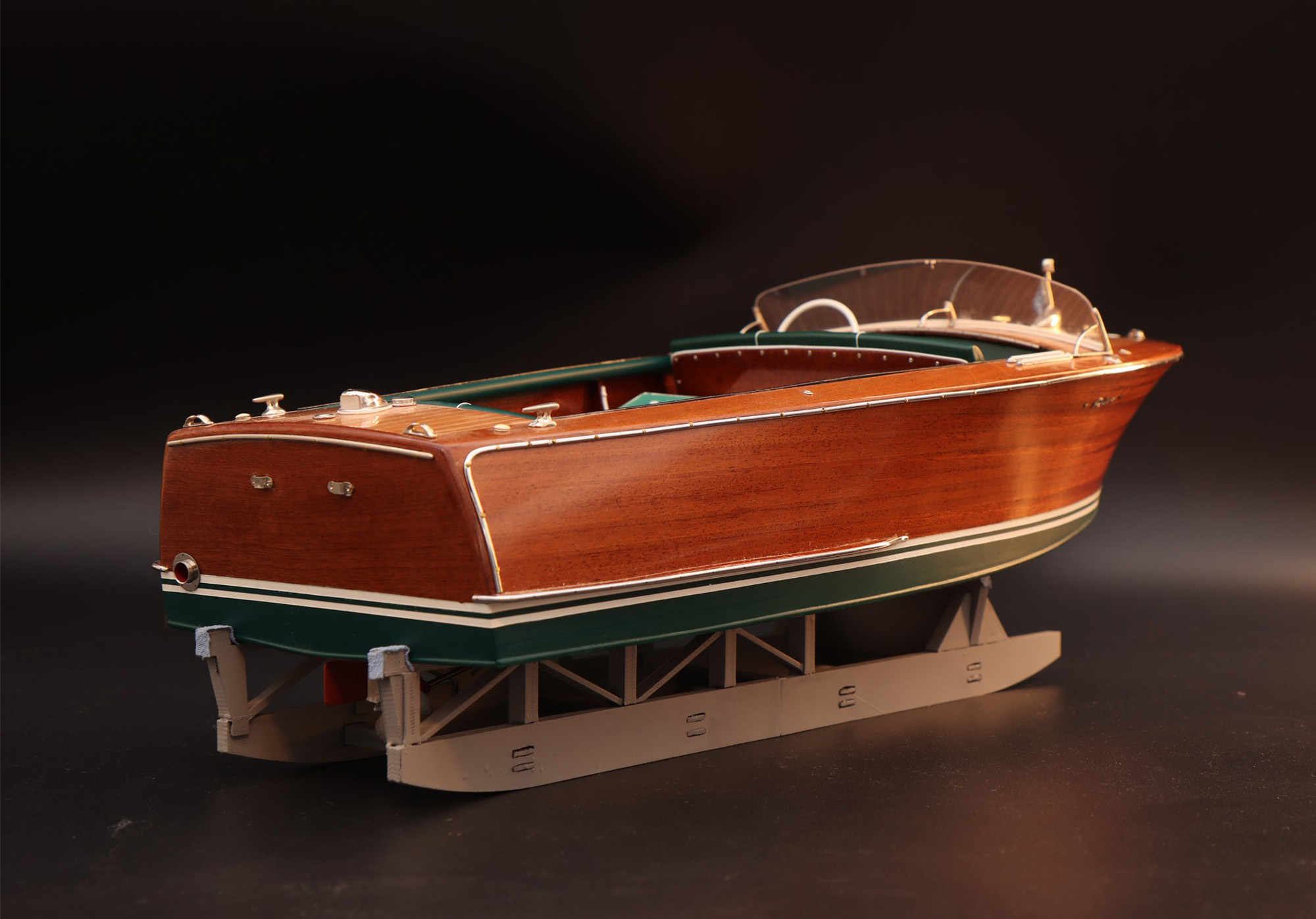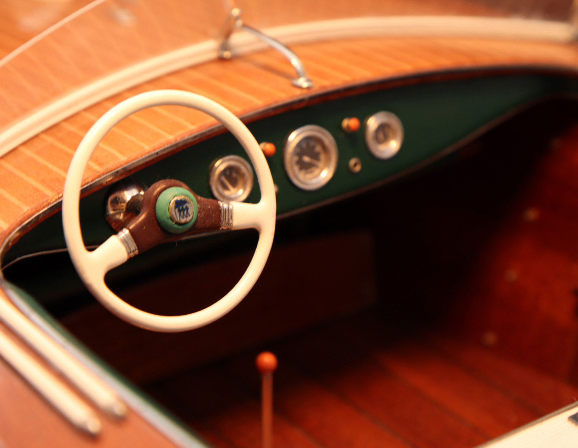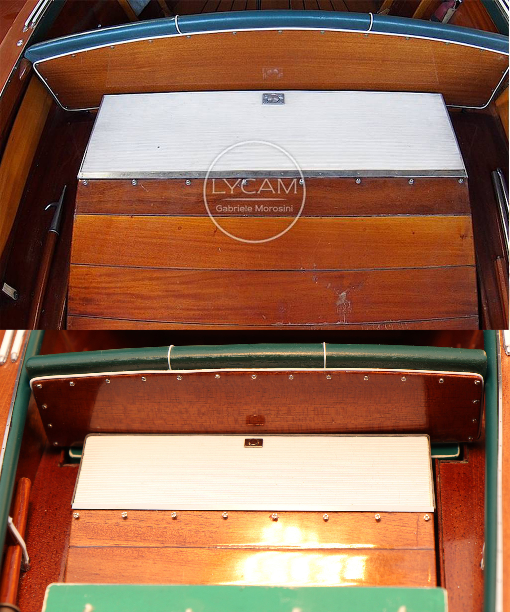 This was the first boat designed exclusively for series production using a 60 Hp Chris-Craft engine. It was built using Honduras mahogany planking throughout. It was originally made with a two-part frameless glass windscreen, dark green vinyl dashboard and seating, an article holder under the deck and a green fabric sunbed. From the 1953 series the inner panels were lined with padded green vinyl and the windscreen was in a single piece. The number of frames was increased in 1955 and their centre distance set at 16 cm. A new steering box made of bronze with stainless steel parts and a Monel propeller shaft were fitted. The side planking was installed with the aid of adhesives. The bottom was fitted using corrosion resistant Phillips cross-head screws. From # 98, at the end of 1956, the bottom was a single piece of plywood and, from 101, the decking was also made of plywood, with inlaid veneers. The 1957 series is also typified by the wrap-around glass windscreen.