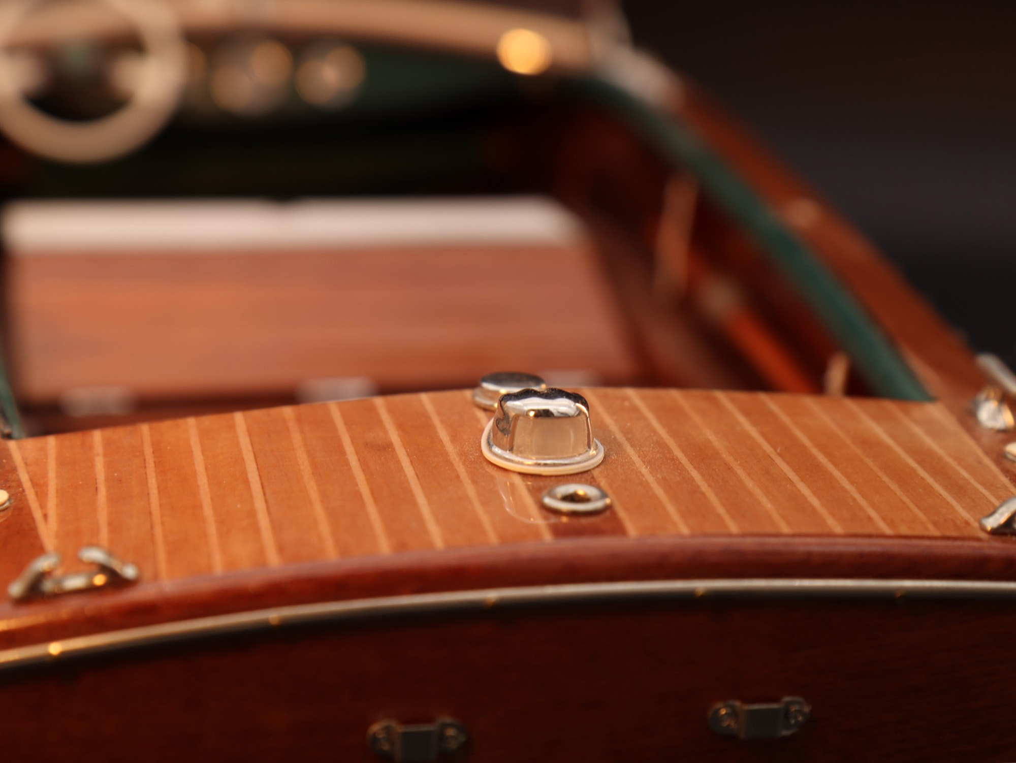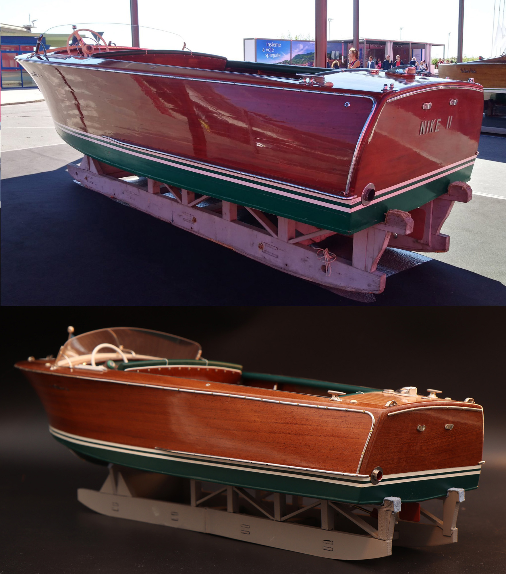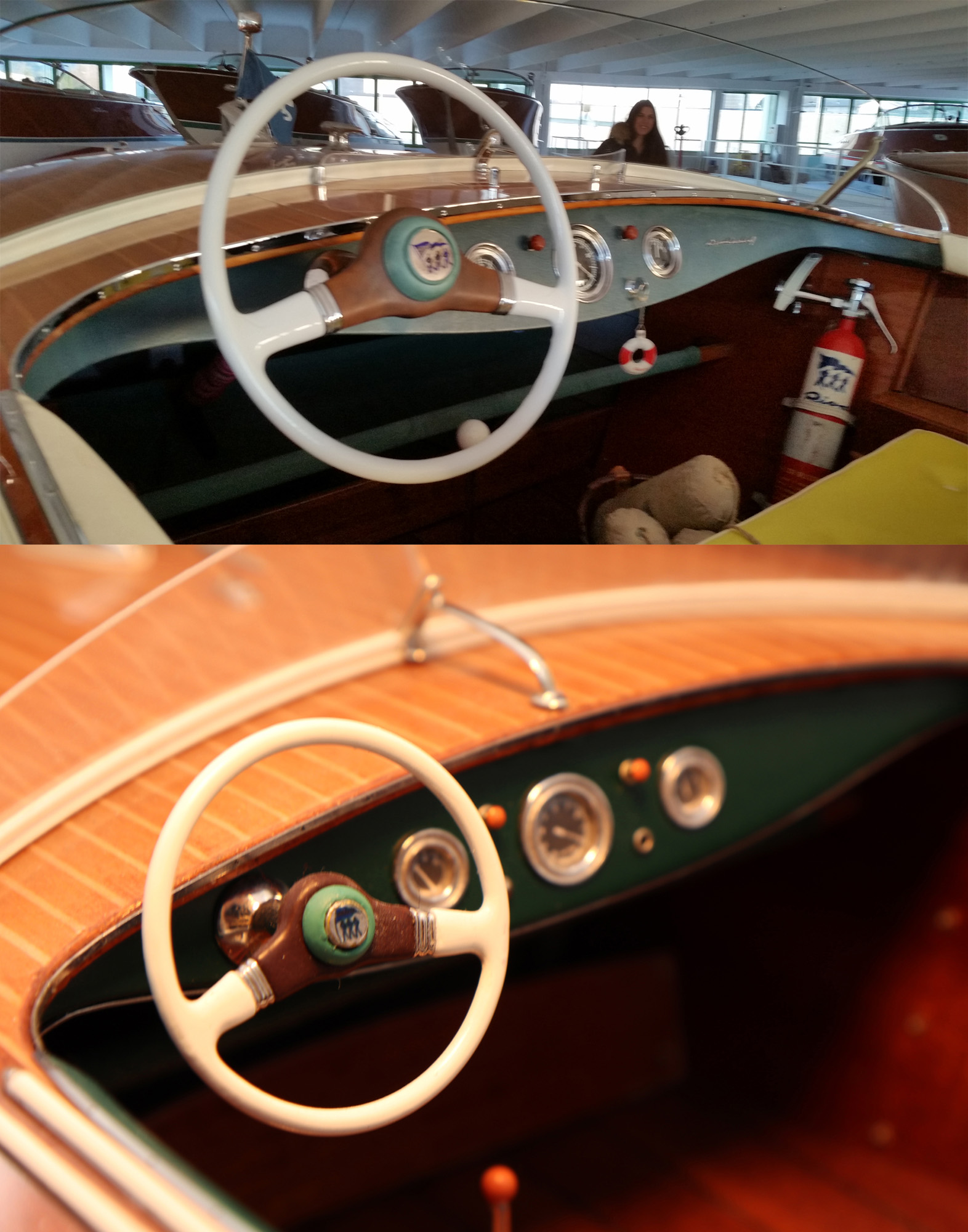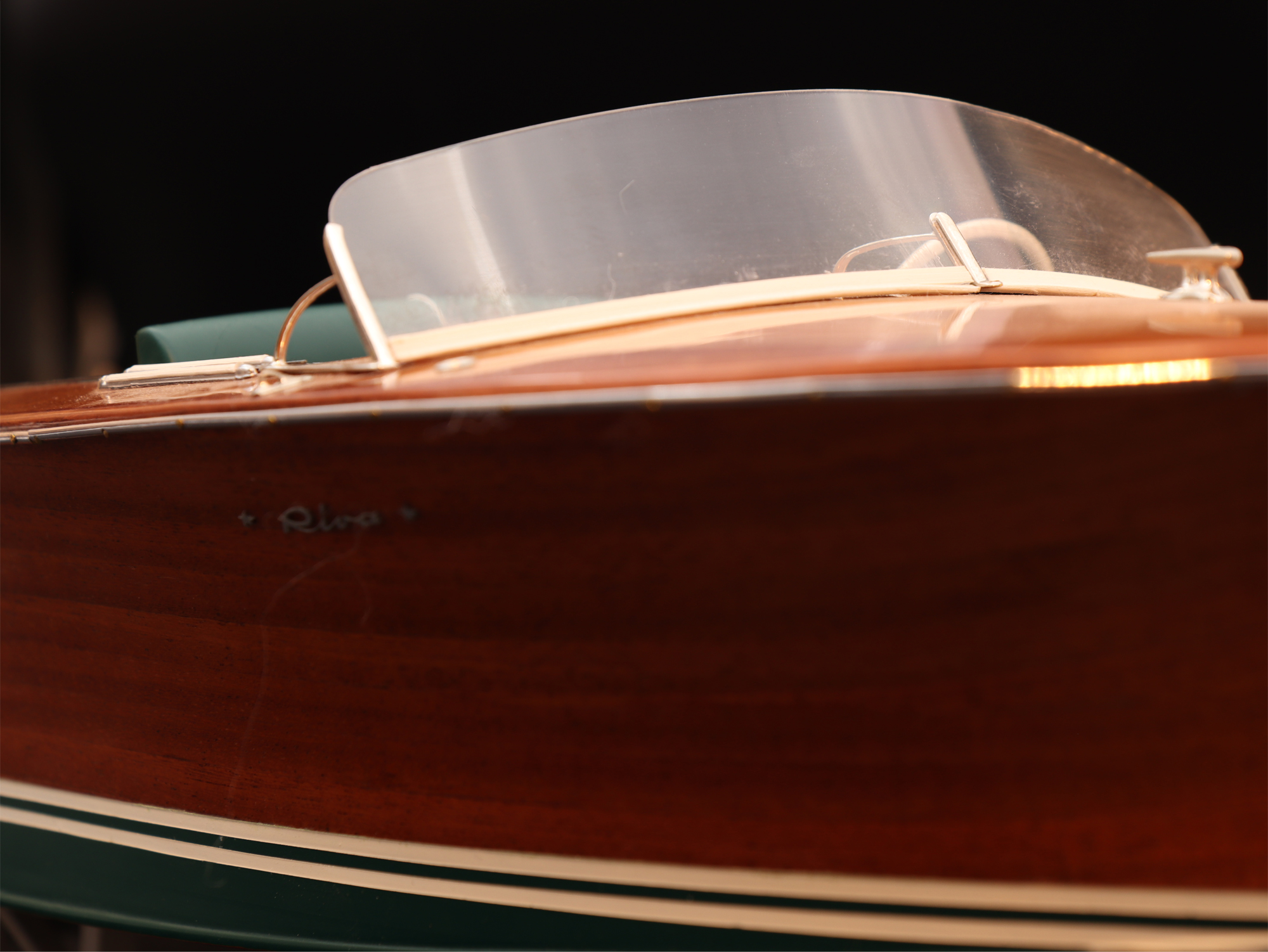 This was the first boat designed exclusively for series production using a 60 Hp Chris-Craft engine. It was built using Honduras mahogany planking throughout. It was originally made with a two-part frameless glass windscreen, dark green vinyl dashboard and seating, an article holder under the deck and a green fabric sunbed. From the 1953 series the inner panels were lined with padded green vinyl and the windscreen was in a single piece. The number of frames was increased in 1955 and their centre distance set at 16 cm. A new steering box made of bronze with stainless steel parts and a Monel propeller shaft were fitted. The side planking was installed with the aid of adhesives. The bottom was fitted using corrosion resistant Phillips cross-head screws. From # 98, at the end of 1956, the bottom was a single piece of plywood and, from 101, the decking was also made of plywood, with inlaid veneers. The 1957 series is also typified by the wrap-around glass windscreen.