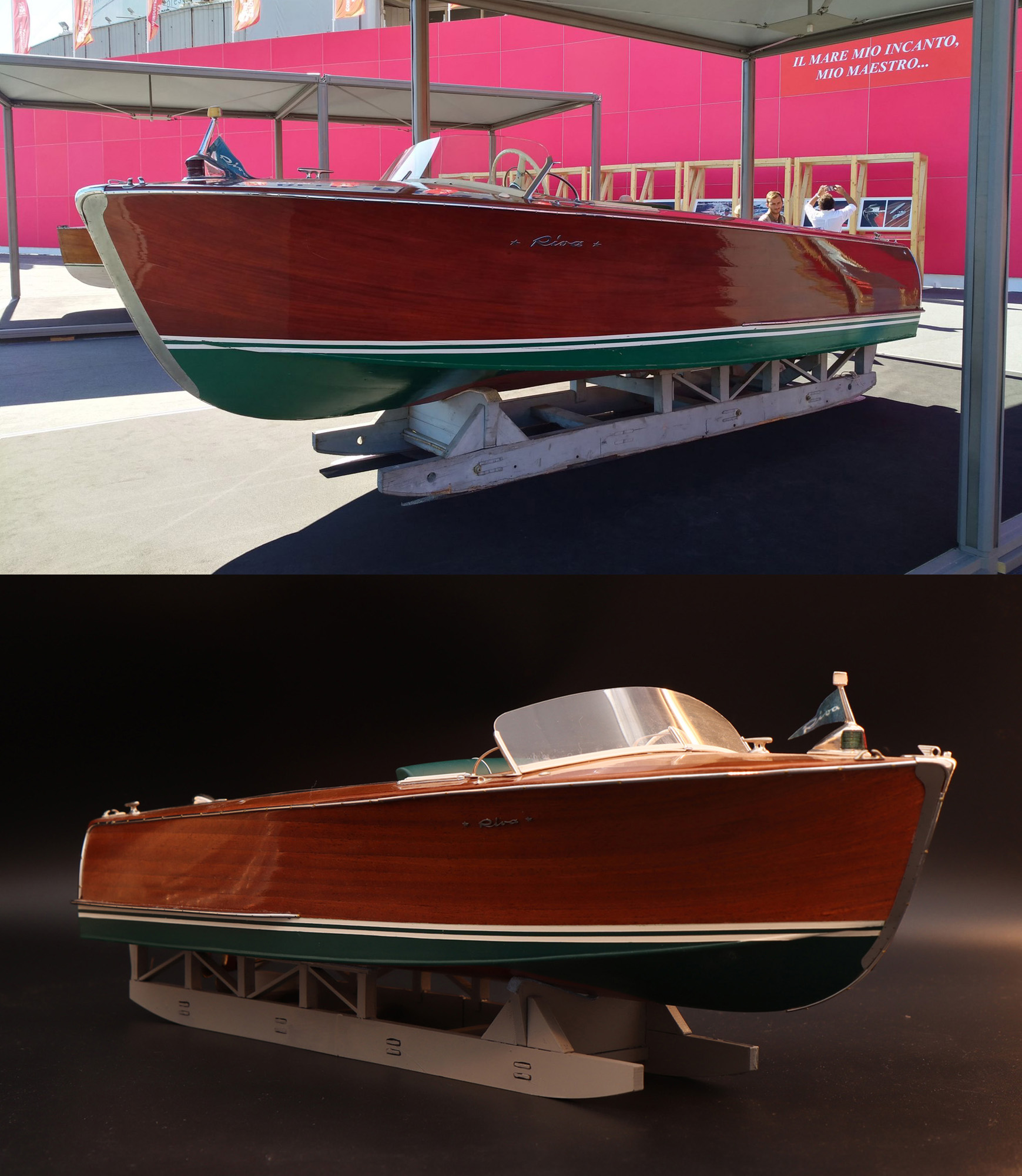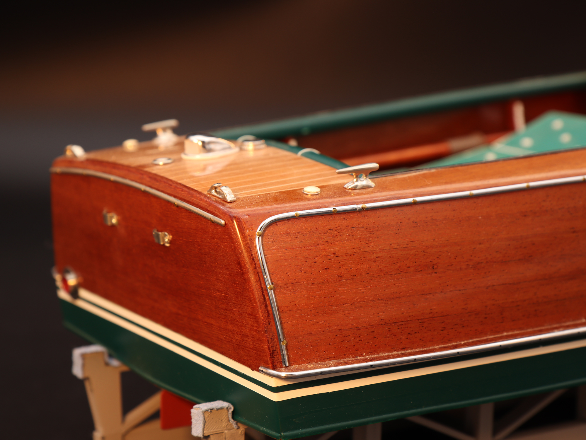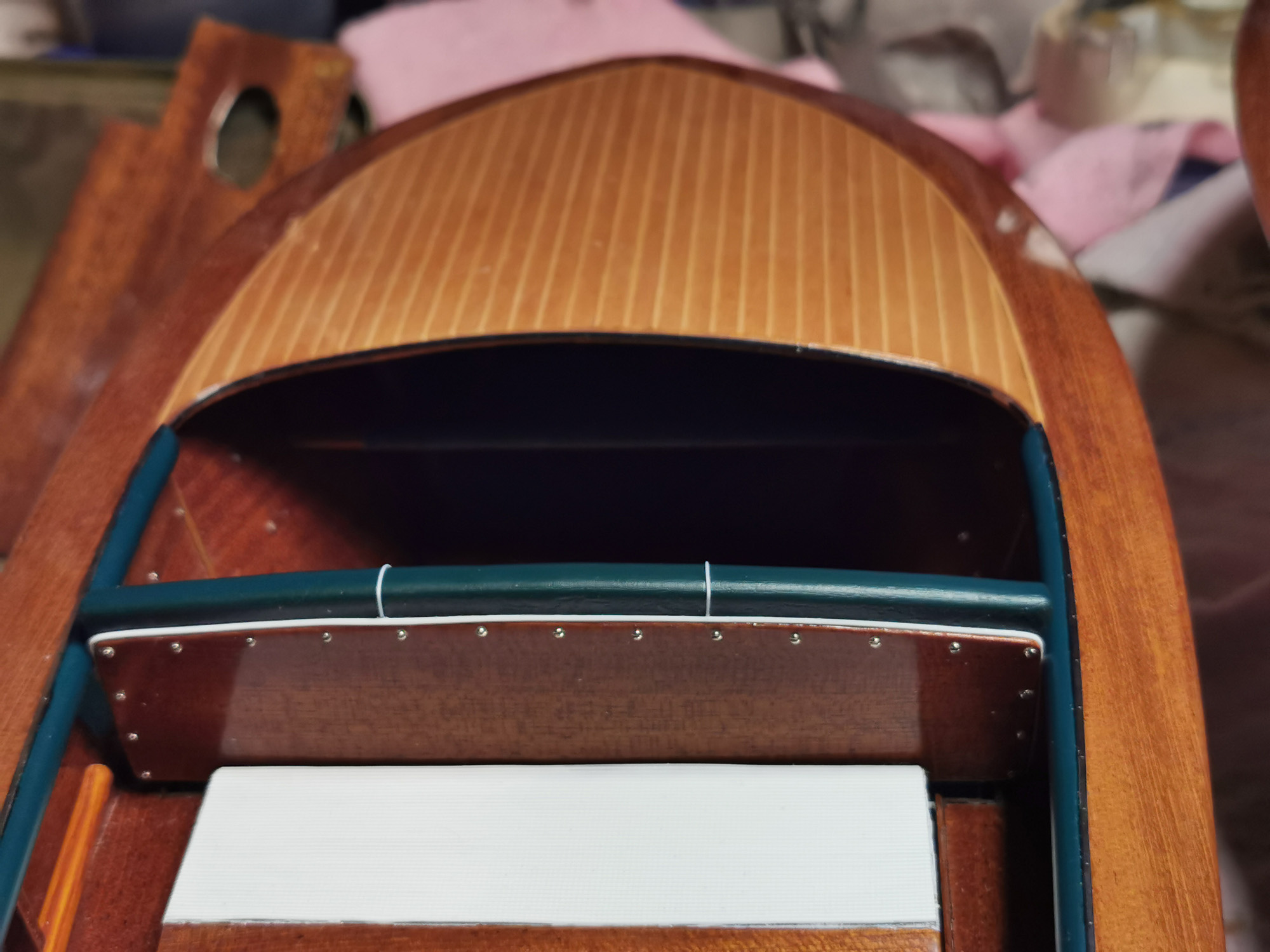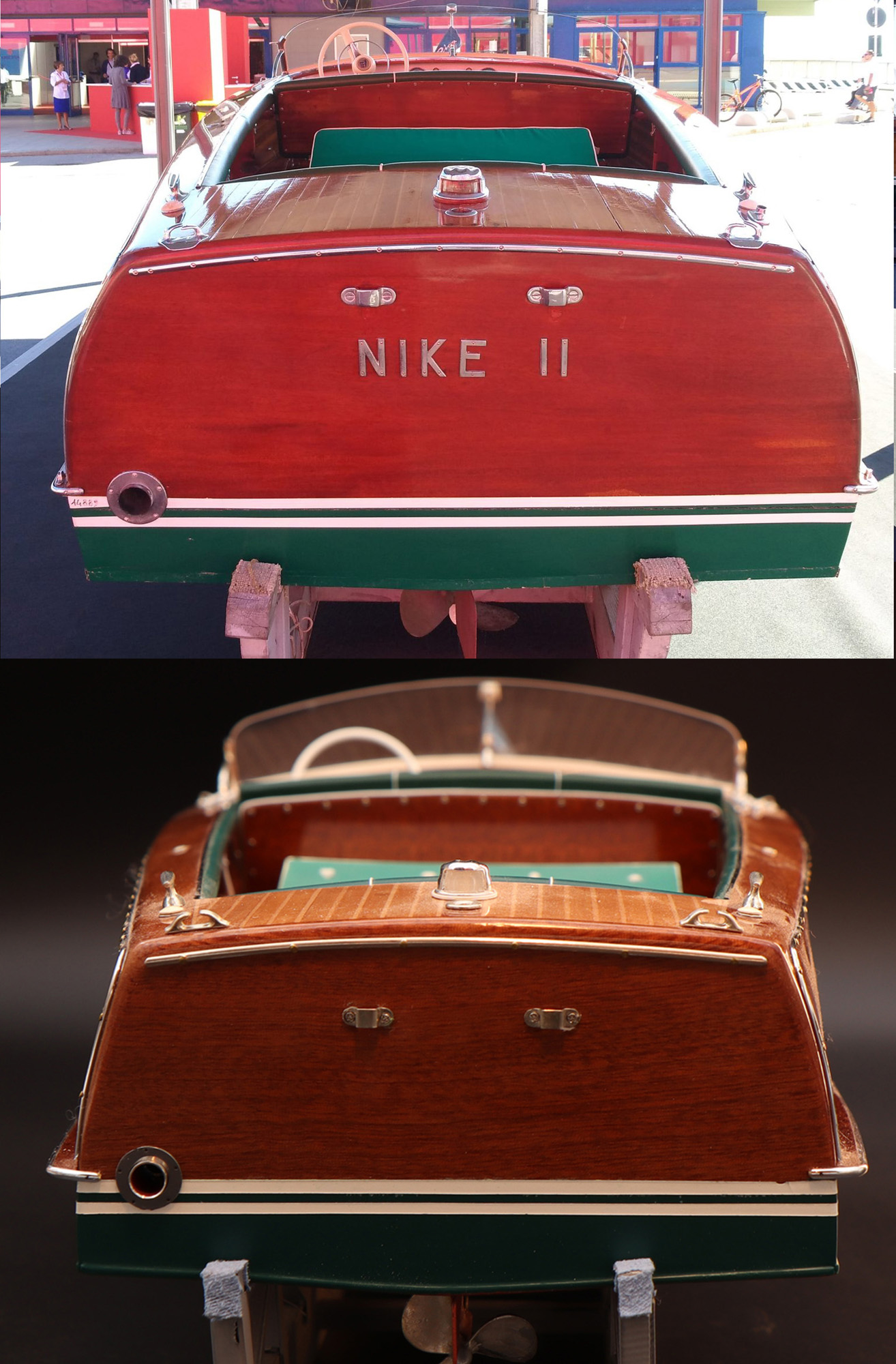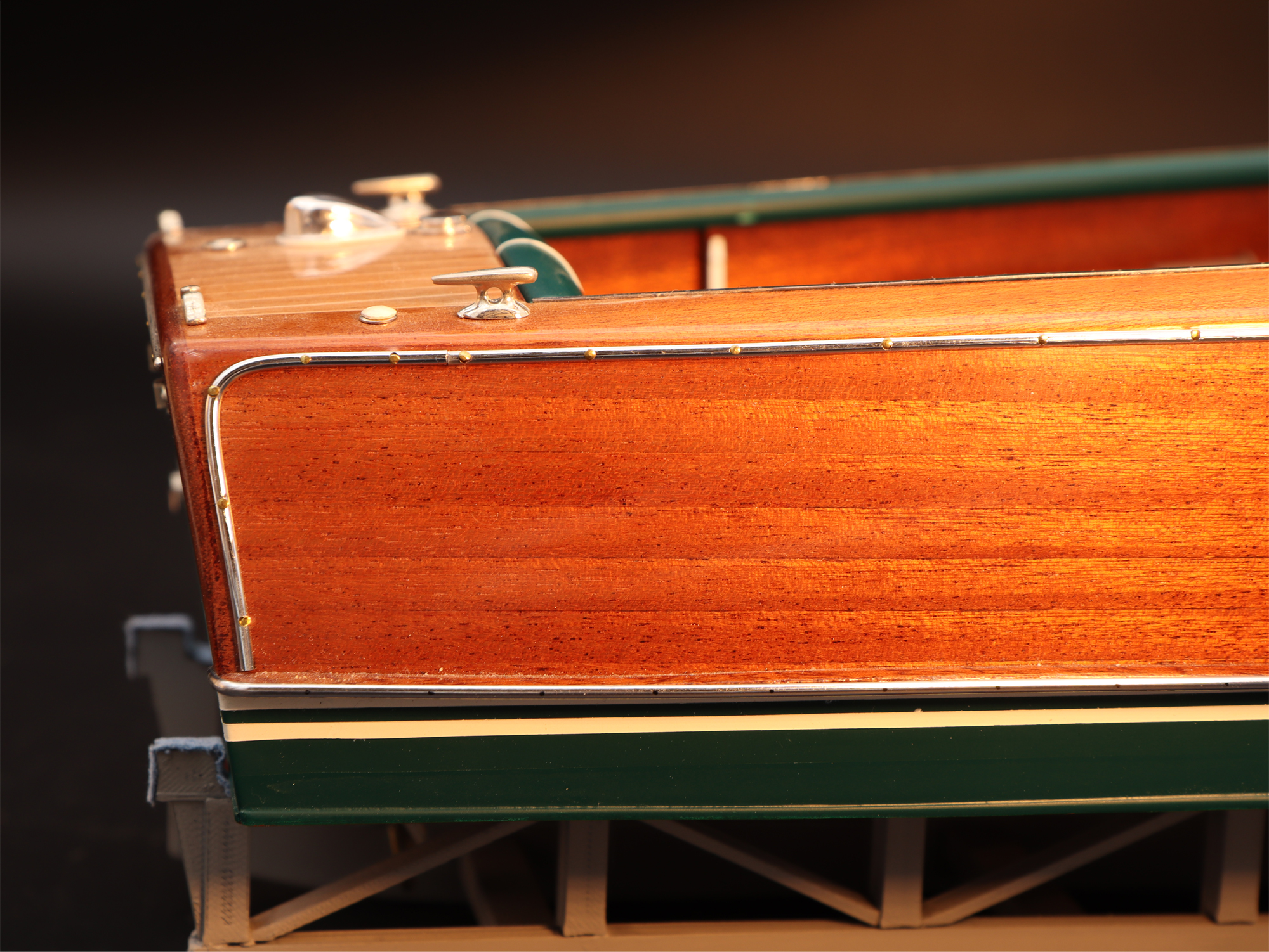 This was the first boat designed exclusively for series production using a 60 Hp Chris-Craft engine. It was built using Honduras mahogany planking throughout. It was originally made with a two-part frameless glass windscreen, dark green vinyl dashboard and seating, an article holder under the deck and a green fabric sunbed. From the 1953 series the inner panels were lined with padded green vinyl and the windscreen was in a single piece. The number of frames was increased in 1955 and their centre distance set at 16 cm. A new steering box made of bronze with stainless steel parts and a Monel propeller shaft were fitted. The side planking was installed with the aid of adhesives. The bottom was fitted using corrosion resistant Phillips cross-head screws. From # 98, at the end of 1956, the bottom was a single piece of plywood and, from 101, the decking was also made of plywood, with inlaid veneers. The 1957 series is also typified by the wrap-around glass windscreen.
