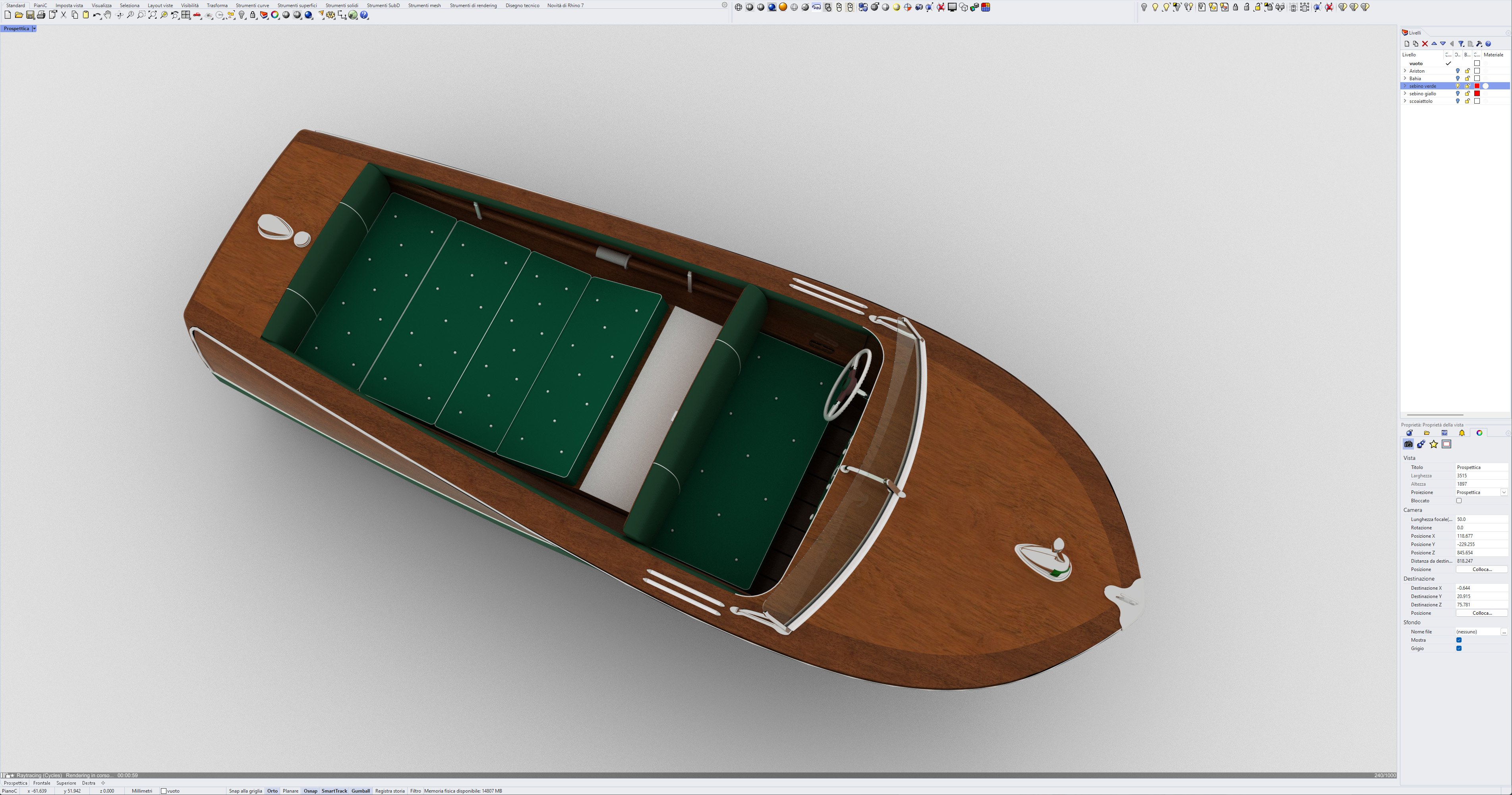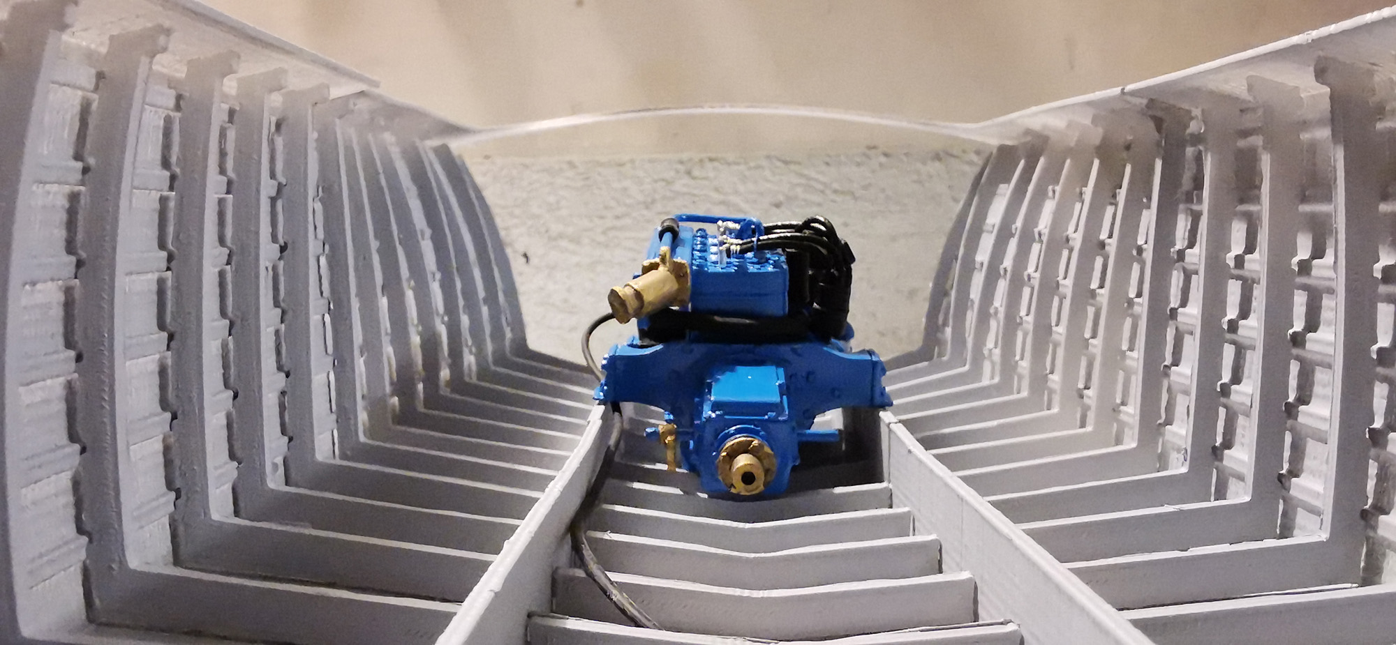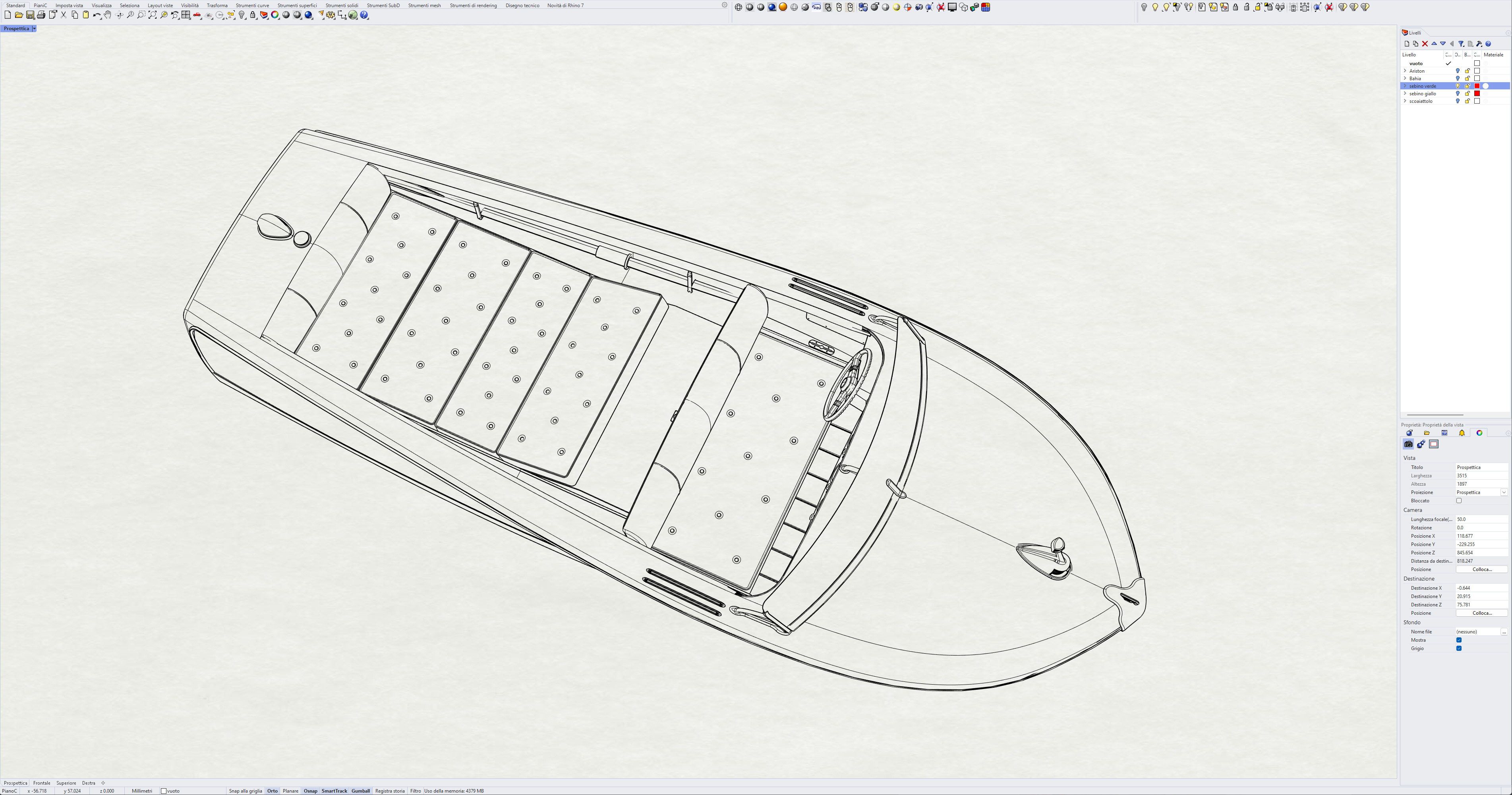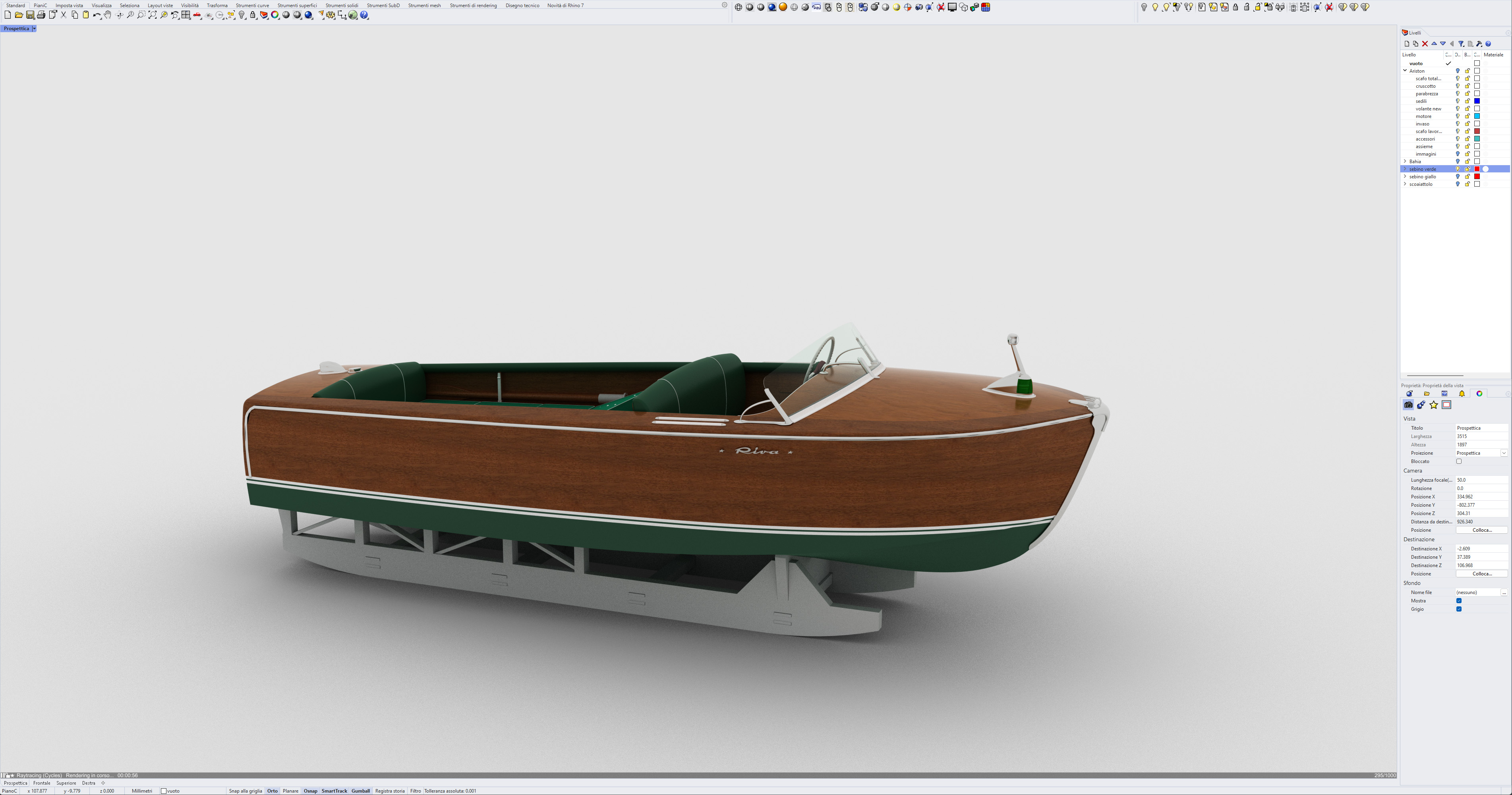 This was the first boat designed exclusively for series production using a 60 Hp Chris-Craft engine. It was built using Honduras mahogany planking throughout. It was originally made with a two-part frameless glass windscreen, dark green vinyl dashboard and seating, an article holder under the deck and a green fabric sunbed. From the 1953 series the inner panels were lined with padded green vinyl and the windscreen was in a single piece. The number of frames was increased in 1955 and their centre distance set at 16 cm. A new steering box made of bronze with stainless steel parts and a Monel propeller shaft were fitted. The side planking was installed with the aid of adhesives. The bottom was fitted using corrosion resistant Phillips cross-head screws. From # 98, at the end of 1956, the bottom was a single piece of plywood and, from 101, the decking was also made of plywood, with inlaid veneers. The 1957 series is also typified by the wrap-around glass windscreen.