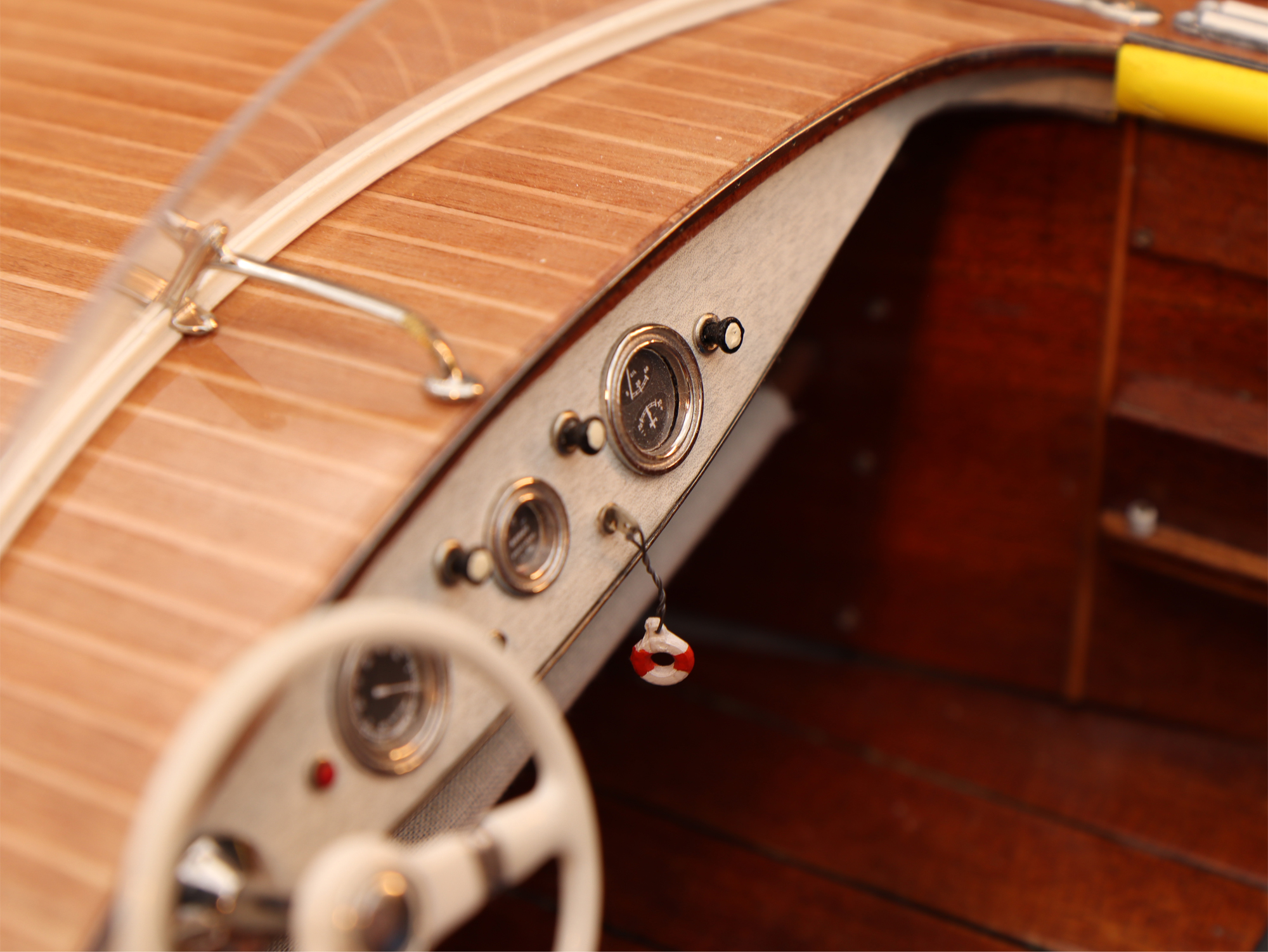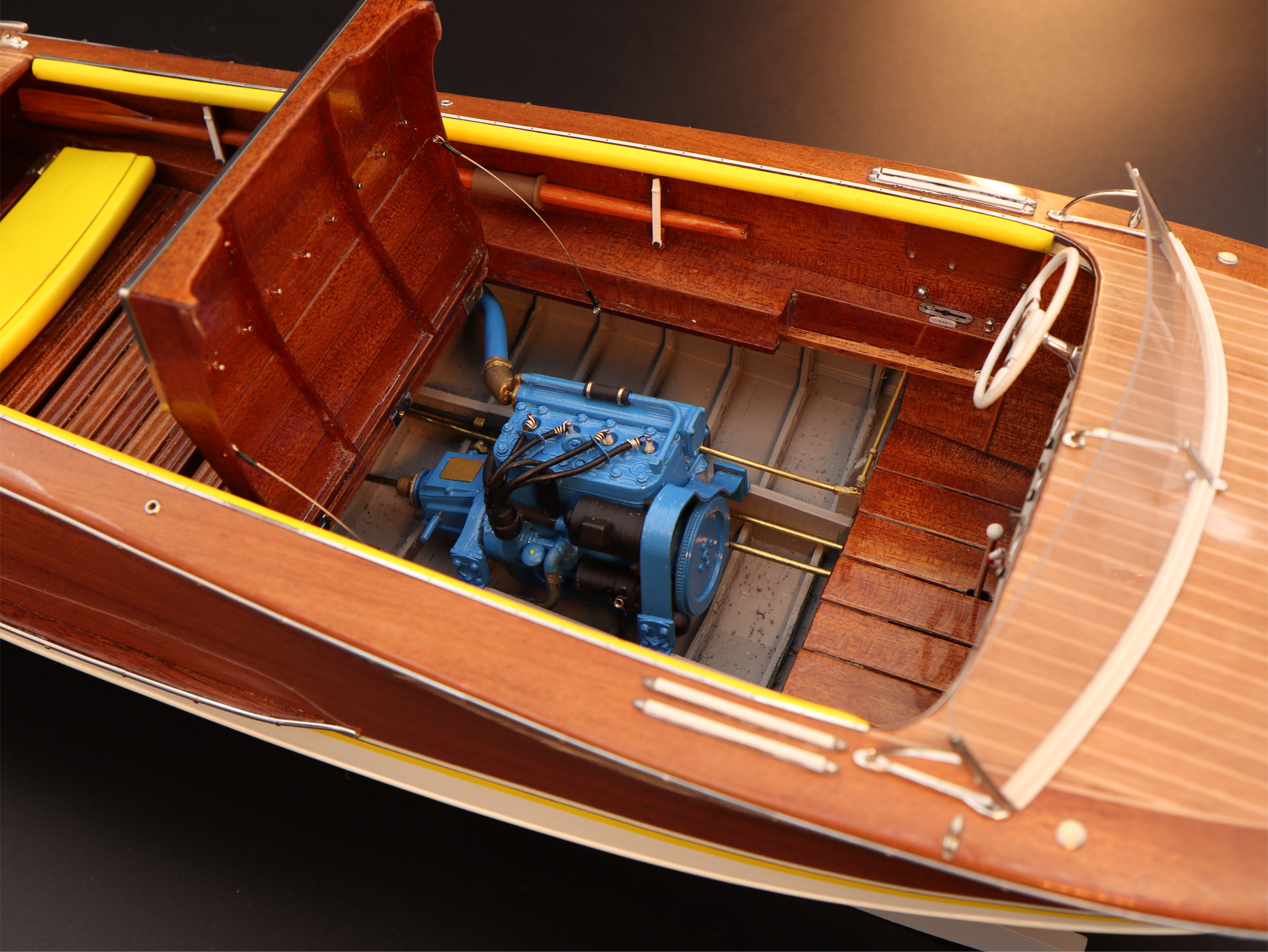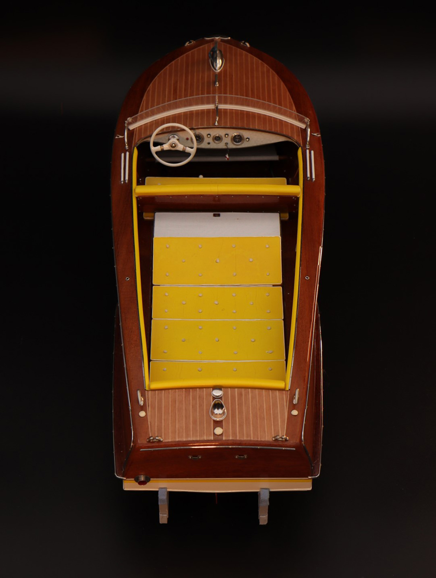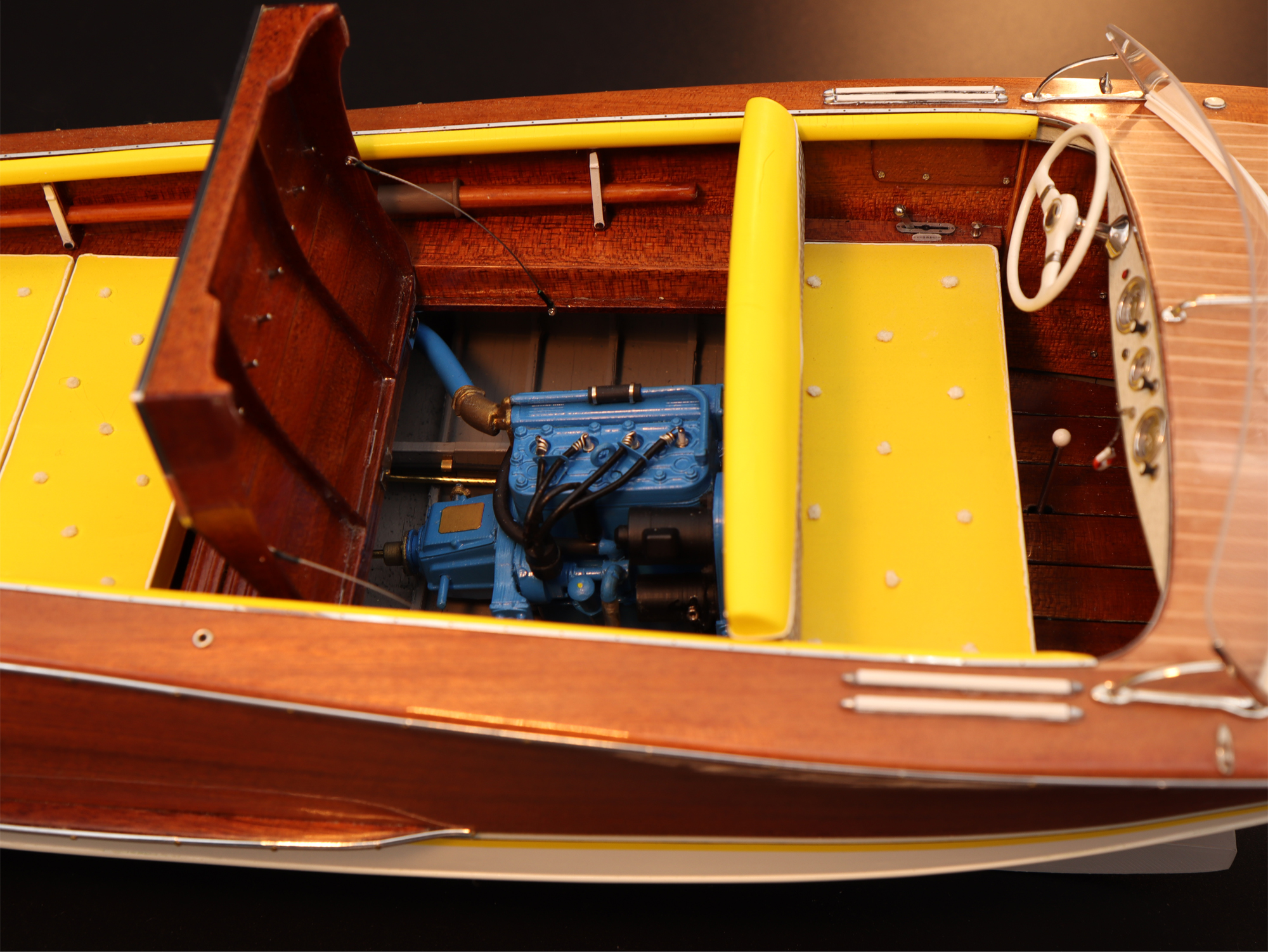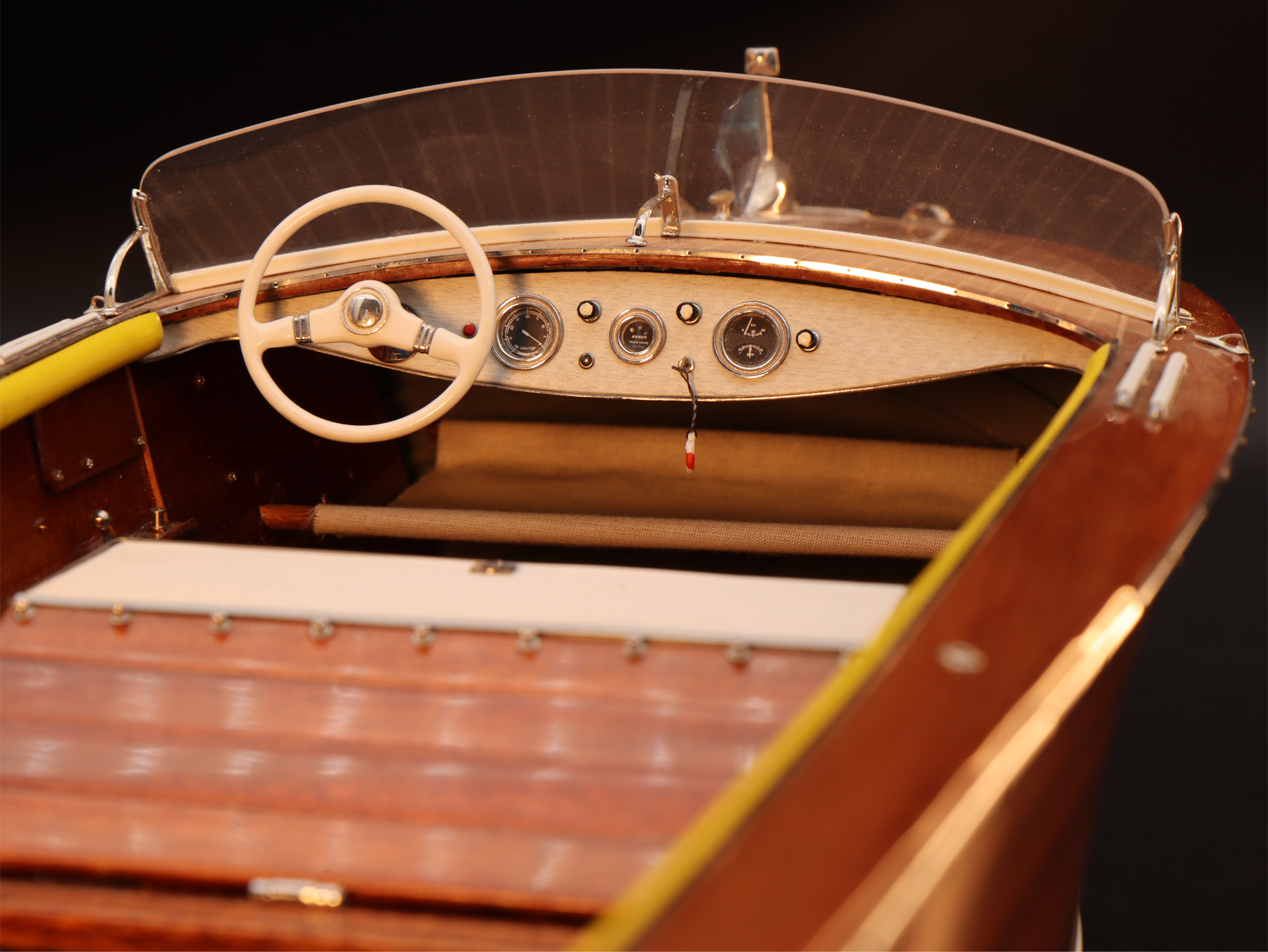 This was the first boat designed exclusively for series production using a 60 Hp Chris-Craft engine. It was built using Honduras mahogany planking throughout. It was originally made with a two-part frameless glass windscreen, dark green vinyl dashboard and seating, an article holder under the deck and a green fabric sunbed. From the 1953 series the inner panels were lined with padded green vinyl and the windscreen was in a single piece. The number of frames was increased in 1955 and their centre distance set at 16 cm. A new steering box made of bronze with stainless steel parts and a Monel propeller shaft were fitted. The side planking was installed with the aid of adhesives. The bottom was fitted using corrosion resistant Phillips cross-head screws. From # 98, at the end of 1956, the bottom was a single piece of plywood and, from 101, the decking was also made of plywood, with inlaid veneers. The 1957 series is also typified by the wrap-around glass windscreen.