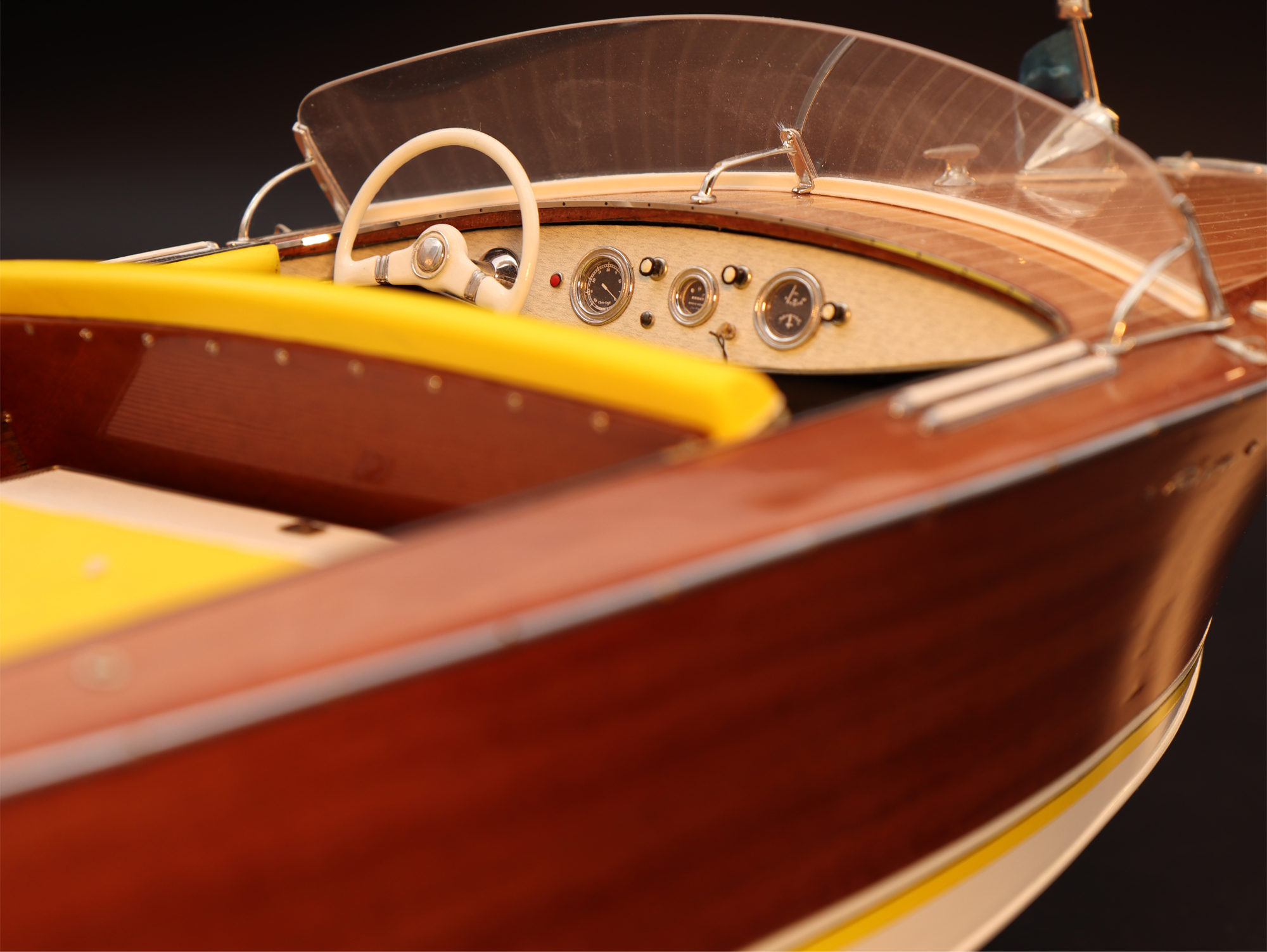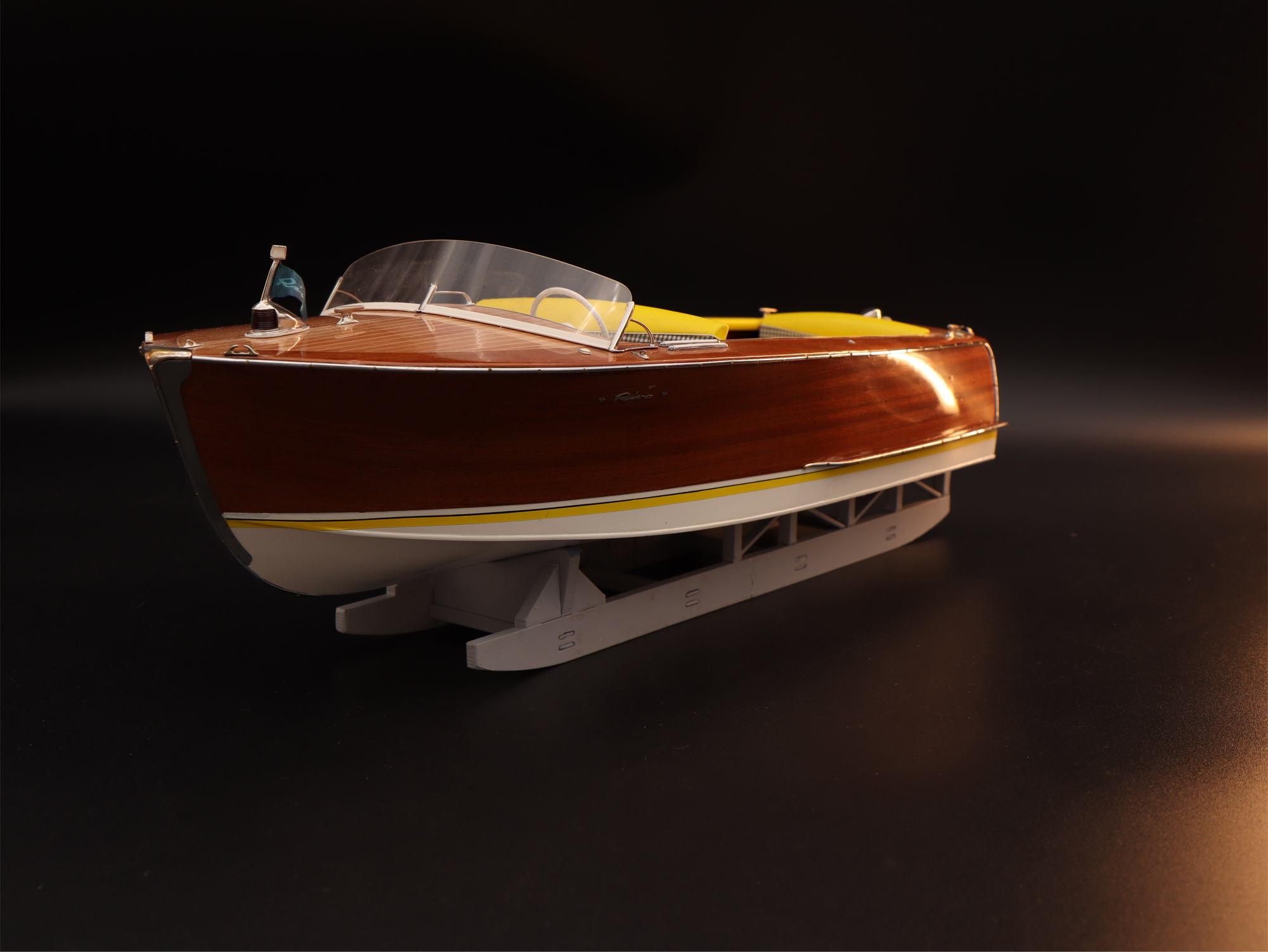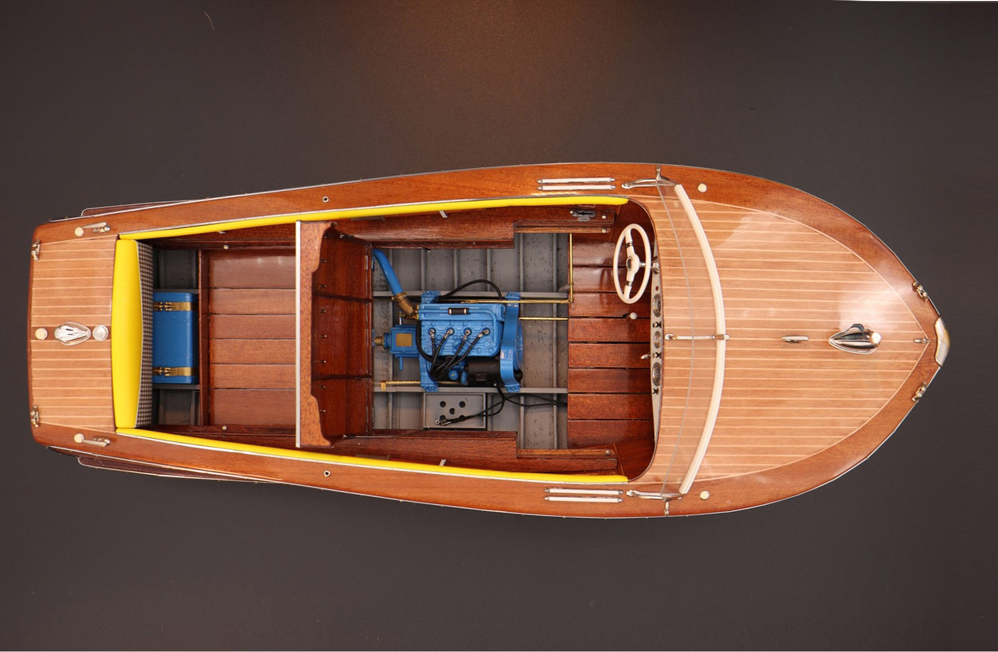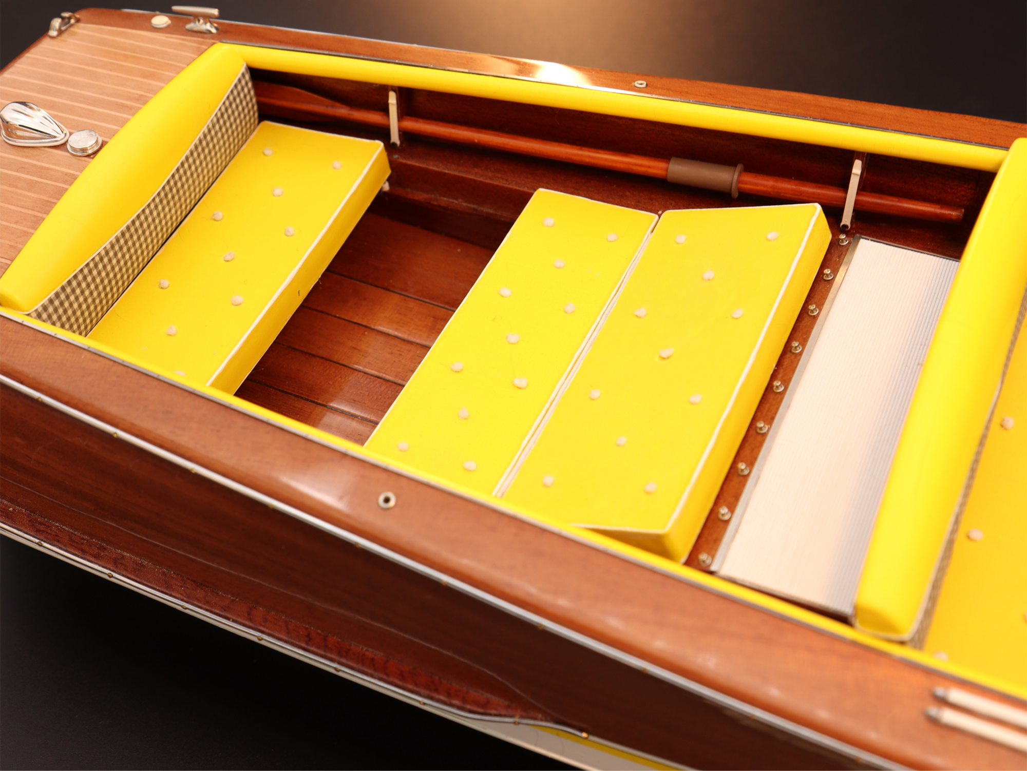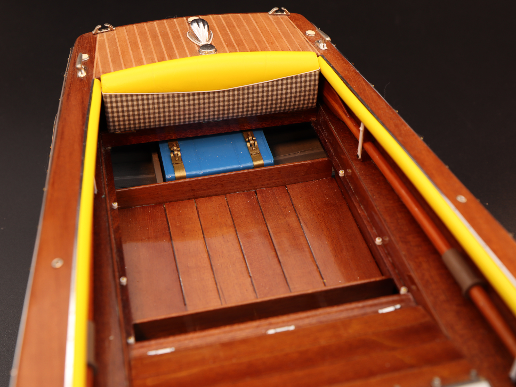 This was the first boat designed exclusively for series production using a 60 Hp Chris-Craft engine. It was built using Honduras mahogany planking throughout. It was originally made with a two-part frameless glass windscreen, dark green vinyl dashboard and seating, an article holder under the deck and a green fabric sunbed. From the 1953 series the inner panels were lined with padded green vinyl and the windscreen was in a single piece. The number of frames was increased in 1955 and their centre distance set at 16 cm. A new steering box made of bronze with stainless steel parts and a Monel propeller shaft were fitted. The side planking was installed with the aid of adhesives. The bottom was fitted using corrosion resistant Phillips cross-head screws. From # 98, at the end of 1956, the bottom was a single piece of plywood and, from 101, the decking was also made of plywood, with inlaid veneers. The 1957 series is also typified by the wrap-around glass windscreen.