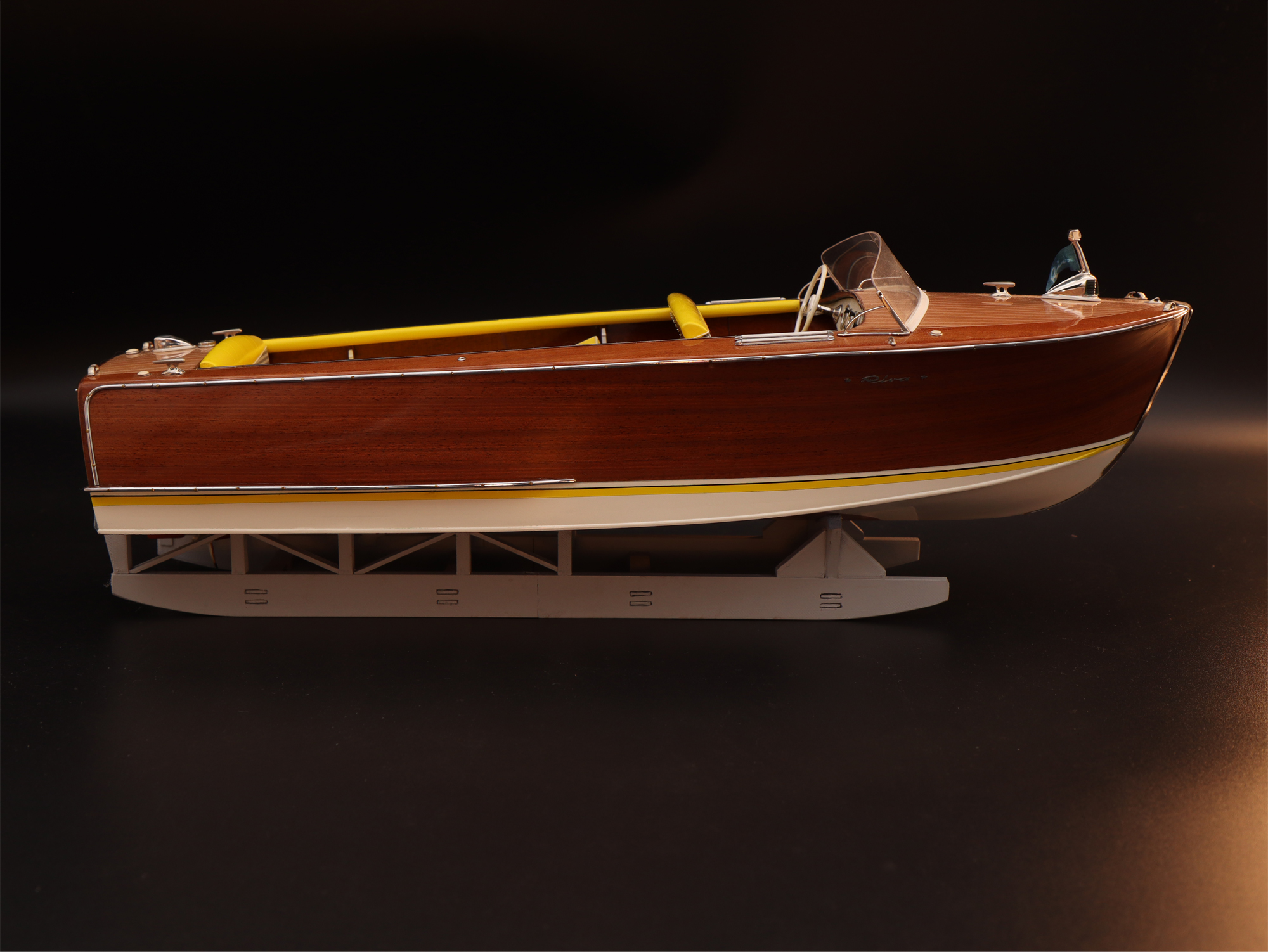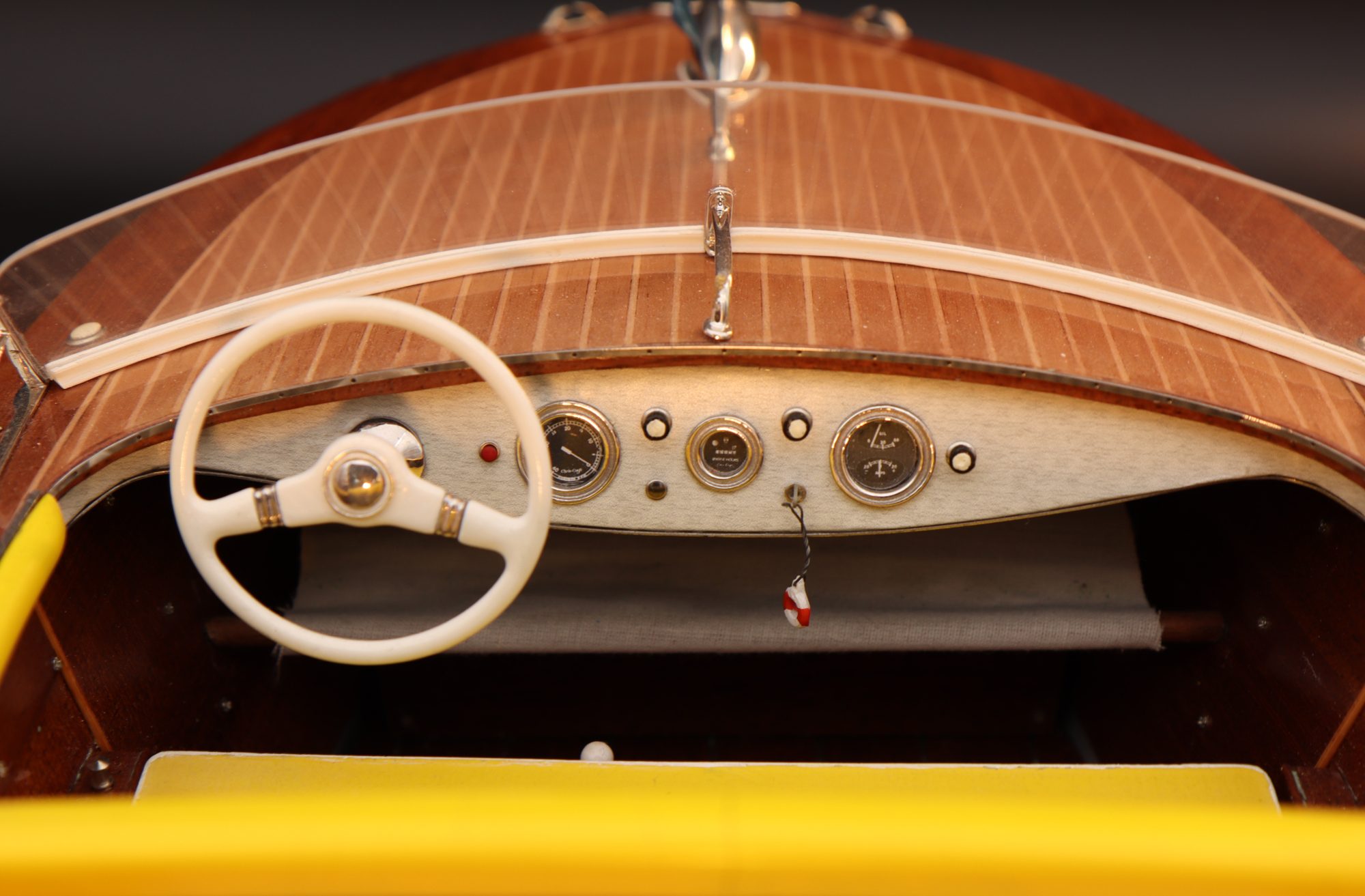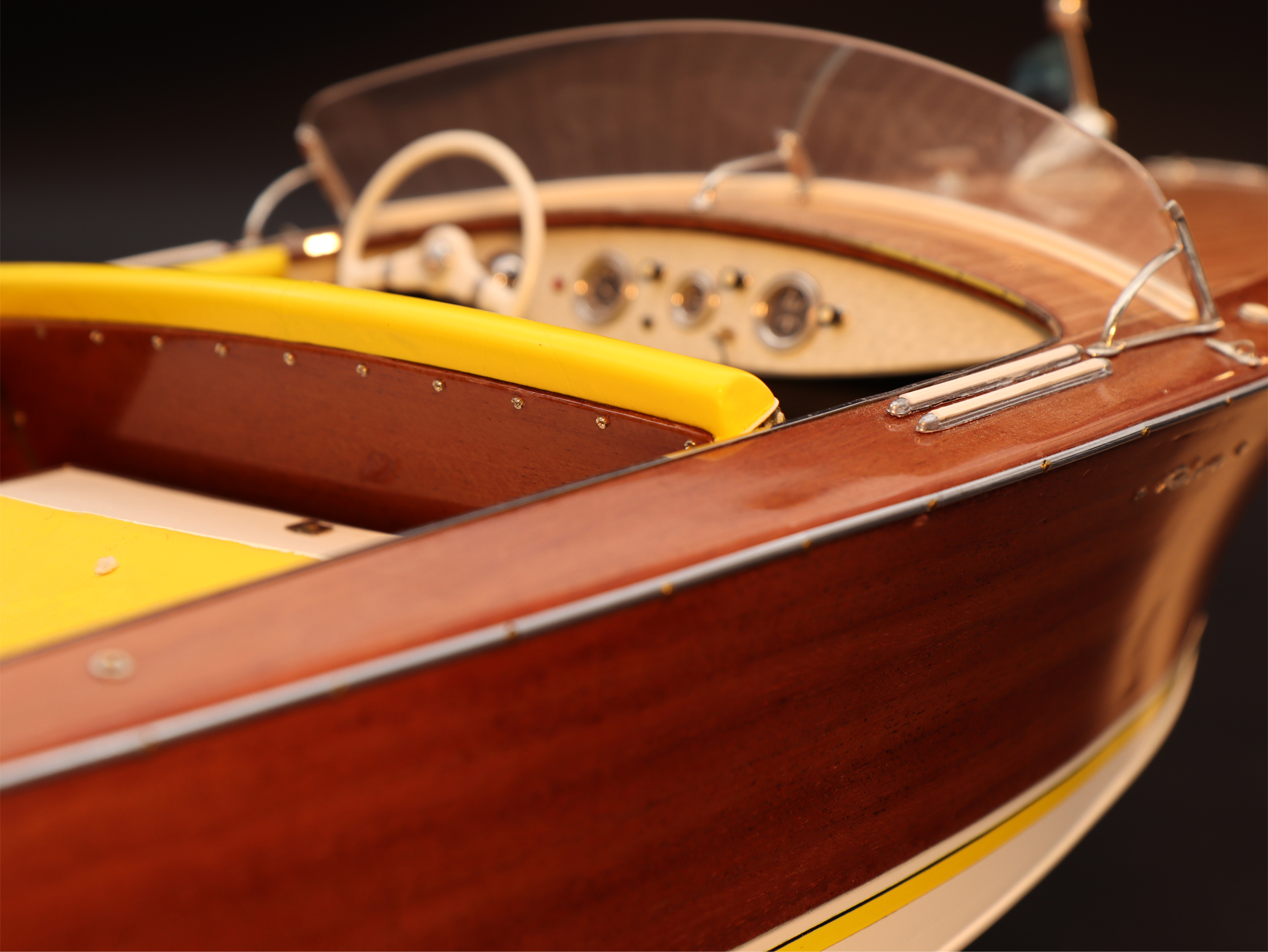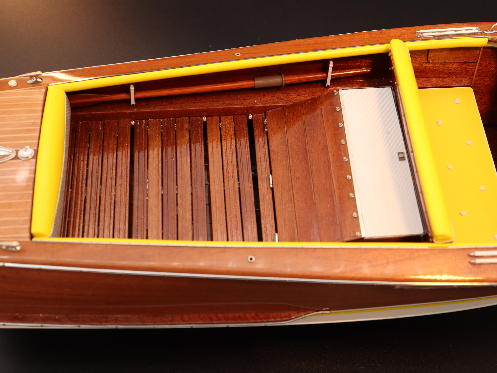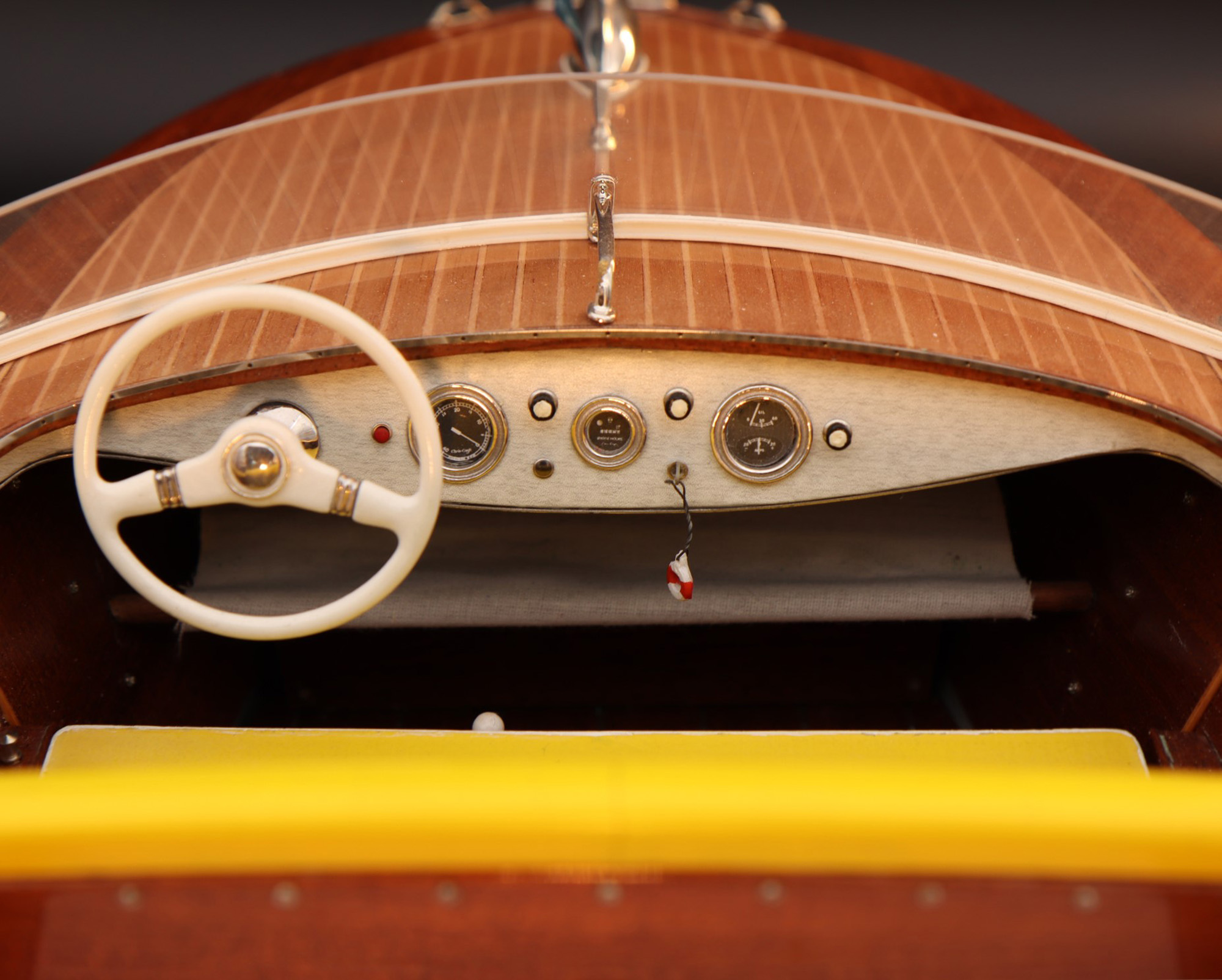 This was the first boat designed exclusively for series production using a 60 Hp Chris-Craft engine. It was built using Honduras mahogany planking throughout. It was originally made with a two-part frameless glass windscreen, dark green vinyl dashboard and seating, an article holder under the deck and a green fabric sunbed. From the 1953 series the inner panels were lined with padded green vinyl and the windscreen was in a single piece. The number of frames was increased in 1955 and their centre distance set at 16 cm. A new steering box made of bronze with stainless steel parts and a Monel propeller shaft were fitted. The side planking was installed with the aid of adhesives. The bottom was fitted using corrosion resistant Phillips cross-head screws. From # 98, at the end of 1956, the bottom was a single piece of plywood and, from 101, the decking was also made of plywood, with inlaid veneers. The 1957 series is also typified by the wrap-around glass windscreen.