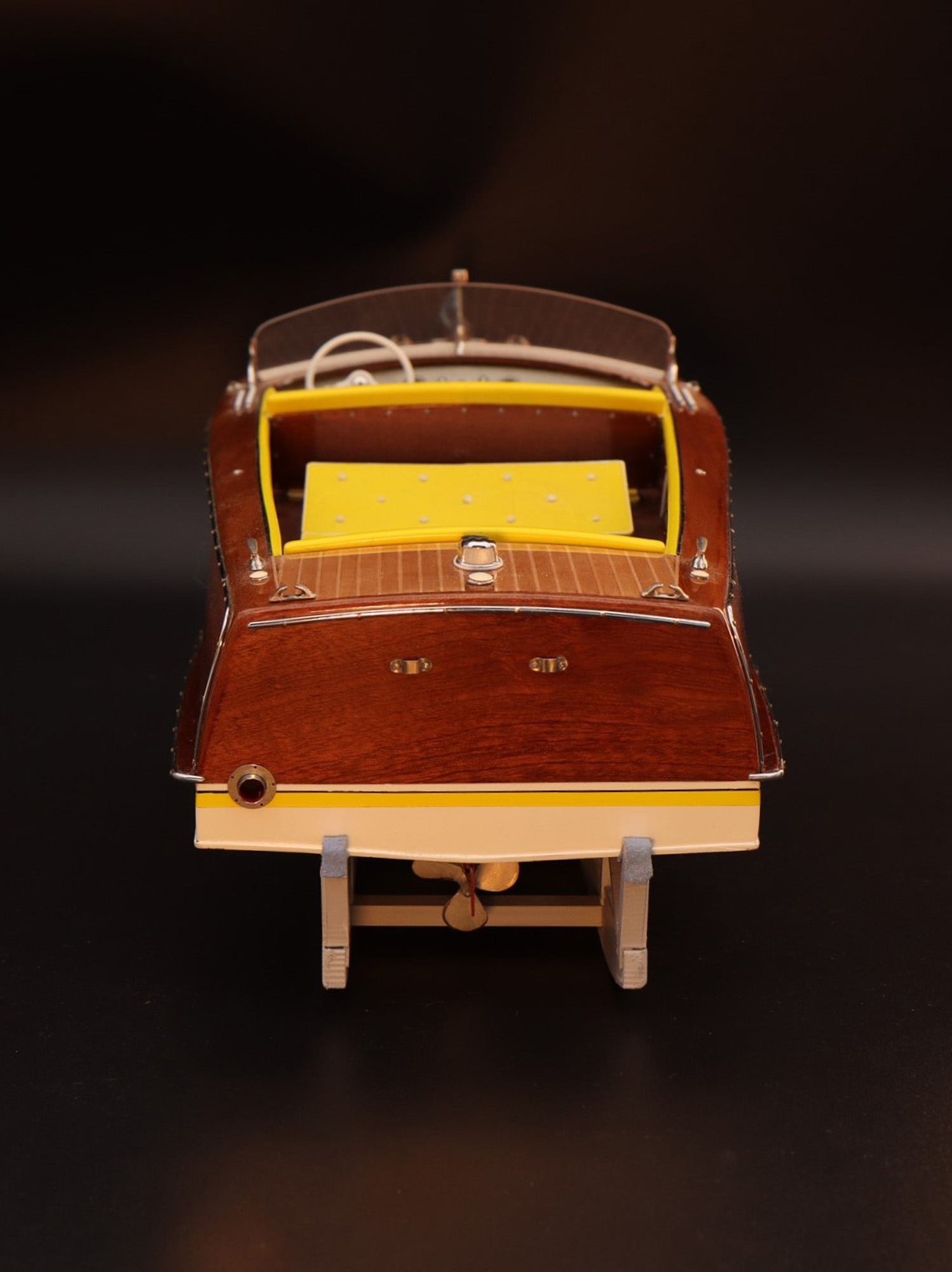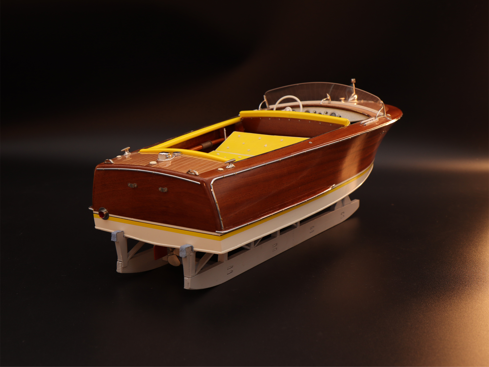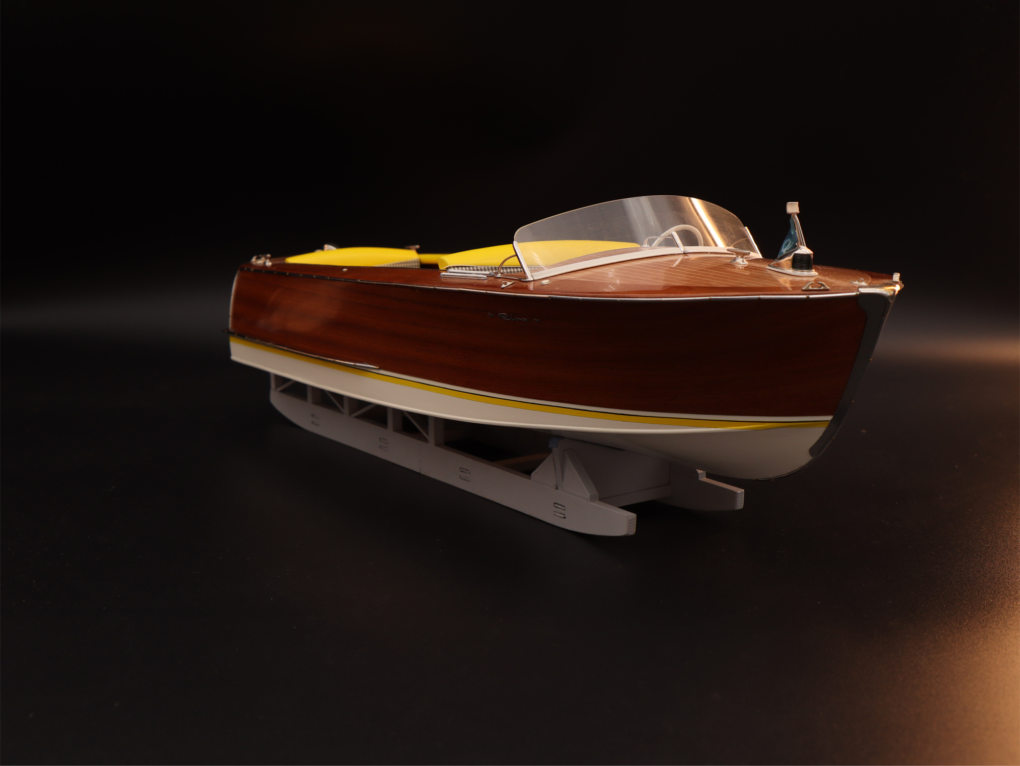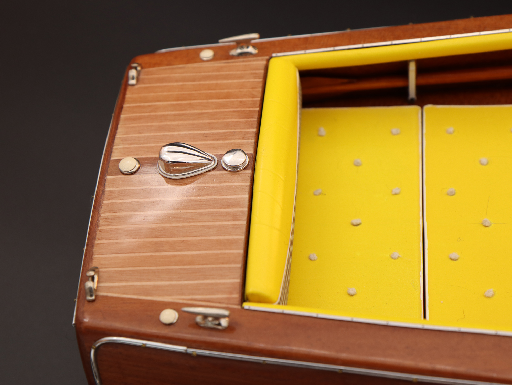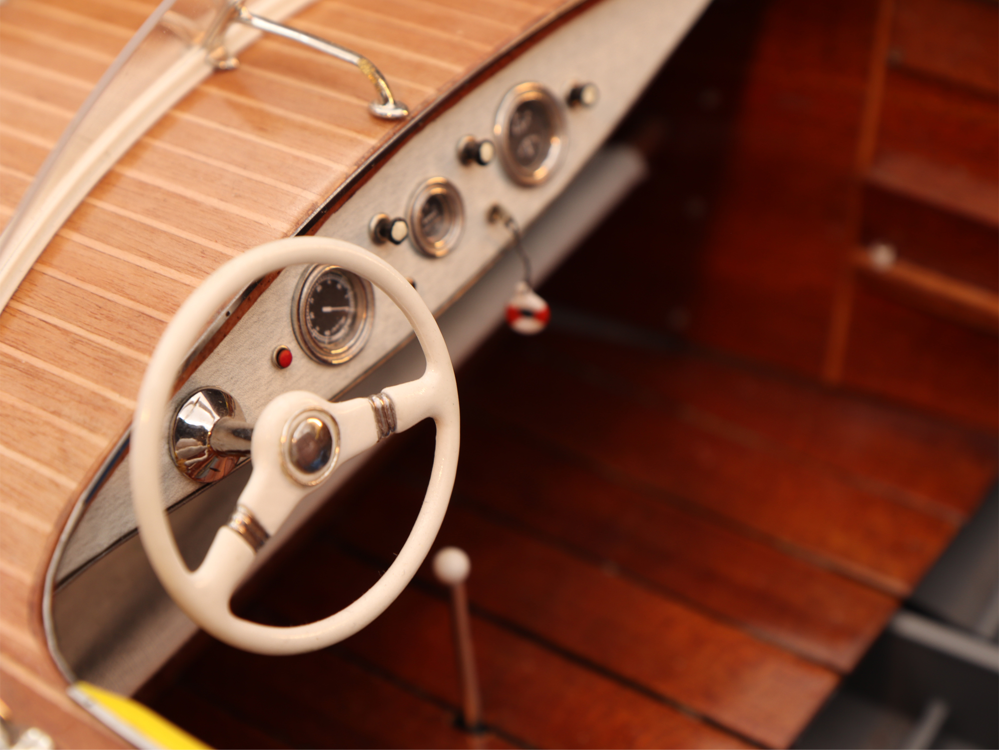 This was the first boat designed exclusively for series production using a 60 Hp Chris-Craft engine. It was built using Honduras mahogany planking throughout. It was originally made with a two-part frameless glass windscreen, dark green vinyl dashboard and seating, an article holder under the deck and a green fabric sunbed. From the 1953 series the inner panels were lined with padded green vinyl and the windscreen was in a single piece. The number of frames was increased in 1955 and their centre distance set at 16 cm. A new steering box made of bronze with stainless steel parts and a Monel propeller shaft were fitted. The side planking was installed with the aid of adhesives. The bottom was fitted using corrosion resistant Phillips cross-head screws. From # 98, at the end of 1956, the bottom was a single piece of plywood and, from 101, the decking was also made of plywood, with inlaid veneers. The 1957 series is also typified by the wrap-around glass windscreen.
