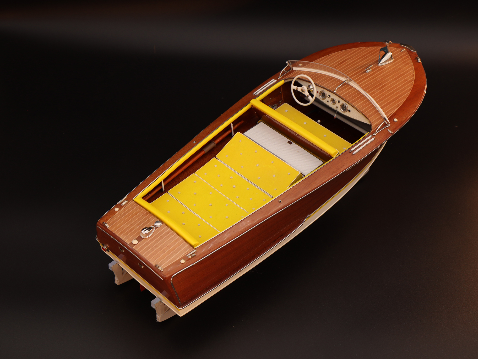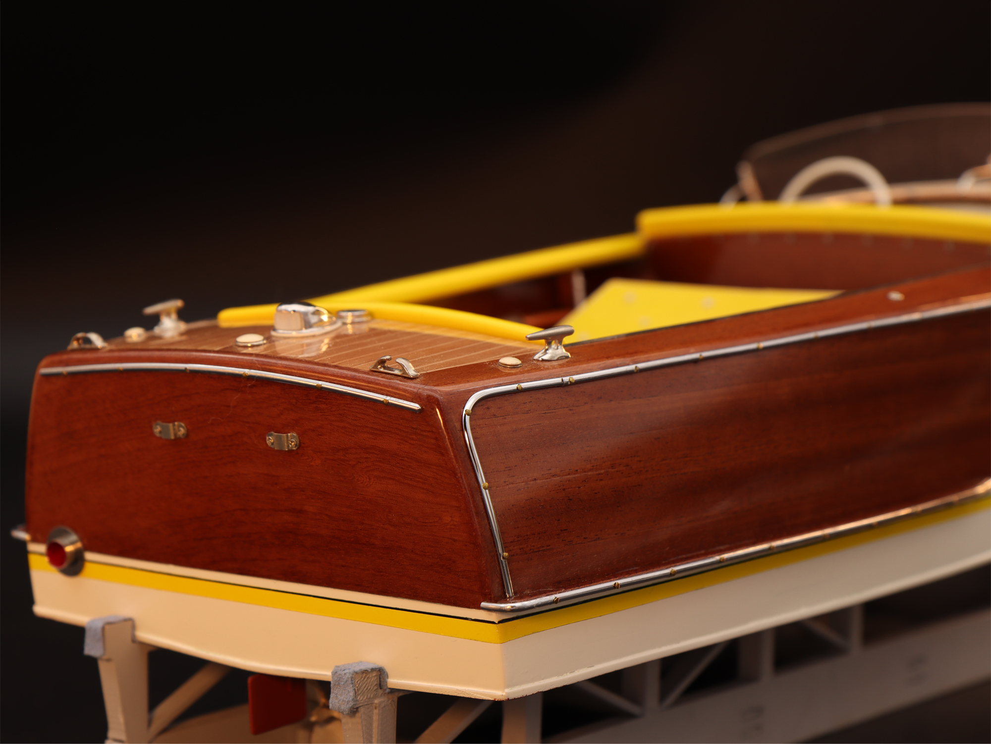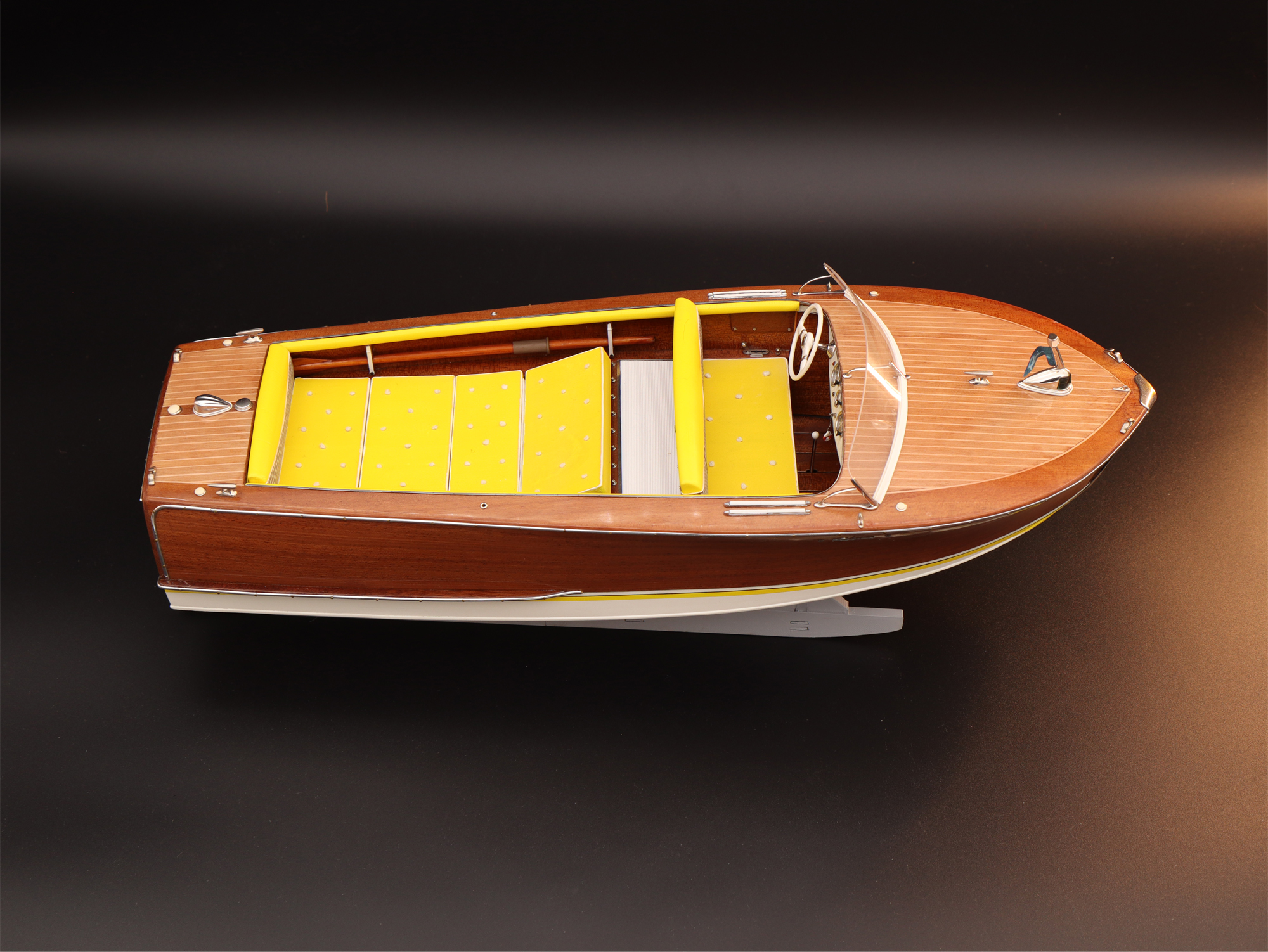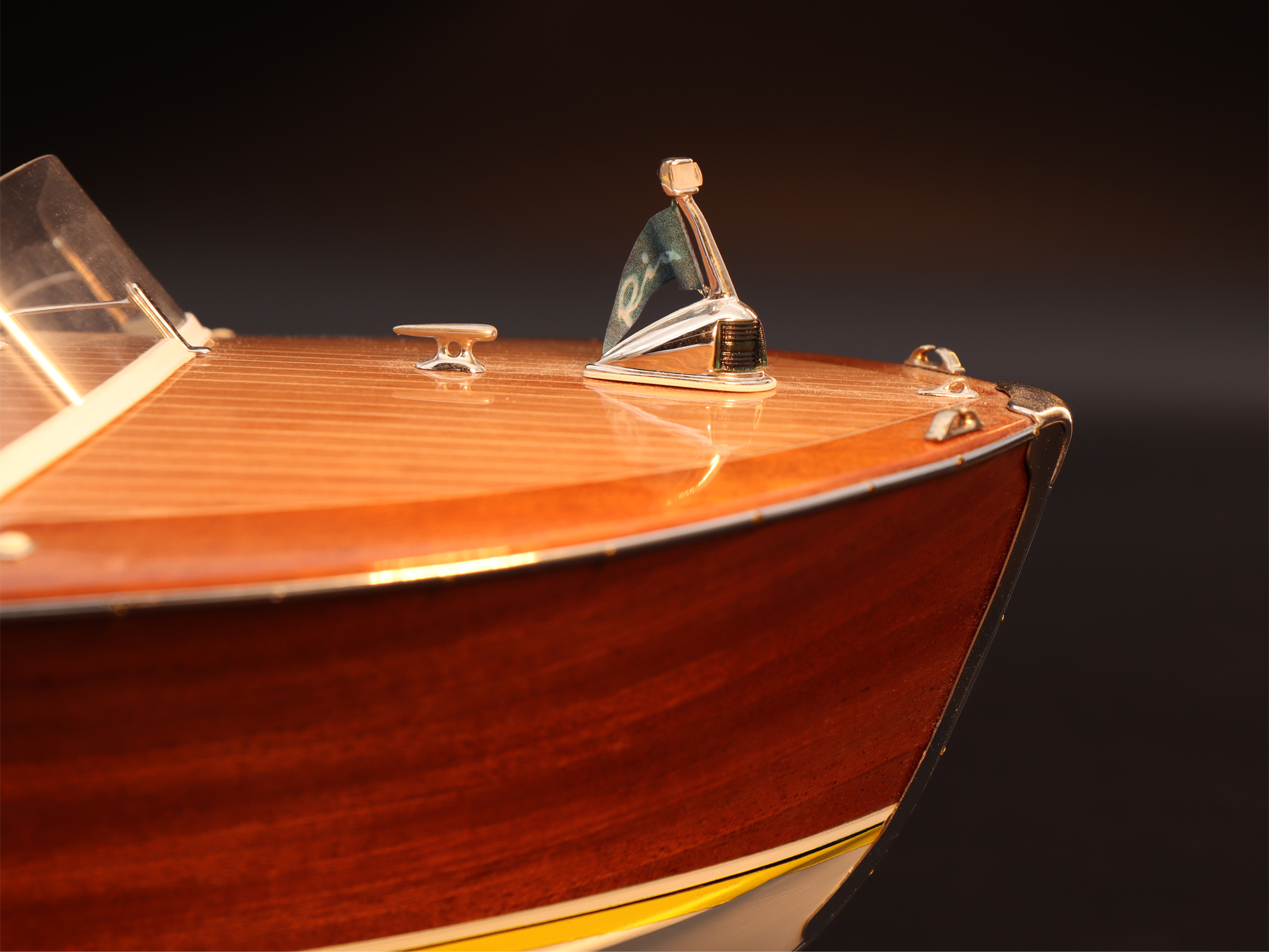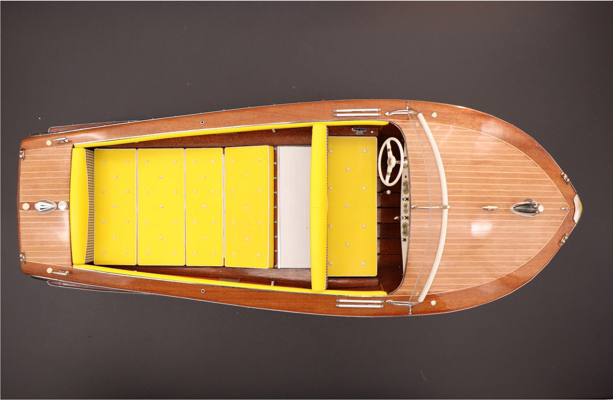This was the first boat designed exclusively for series production using a 60 Hp Chris-Craft engine. It was built using Honduras mahogany planking throughout. It was originally made with a two-part frameless glass windscreen, dark green vinyl dashboard and seating, an article holder under the deck and a green fabric sunbed. From the 1953 series the inner panels were lined with padded green vinyl and the windscreen was in a single piece. The number of frames was increased in 1955 and their centre distance set at 16 cm. A new steering box made of bronze with stainless steel parts and a Monel propeller shaft were fitted. The side planking was installed with the aid of adhesives. The bottom was fitted using corrosion resistant Phillips cross-head screws. From # 98, at the end of 1956, the bottom was a single piece of plywood and, from 101, the decking was also made of plywood, with inlaid veneers. The 1957 series is also typified by the wrap-around glass windscreen.