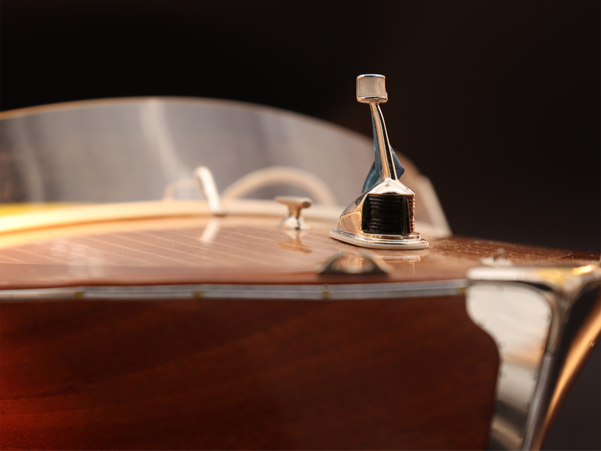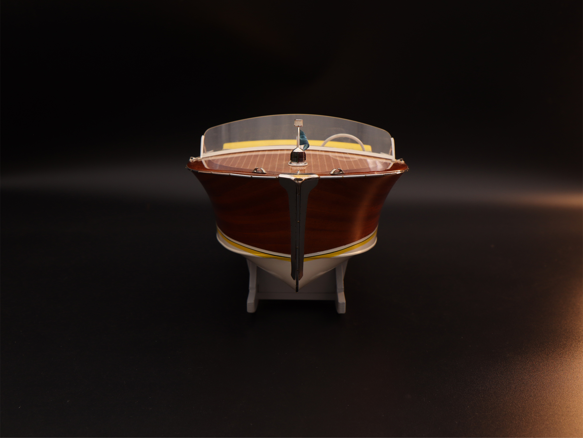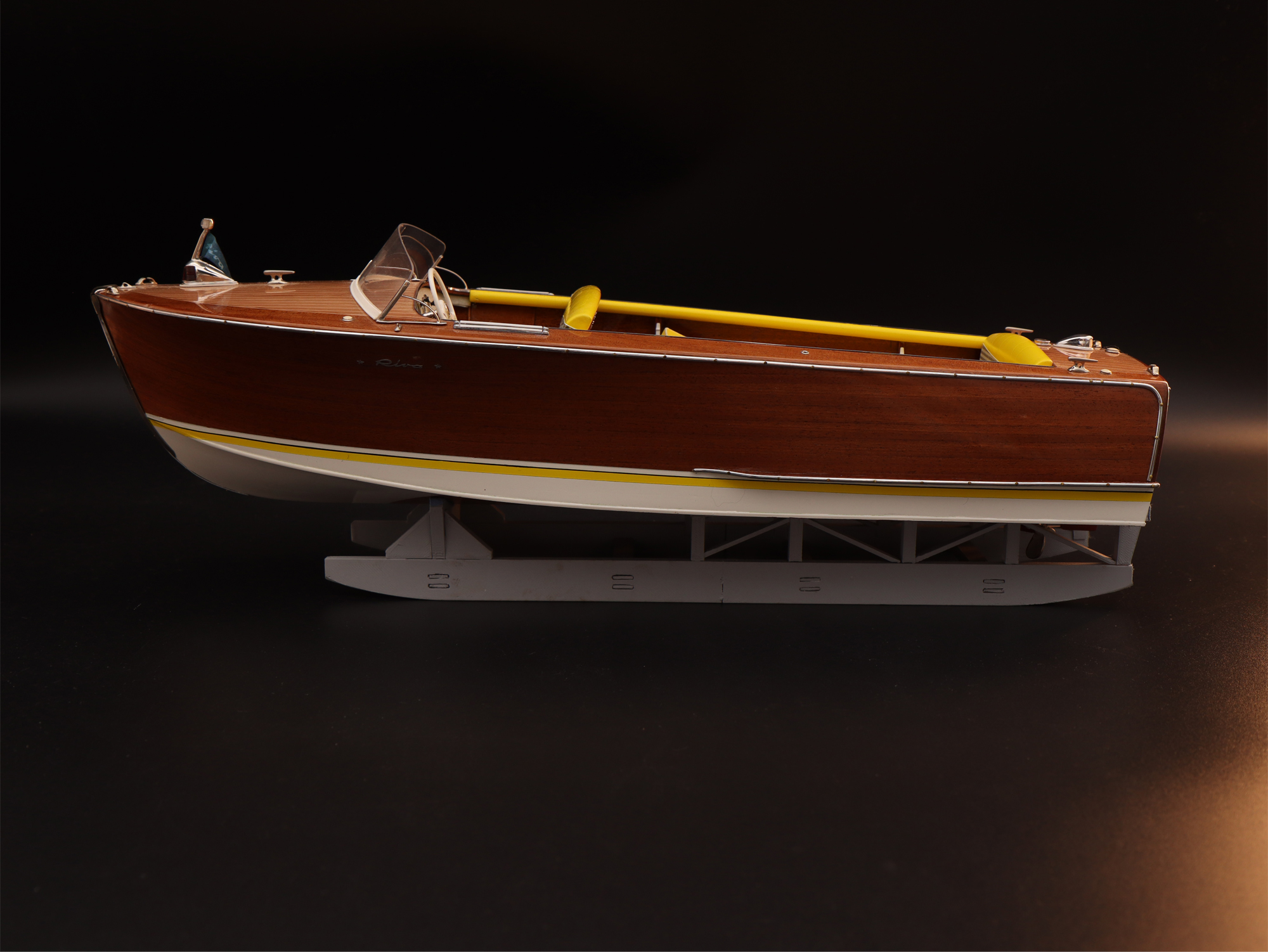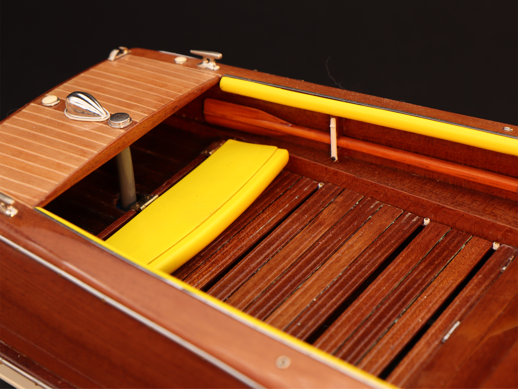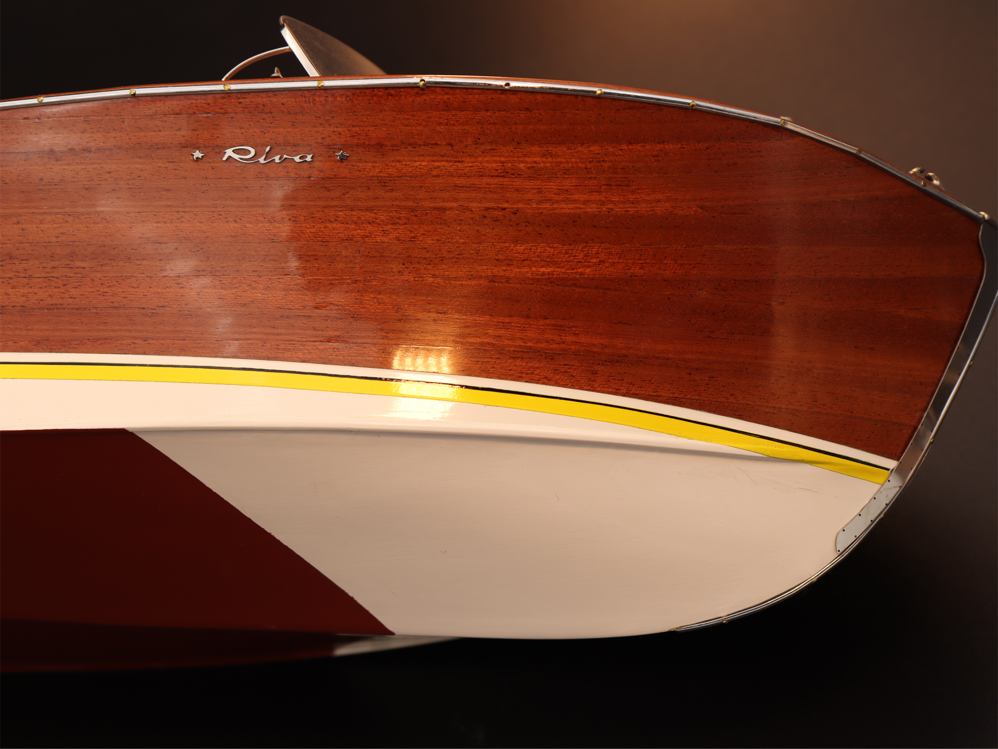 This was the first boat designed exclusively for series production using a 60 Hp Chris-Craft engine. It was built using Honduras mahogany planking throughout. It was originally made with a two-part frameless glass windscreen, dark green vinyl dashboard and seating, an article holder under the deck and a green fabric sunbed. From the 1953 series the inner panels were lined with padded green vinyl and the windscreen was in a single piece. The number of frames was increased in 1955 and their centre distance set at 16 cm. A new steering box made of bronze with stainless steel parts and a Monel propeller shaft were fitted. The side planking was installed with the aid of adhesives. The bottom was fitted using corrosion resistant Phillips cross-head screws. From # 98, at the end of 1956, the bottom was a single piece of plywood and, from 101, the decking was also made of plywood, with inlaid veneers. The 1957 series is also typified by the wrap-around glass windscreen.