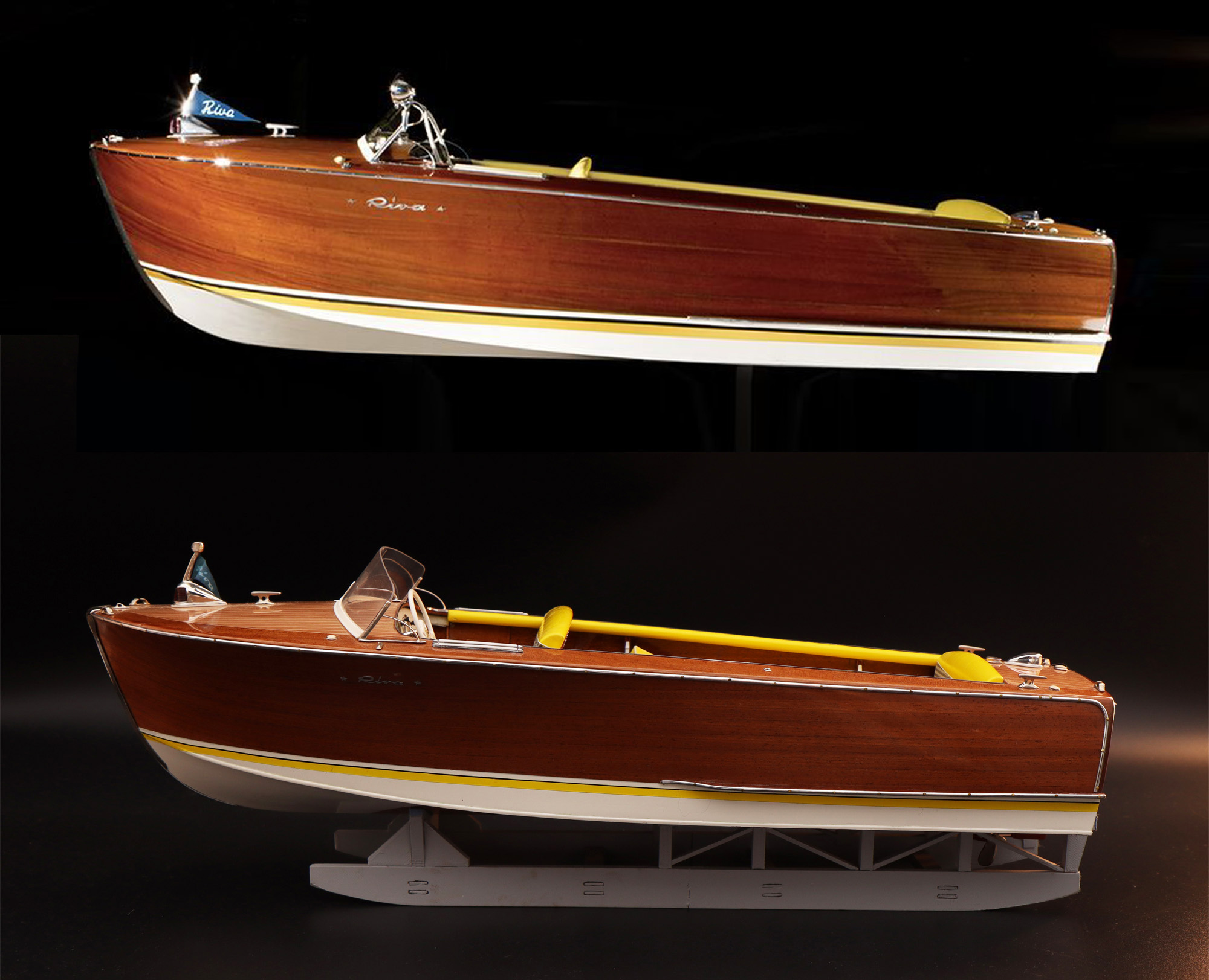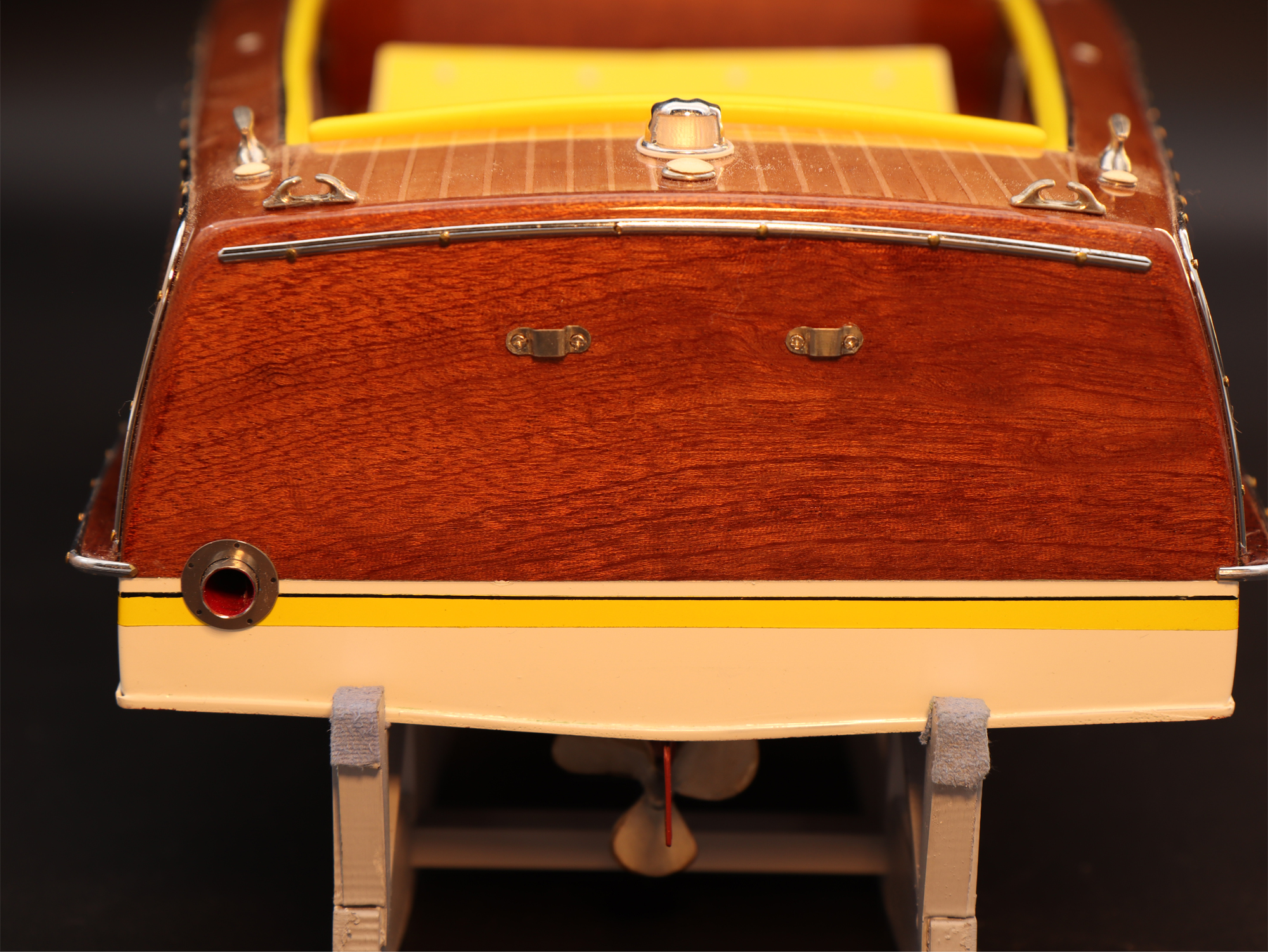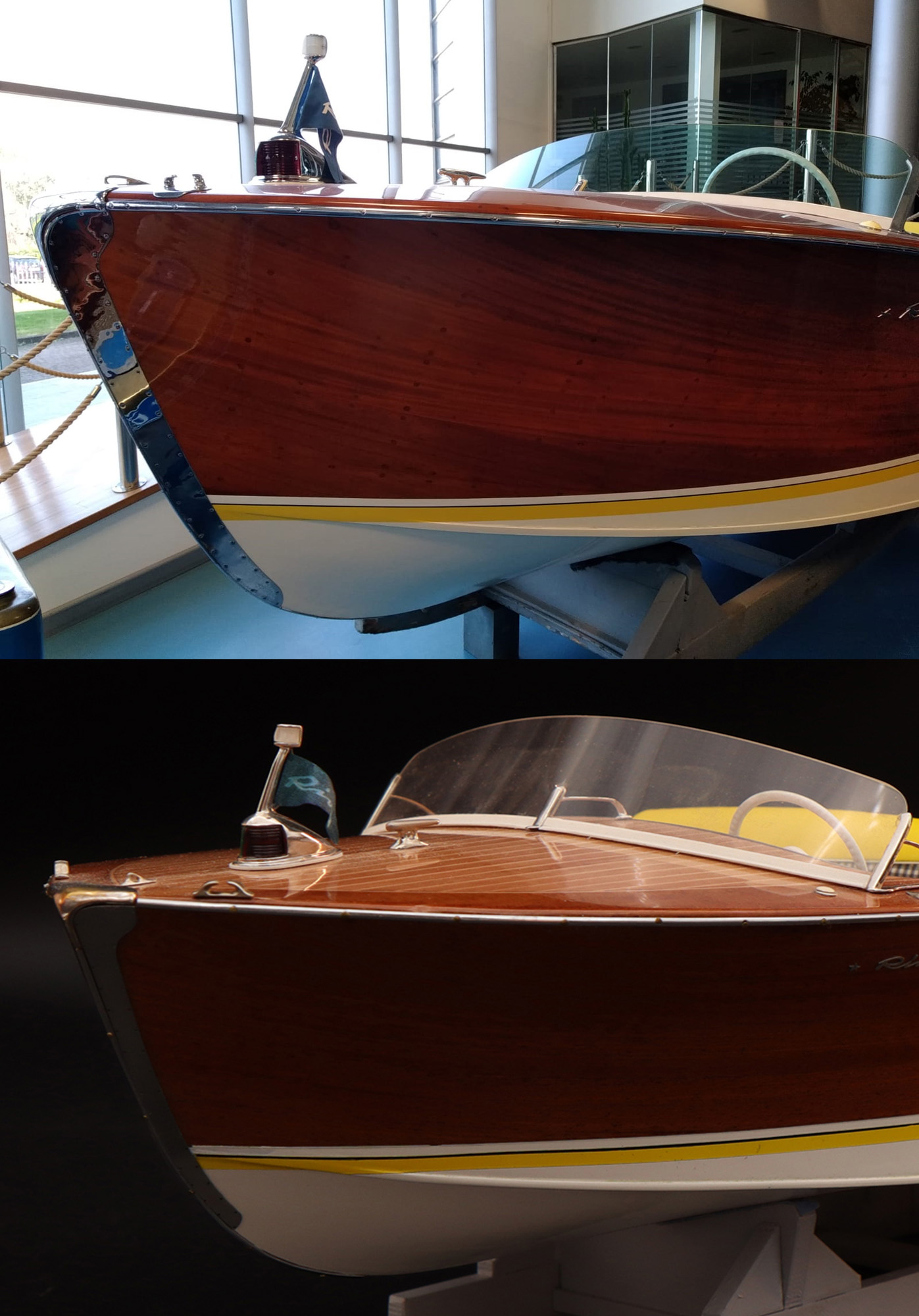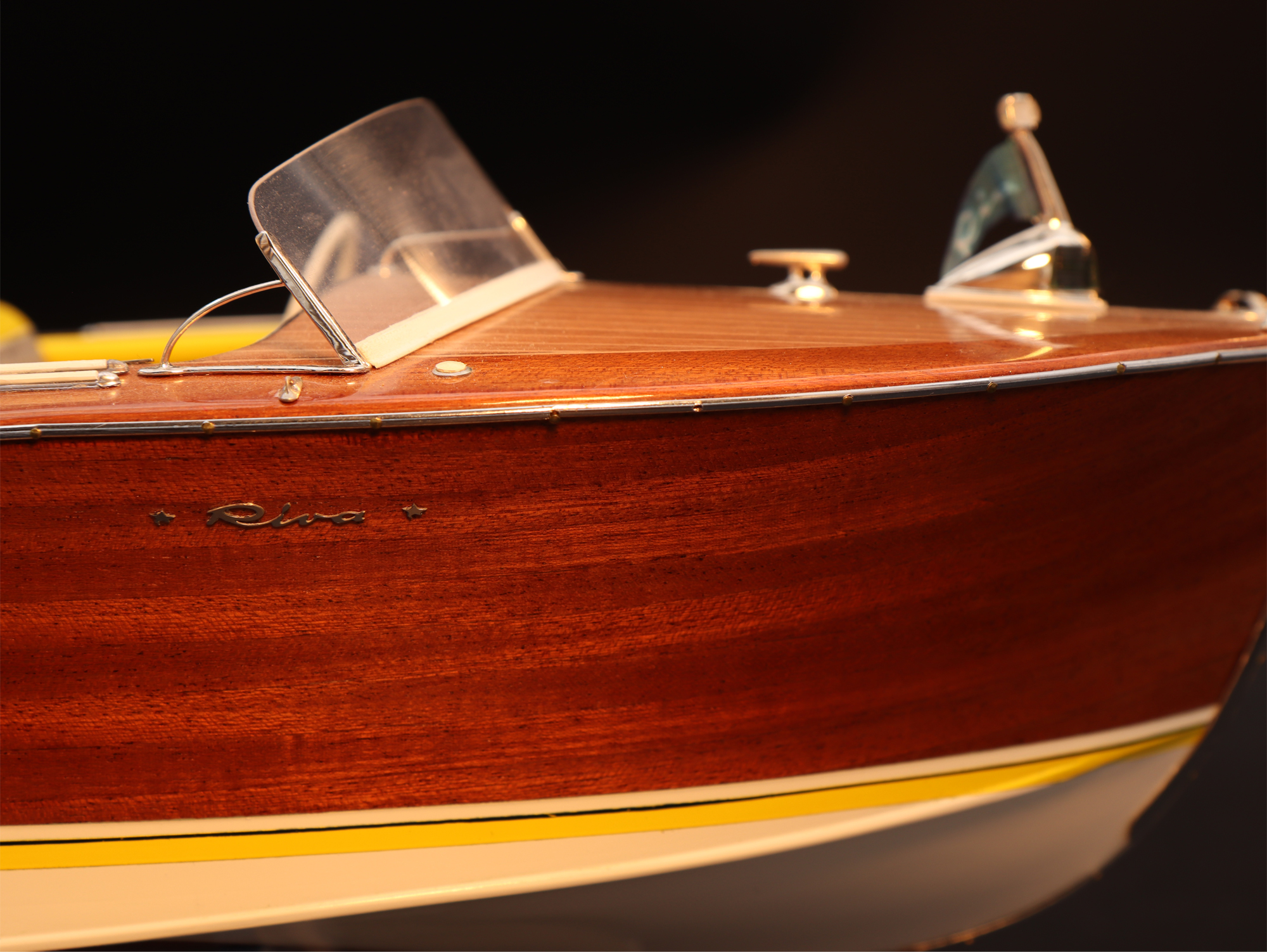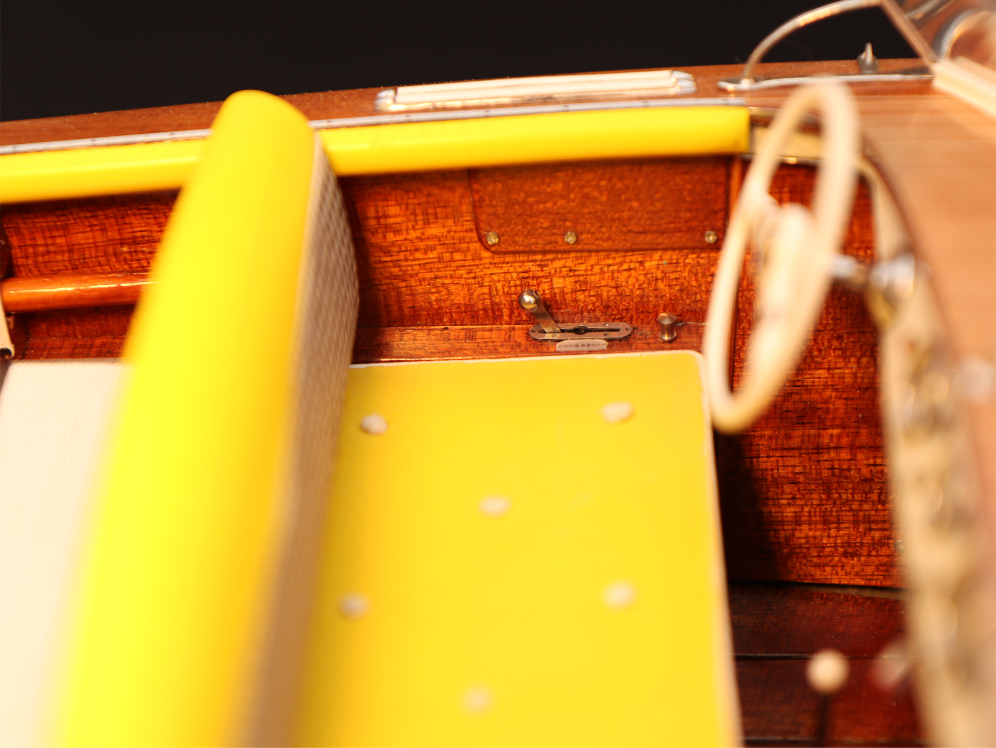 This was the first boat designed exclusively for series production using a 60 Hp Chris-Craft engine. It was built using Honduras mahogany planking throughout. It was originally made with a two-part frameless glass windscreen, dark green vinyl dashboard and seating, an article holder under the deck and a green fabric sunbed. From the 1953 series the inner panels were lined with padded green vinyl and the windscreen was in a single piece. The number of frames was increased in 1955 and their centre distance set at 16 cm. A new steering box made of bronze with stainless steel parts and a Monel propeller shaft were fitted. The side planking was installed with the aid of adhesives. The bottom was fitted using corrosion resistant Phillips cross-head screws. From # 98, at the end of 1956, the bottom was a single piece of plywood and, from 101, the decking was also made of plywood, with inlaid veneers. The 1957 series is also typified by the wrap-around glass windscreen.