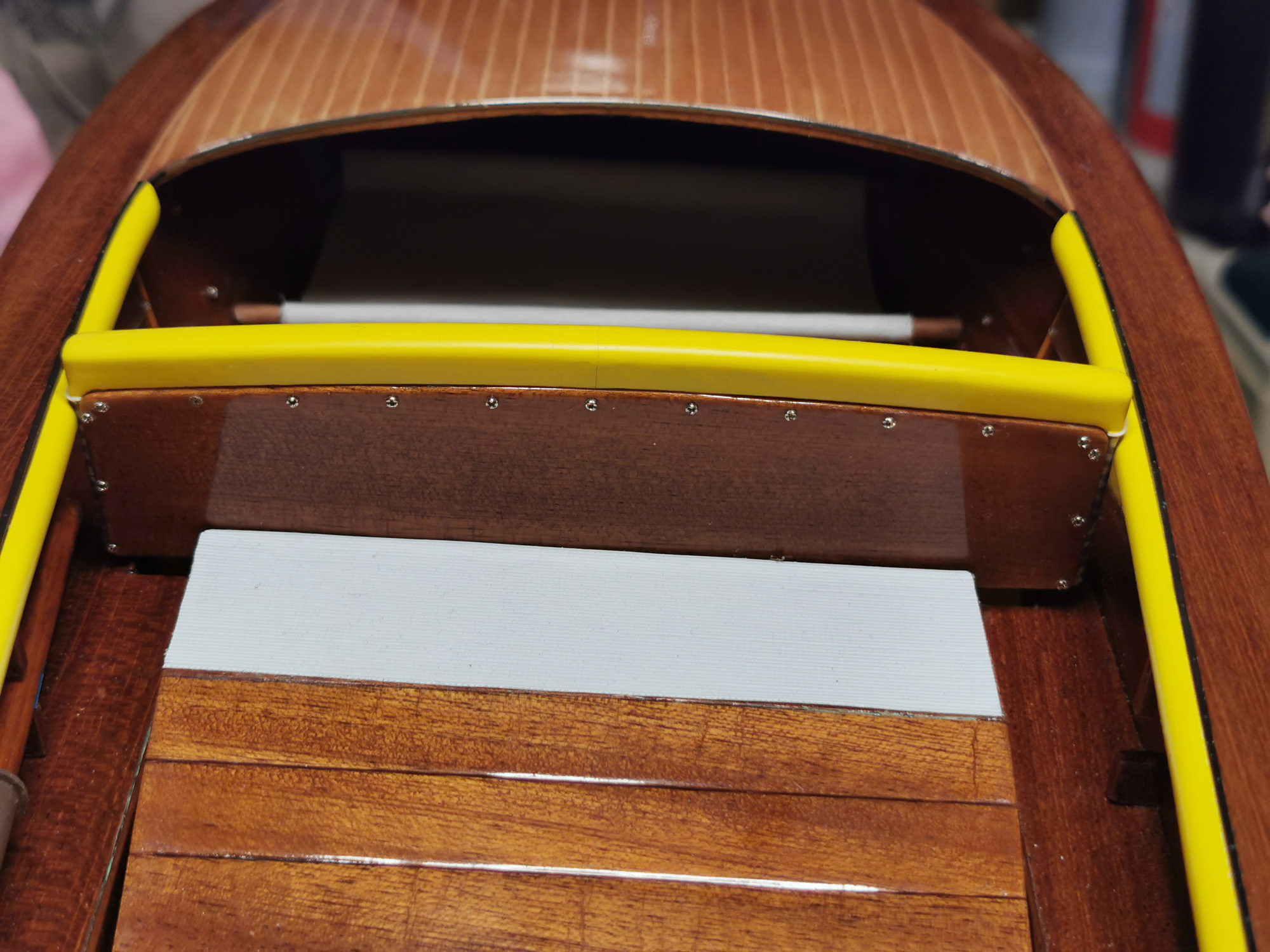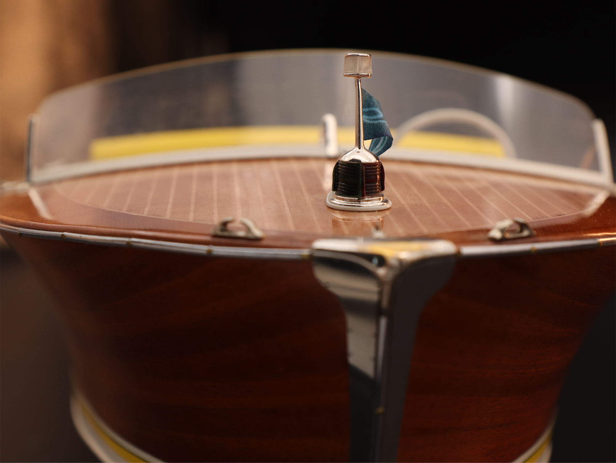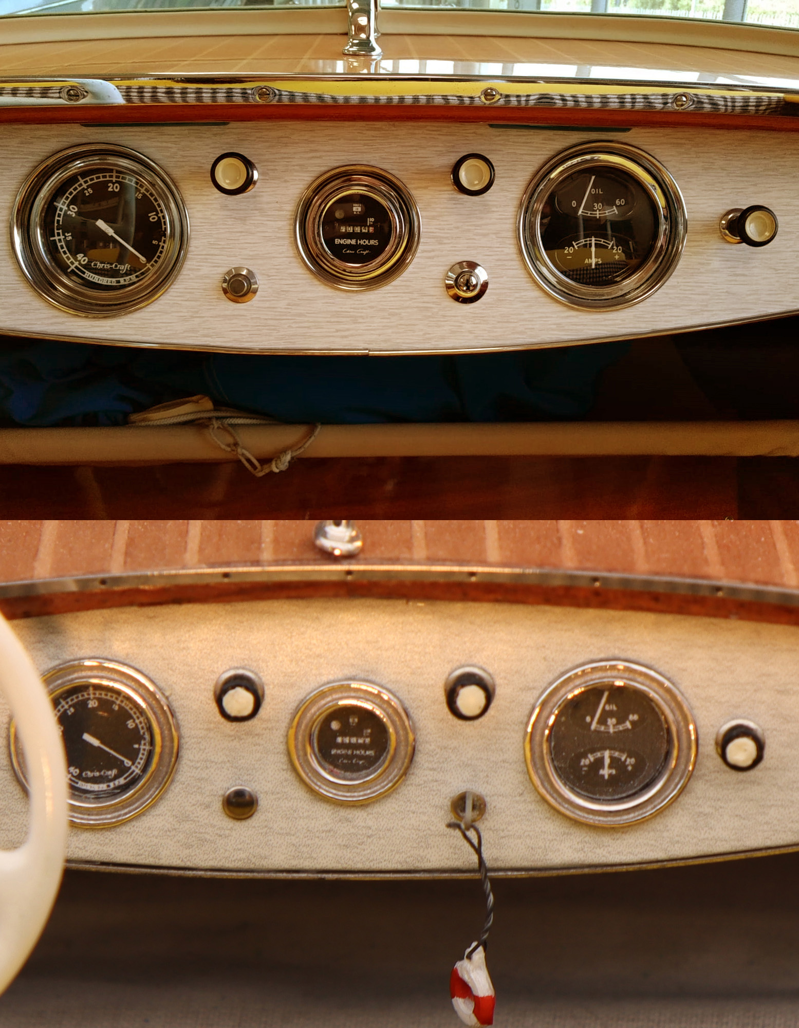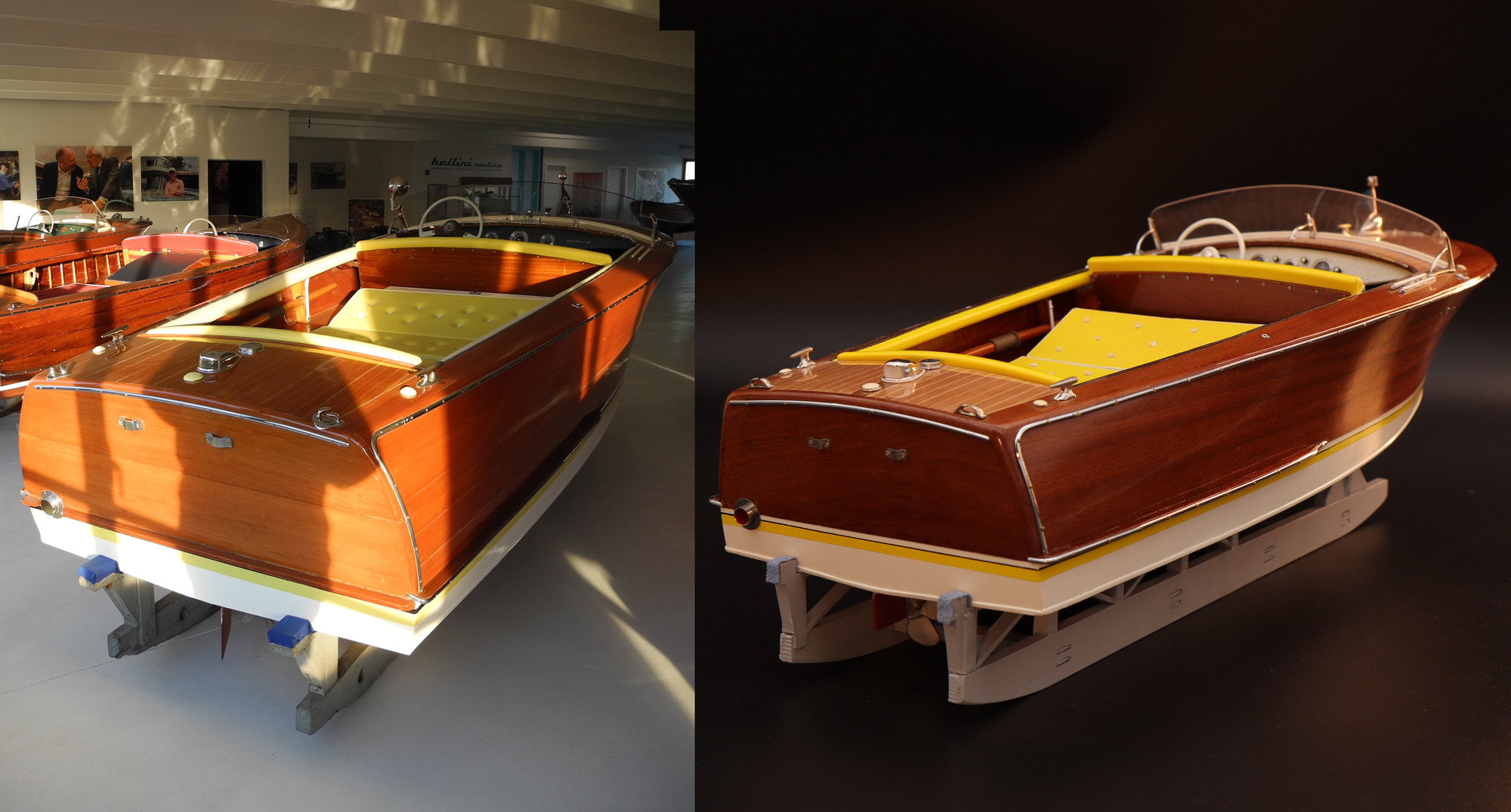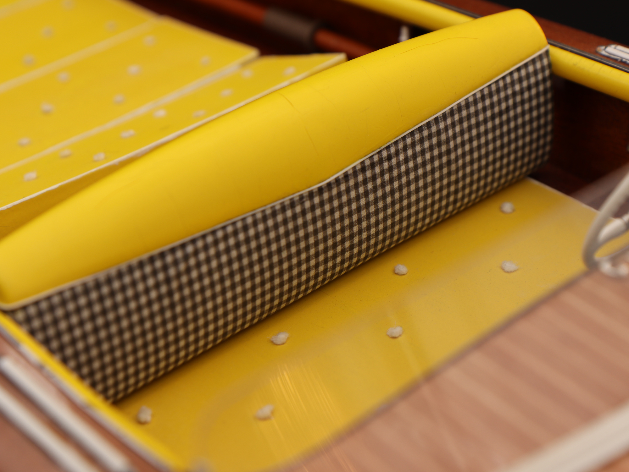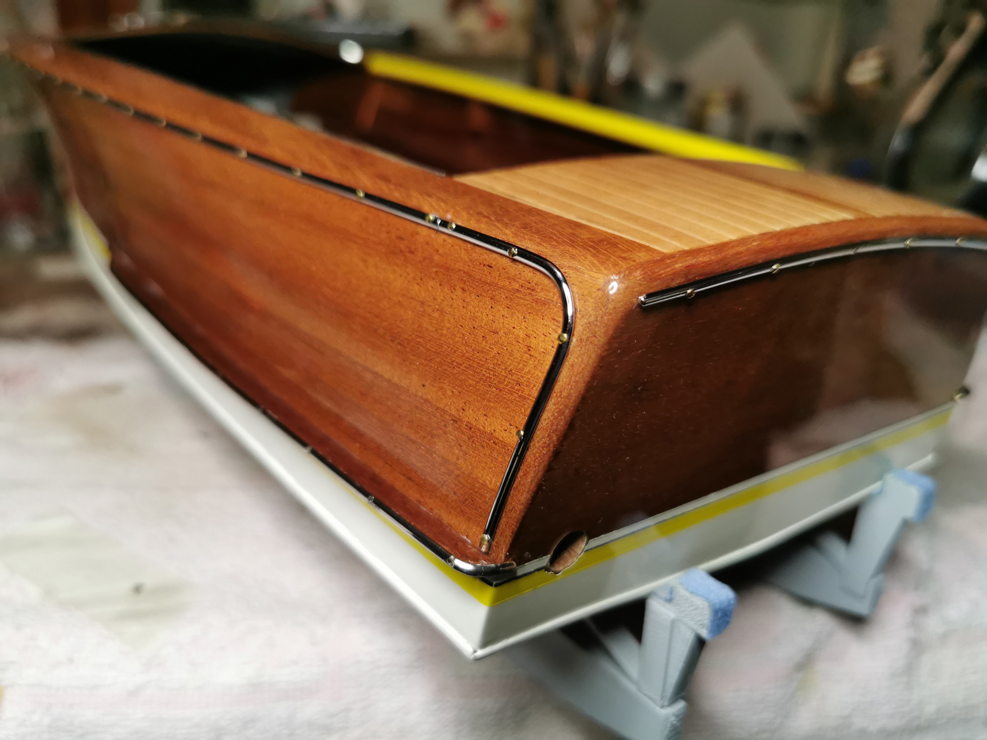 This was the first boat designed exclusively for series production using a 60 Hp Chris-Craft engine. It was built using Honduras mahogany planking throughout. It was originally made with a two-part frameless glass windscreen, dark green vinyl dashboard and seating, an article holder under the deck and a green fabric sunbed. From the 1953 series the inner panels were lined with padded green vinyl and the windscreen was in a single piece. The number of frames was increased in 1955 and their centre distance set at 16 cm. A new steering box made of bronze with stainless steel parts and a Monel propeller shaft were fitted. The side planking was installed with the aid of adhesives. The bottom was fitted using corrosion resistant Phillips cross-head screws. From # 98, at the end of 1956, the bottom was a single piece of plywood and, from 101, the decking was also made of plywood, with inlaid veneers. The 1957 series is also typified by the wrap-around glass windscreen.