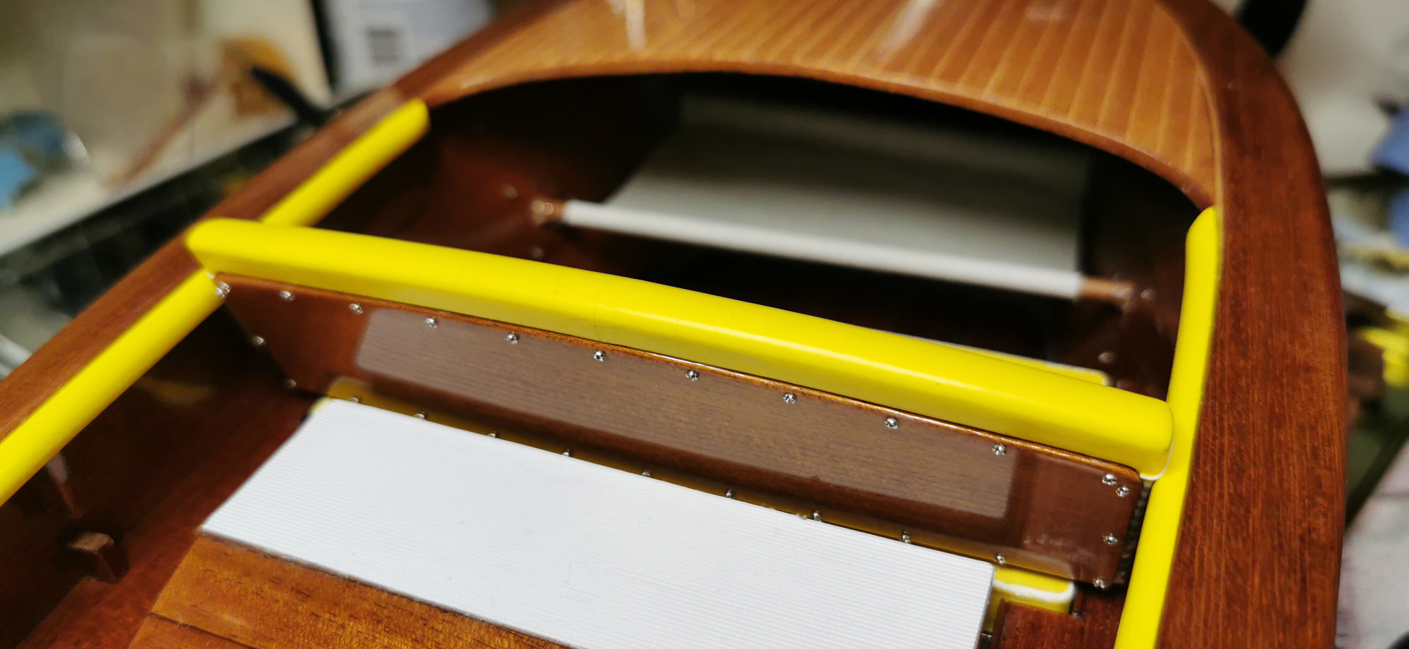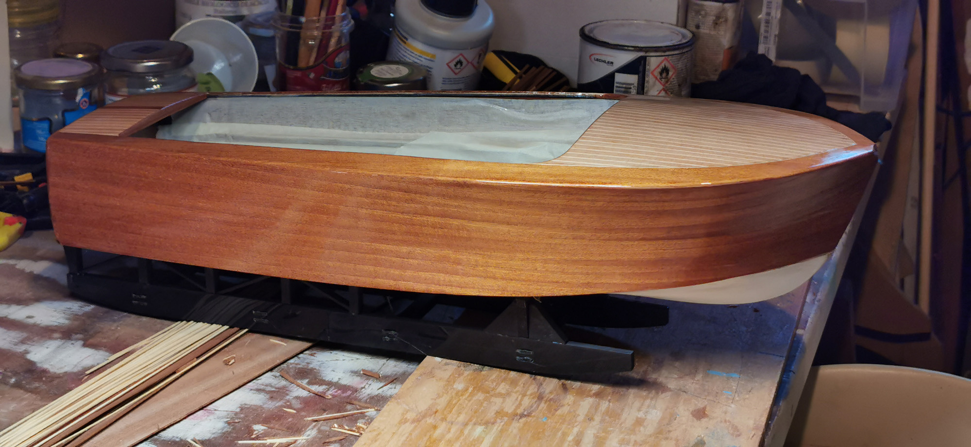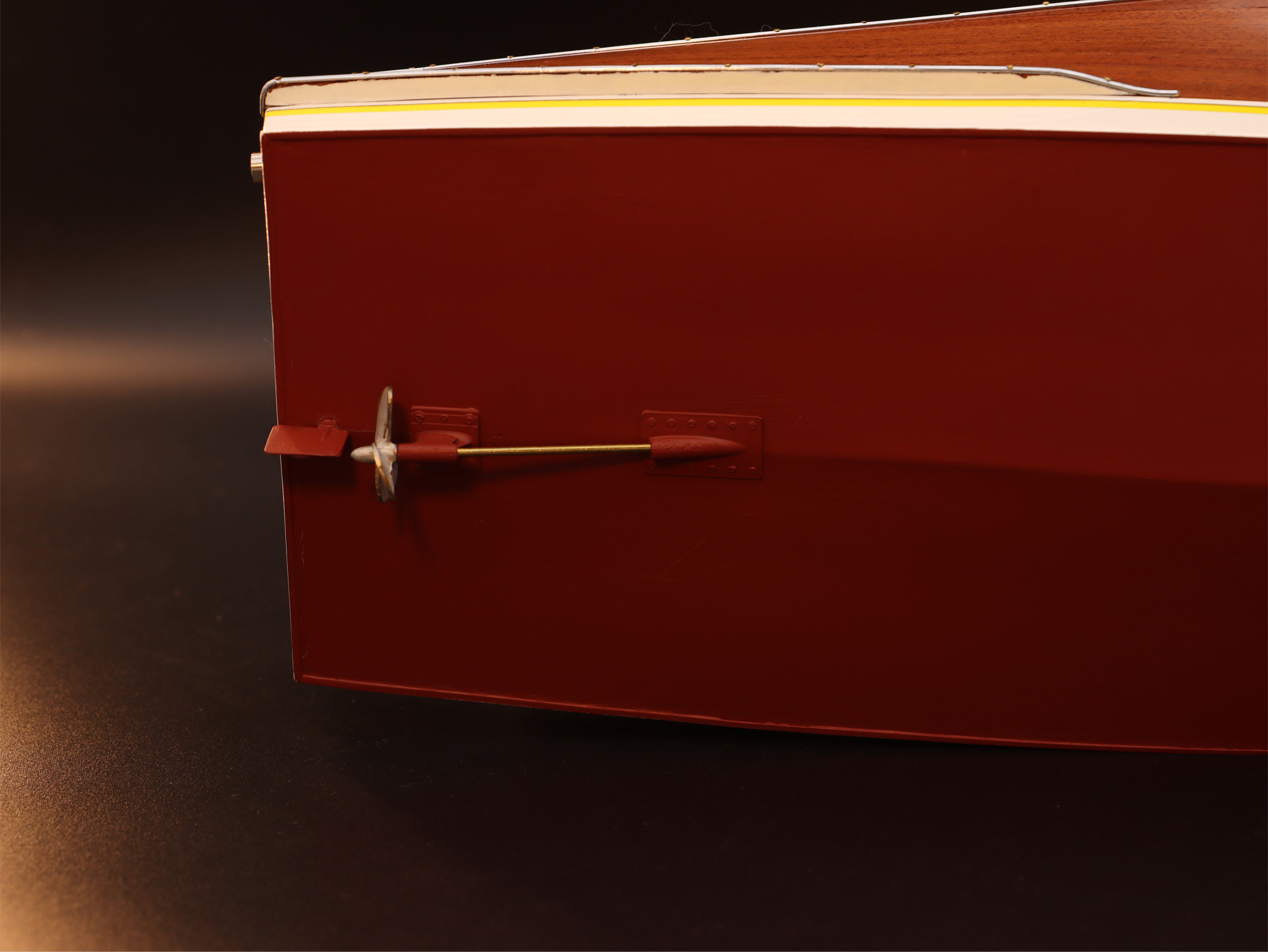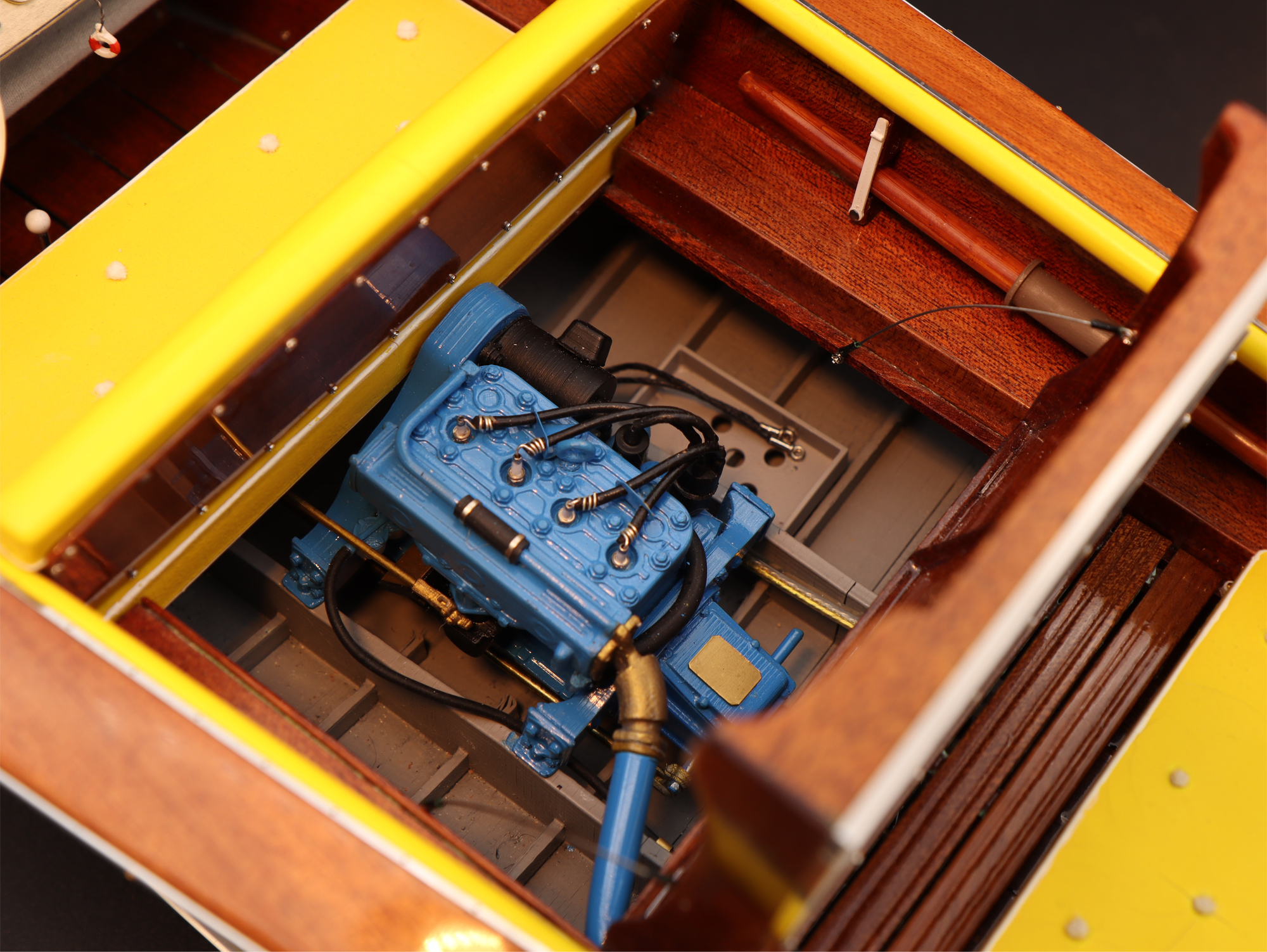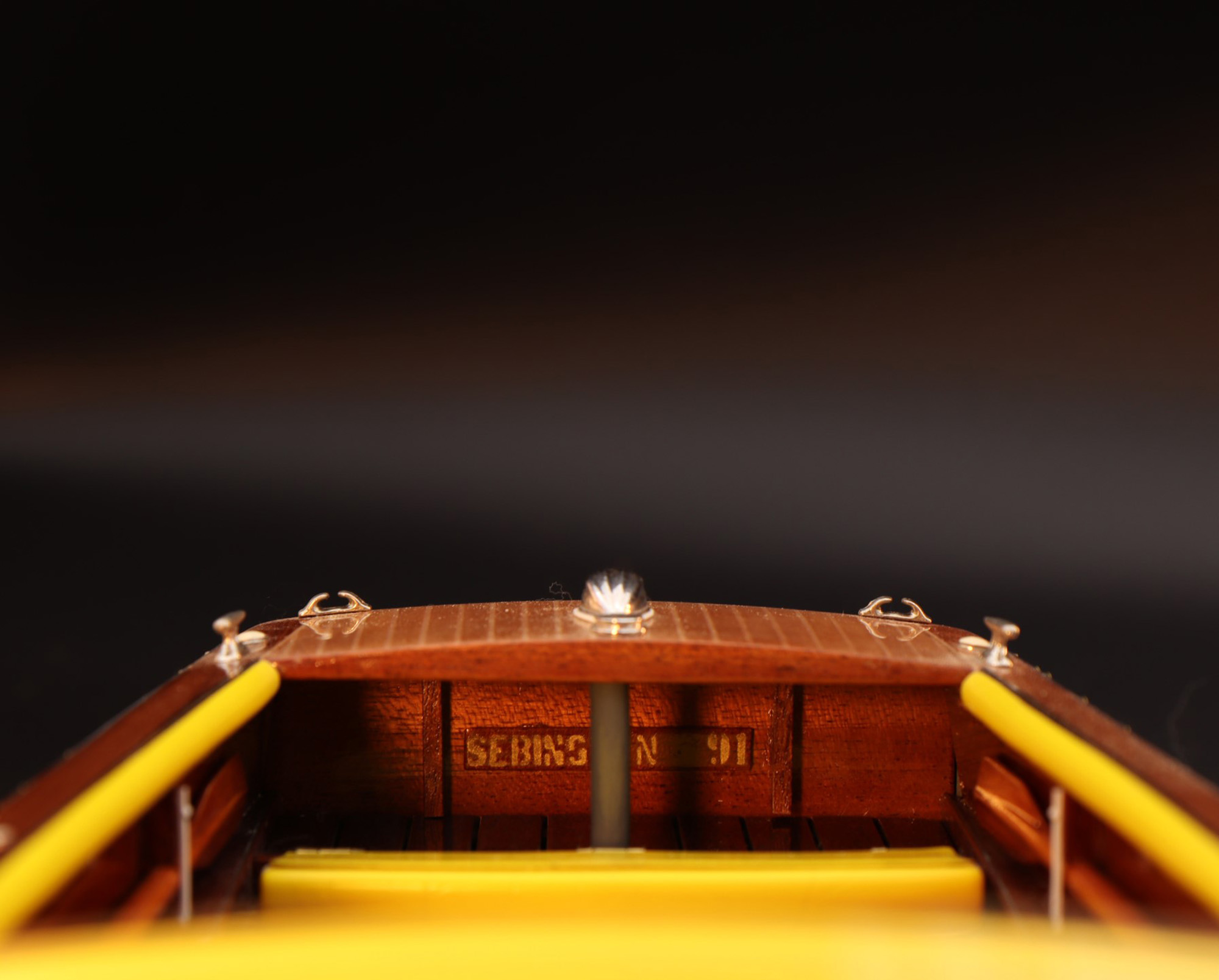 This was the first boat designed exclusively for series production using a 60 Hp Chris-Craft engine. It was built using Honduras mahogany planking throughout. It was originally made with a two-part frameless glass windscreen, dark green vinyl dashboard and seating, an article holder under the deck and a green fabric sunbed. From the 1953 series the inner panels were lined with padded green vinyl and the windscreen was in a single piece. The number of frames was increased in 1955 and their centre distance set at 16 cm. A new steering box made of bronze with stainless steel parts and a Monel propeller shaft were fitted. The side planking was installed with the aid of adhesives. The bottom was fitted using corrosion resistant Phillips cross-head screws. From # 98, at the end of 1956, the bottom was a single piece of plywood and, from 101, the decking was also made of plywood, with inlaid veneers. The 1957 series is also typified by the wrap-around glass windscreen.