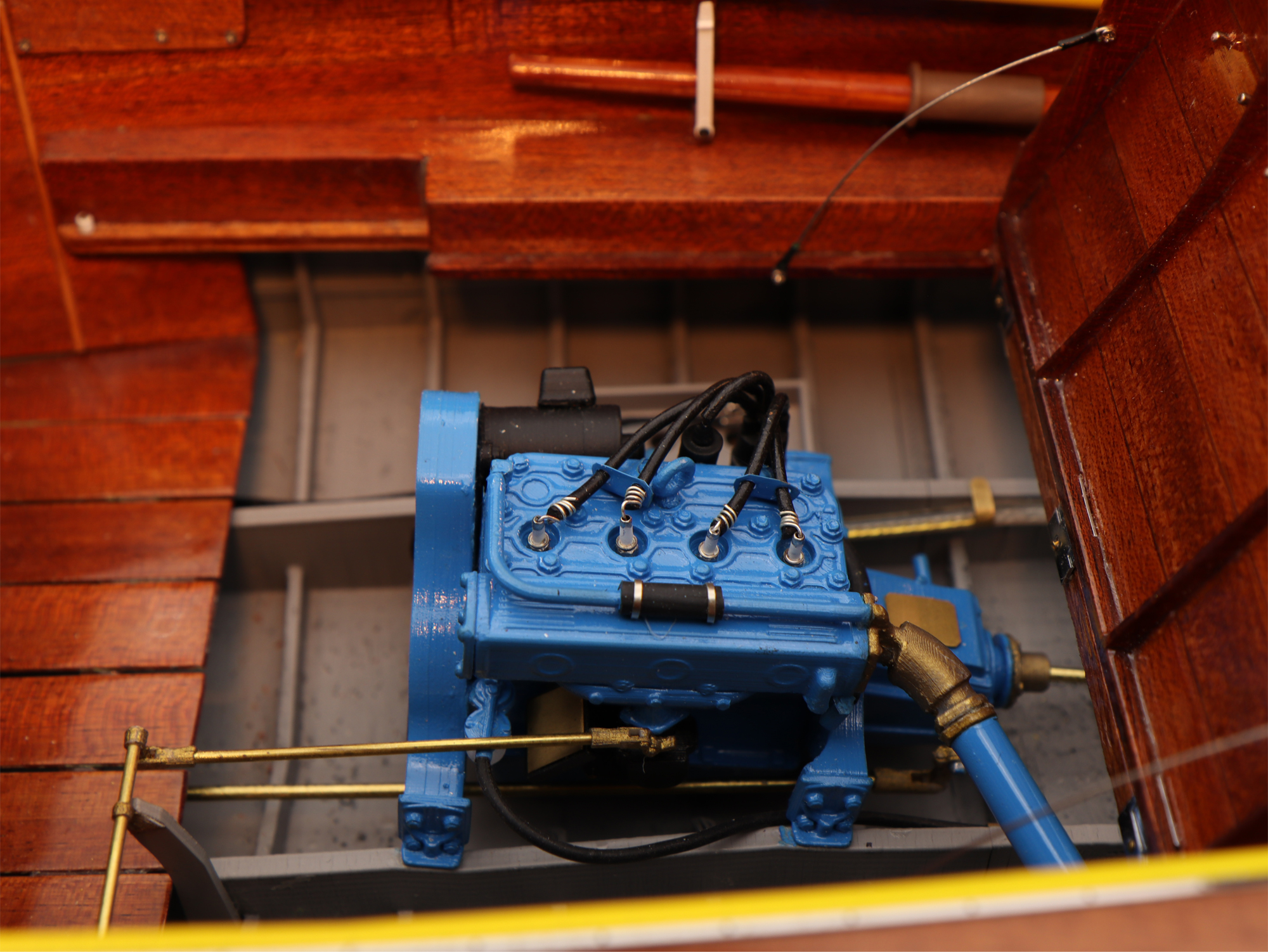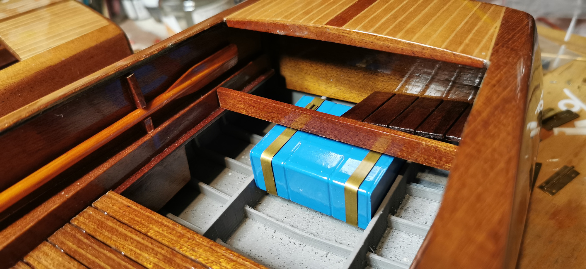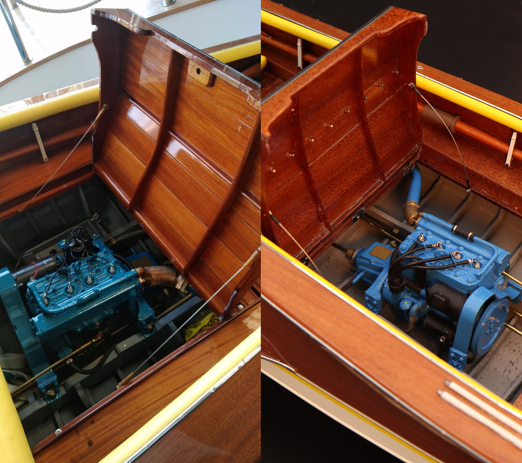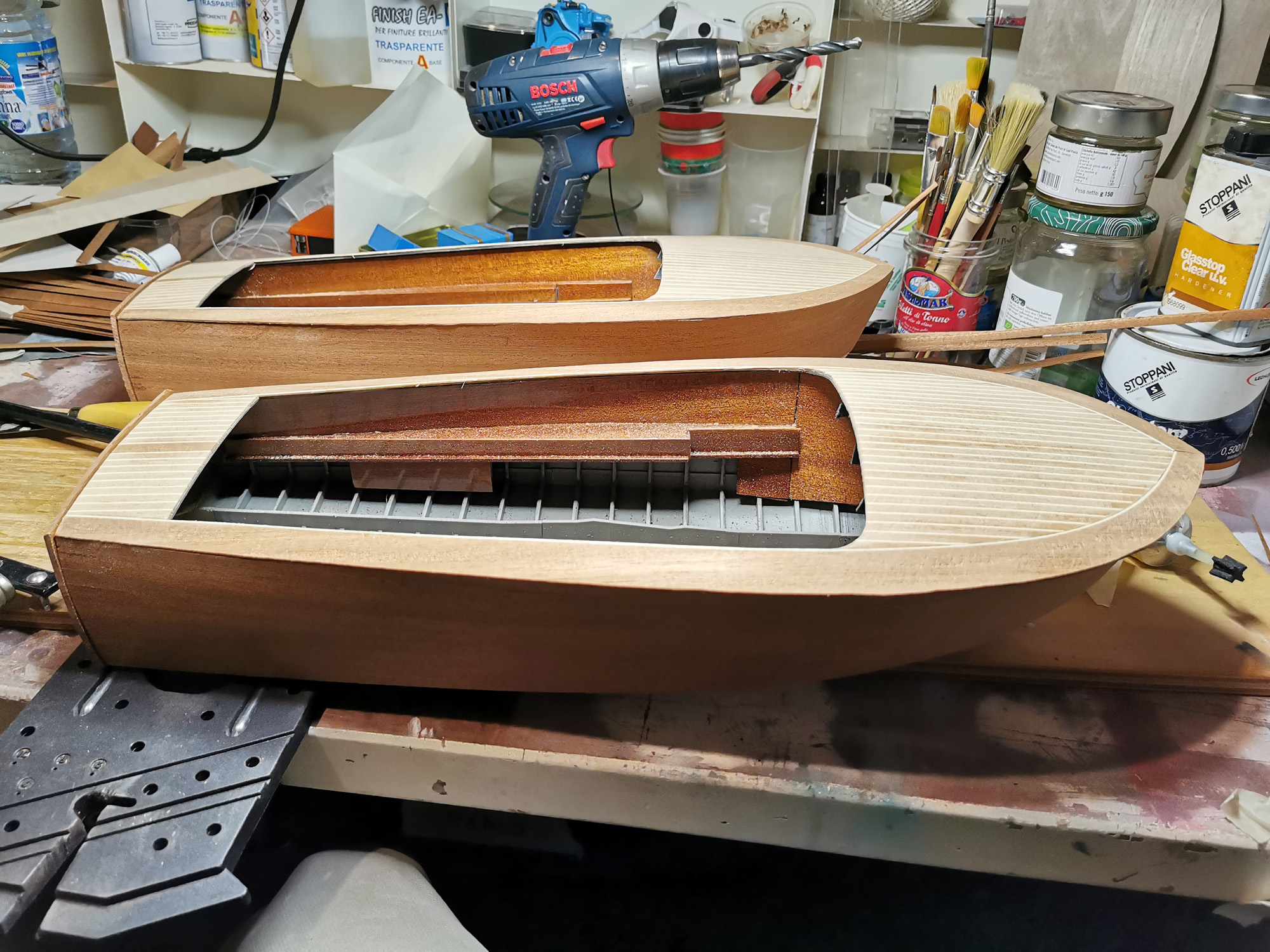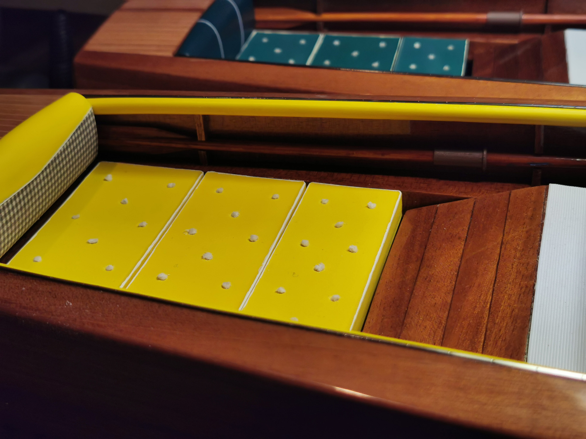 This was the first boat designed exclusively for series production using a 60 Hp Chris-Craft engine. It was built using Honduras mahogany planking throughout. It was originally made with a two-part frameless glass windscreen, dark green vinyl dashboard and seating, an article holder under the deck and a green fabric sunbed. From the 1953 series the inner panels were lined with padded green vinyl and the windscreen was in a single piece. The number of frames was increased in 1955 and their centre distance set at 16 cm. A new steering box made of bronze with stainless steel parts and a Monel propeller shaft were fitted. The side planking was installed with the aid of adhesives. The bottom was fitted using corrosion resistant Phillips cross-head screws. From # 98, at the end of 1956, the bottom was a single piece of plywood and, from 101, the decking was also made of plywood, with inlaid veneers. The 1957 series is also typified by the wrap-around glass windscreen.