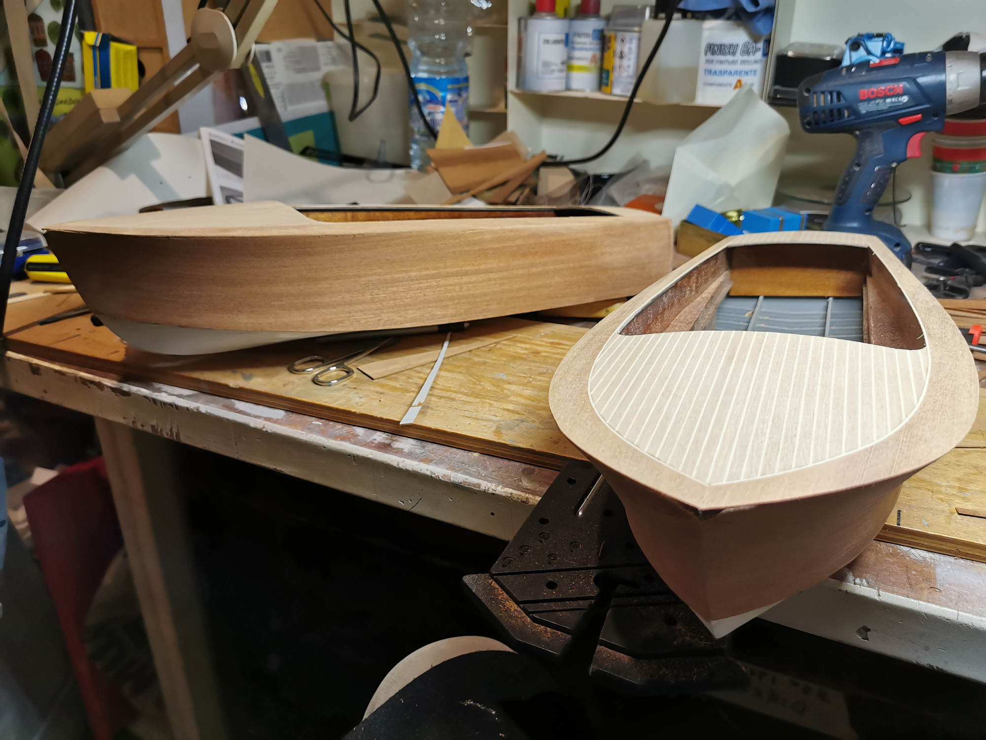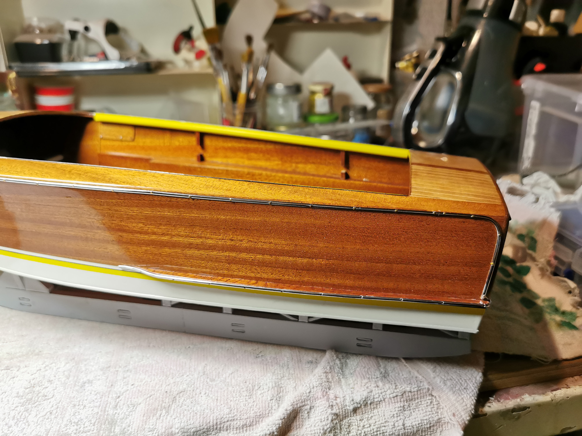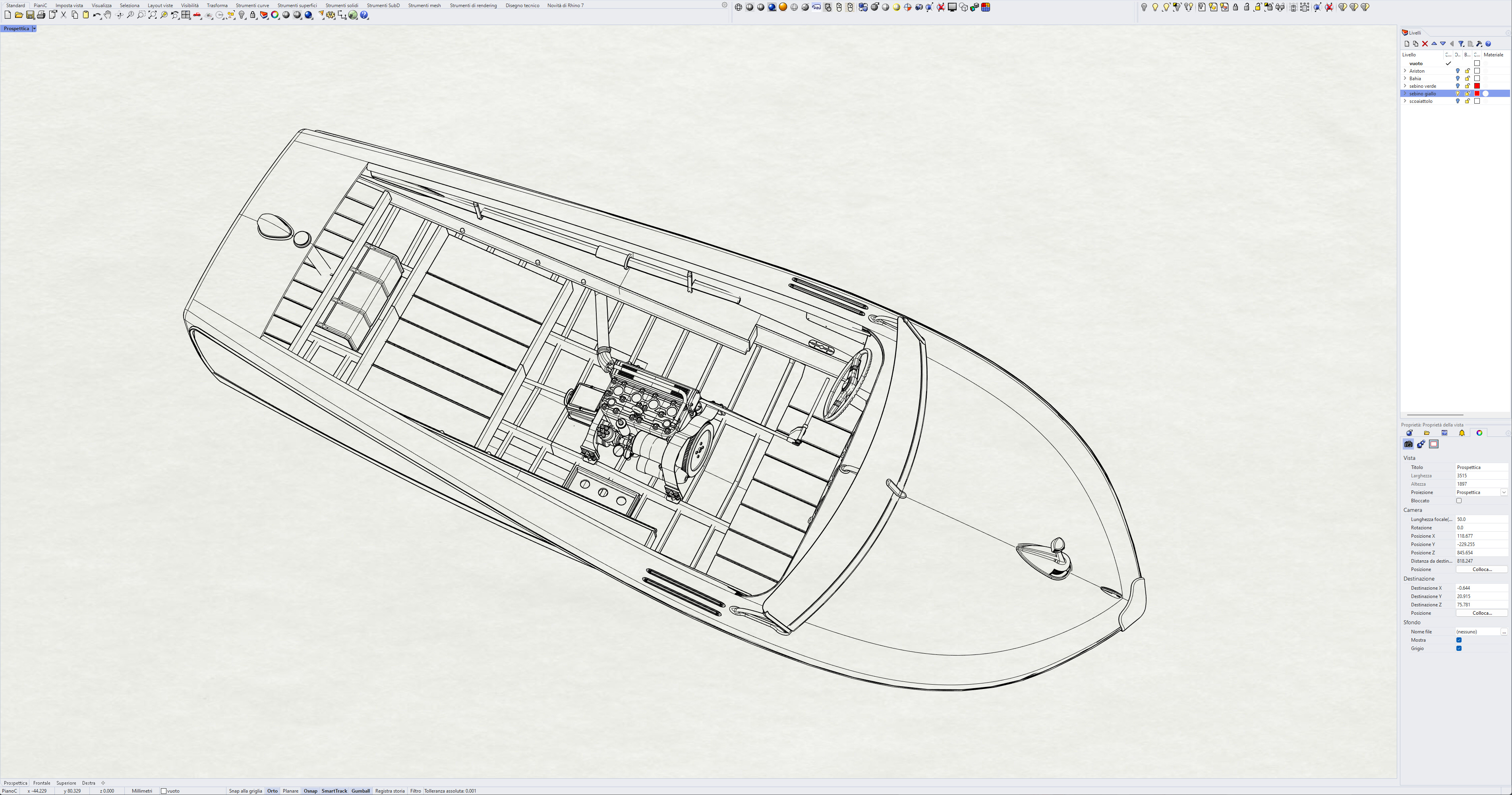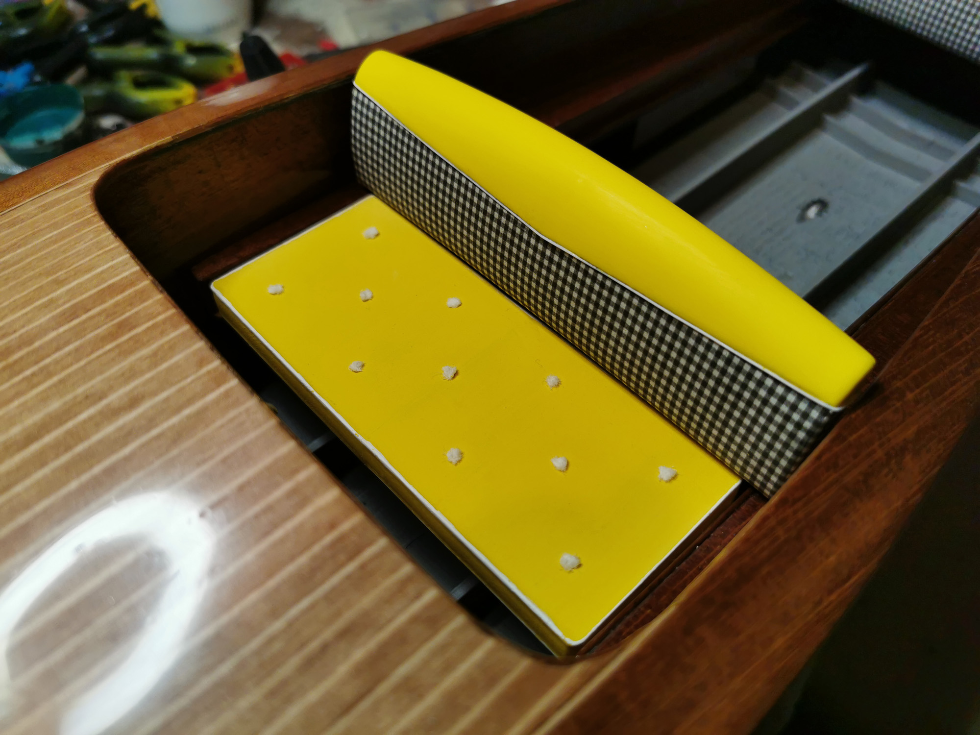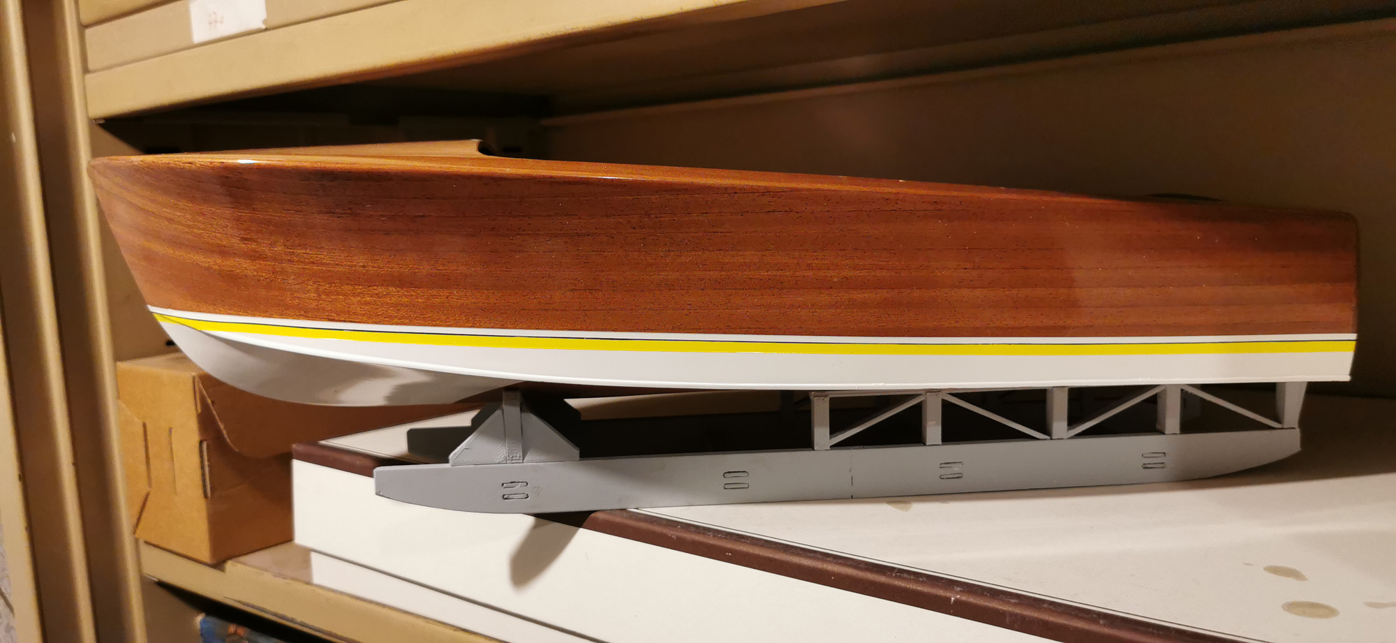 This was the first boat designed exclusively for series production using a 60 Hp Chris-Craft engine. It was built using Honduras mahogany planking throughout. It was originally made with a two-part frameless glass windscreen, dark green vinyl dashboard and seating, an article holder under the deck and a green fabric sunbed. From the 1953 series the inner panels were lined with padded green vinyl and the windscreen was in a single piece. The number of frames was increased in 1955 and their centre distance set at 16 cm. A new steering box made of bronze with stainless steel parts and a Monel propeller shaft were fitted. The side planking was installed with the aid of adhesives. The bottom was fitted using corrosion resistant Phillips cross-head screws. From # 98, at the end of 1956, the bottom was a single piece of plywood and, from 101, the decking was also made of plywood, with inlaid veneers. The 1957 series is also typified by the wrap-around glass windscreen.