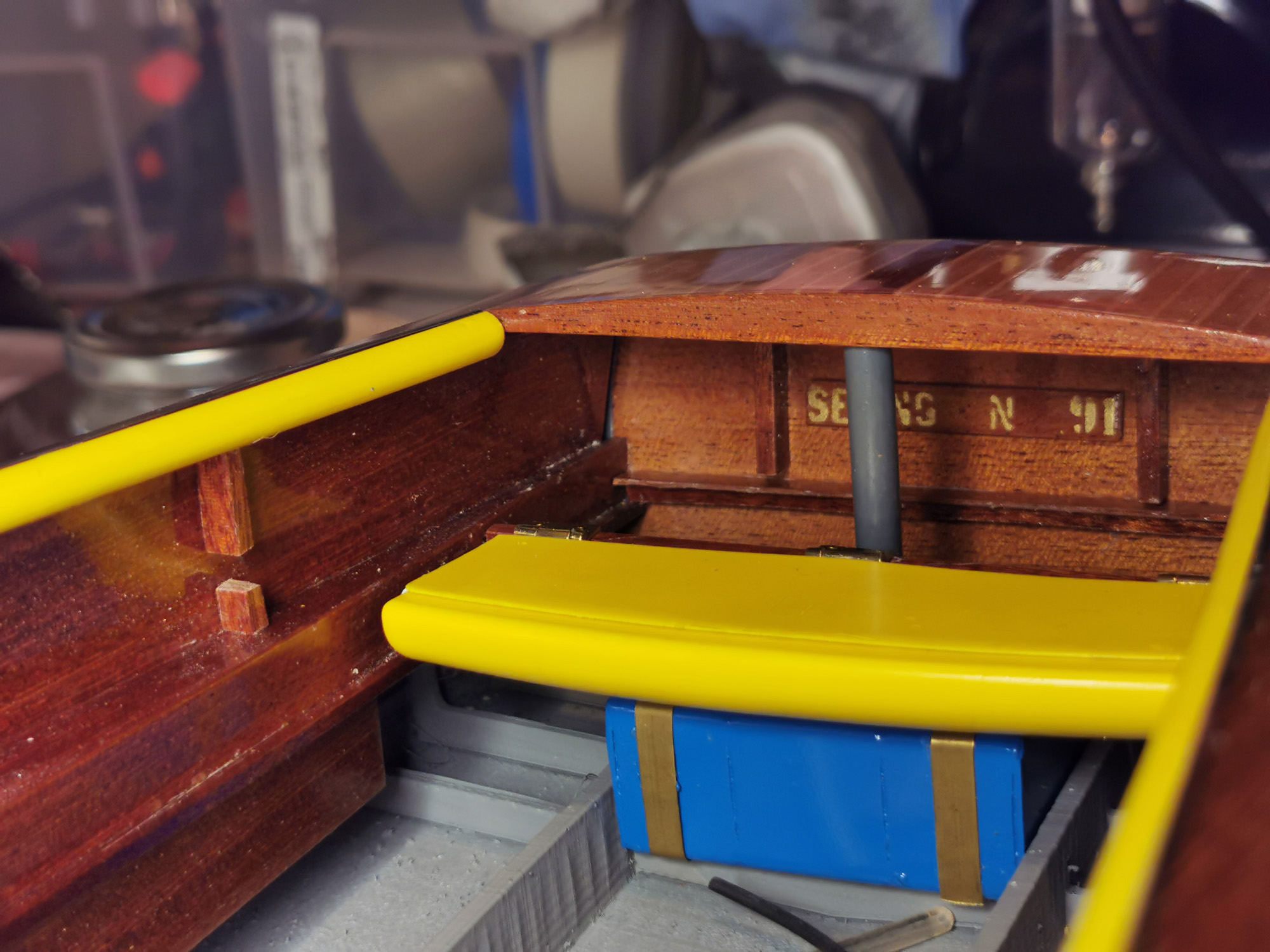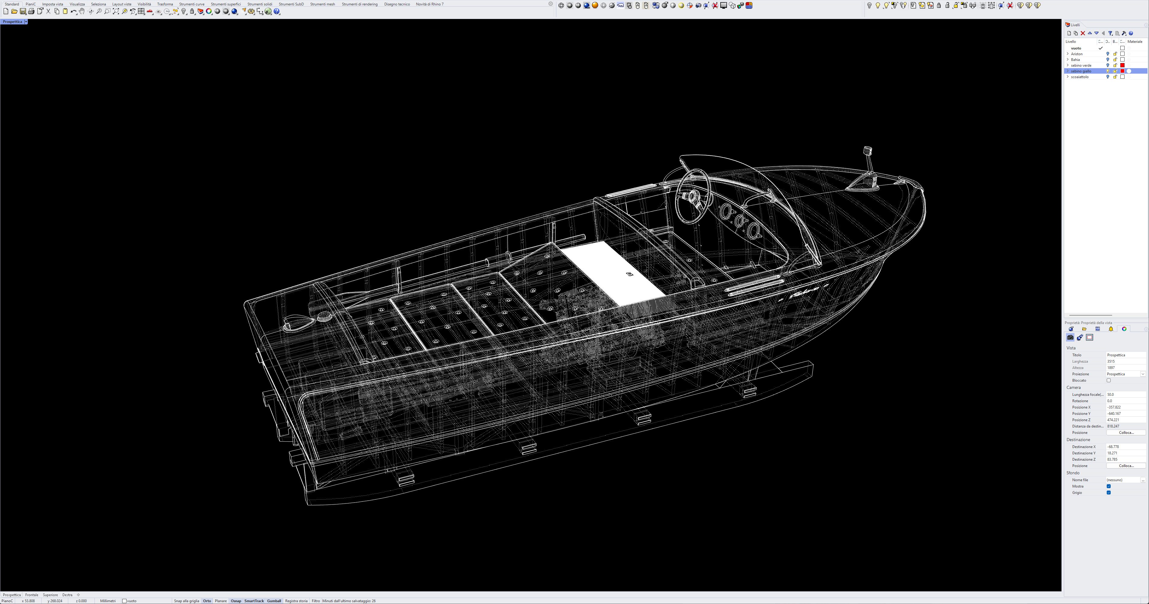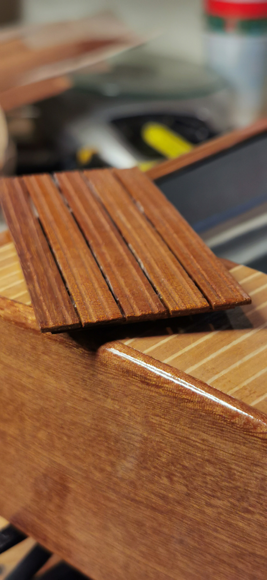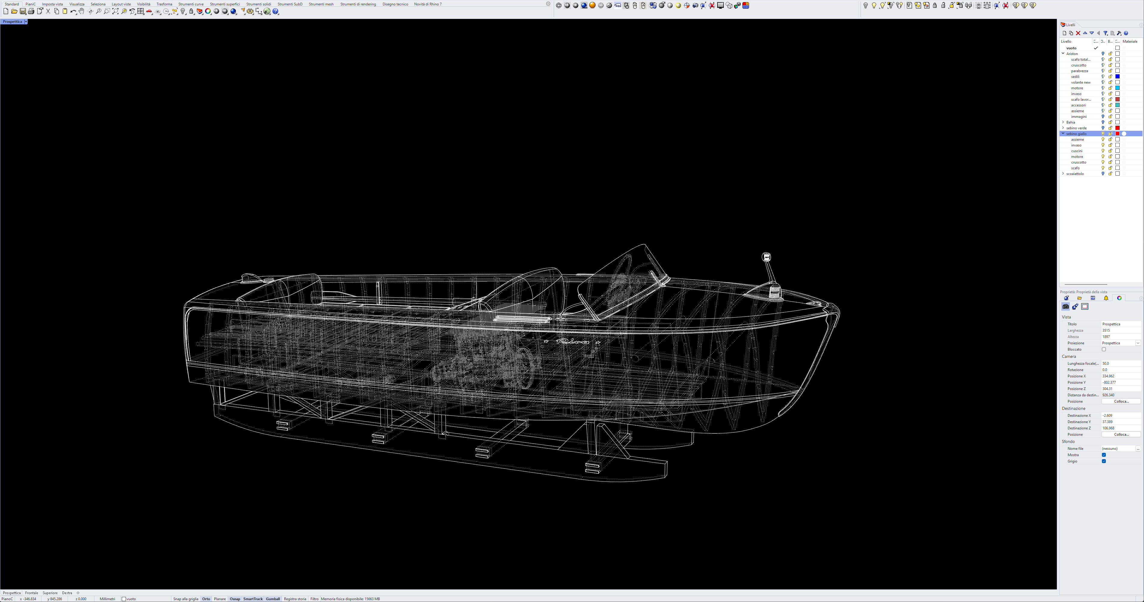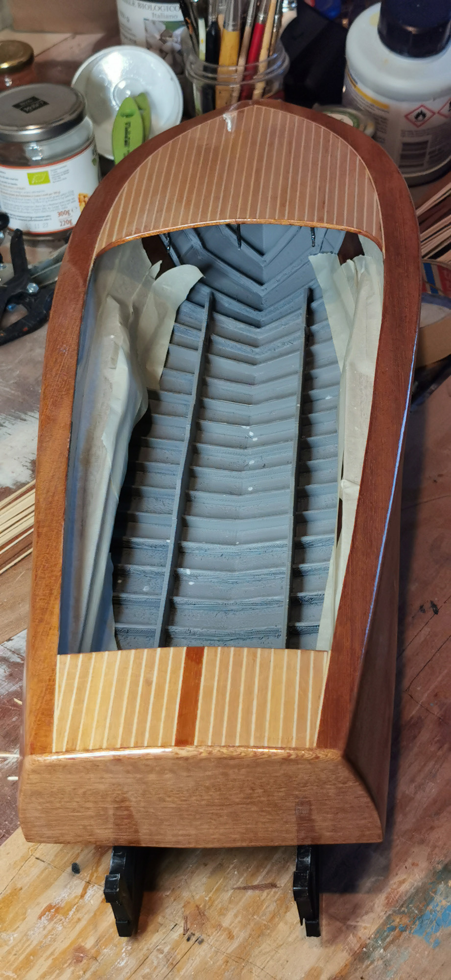 This was the first boat designed exclusively for series production using a 60 Hp Chris-Craft engine. It was built using Honduras mahogany planking throughout. It was originally made with a two-part frameless glass windscreen, dark green vinyl dashboard and seating, an article holder under the deck and a green fabric sunbed. From the 1953 series the inner panels were lined with padded green vinyl and the windscreen was in a single piece. The number of frames was increased in 1955 and their centre distance set at 16 cm. A new steering box made of bronze with stainless steel parts and a Monel propeller shaft were fitted. The side planking was installed with the aid of adhesives. The bottom was fitted using corrosion resistant Phillips cross-head screws. From # 98, at the end of 1956, the bottom was a single piece of plywood and, from 101, the decking was also made of plywood, with inlaid veneers. The 1957 series is also typified by the wrap-around glass windscreen.